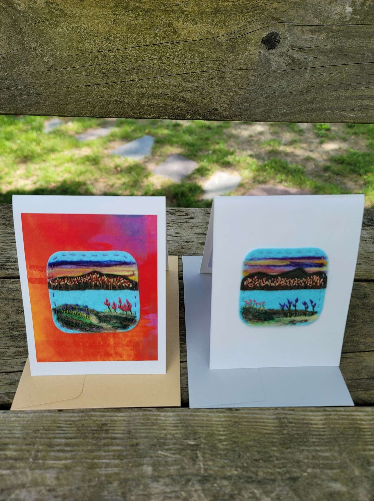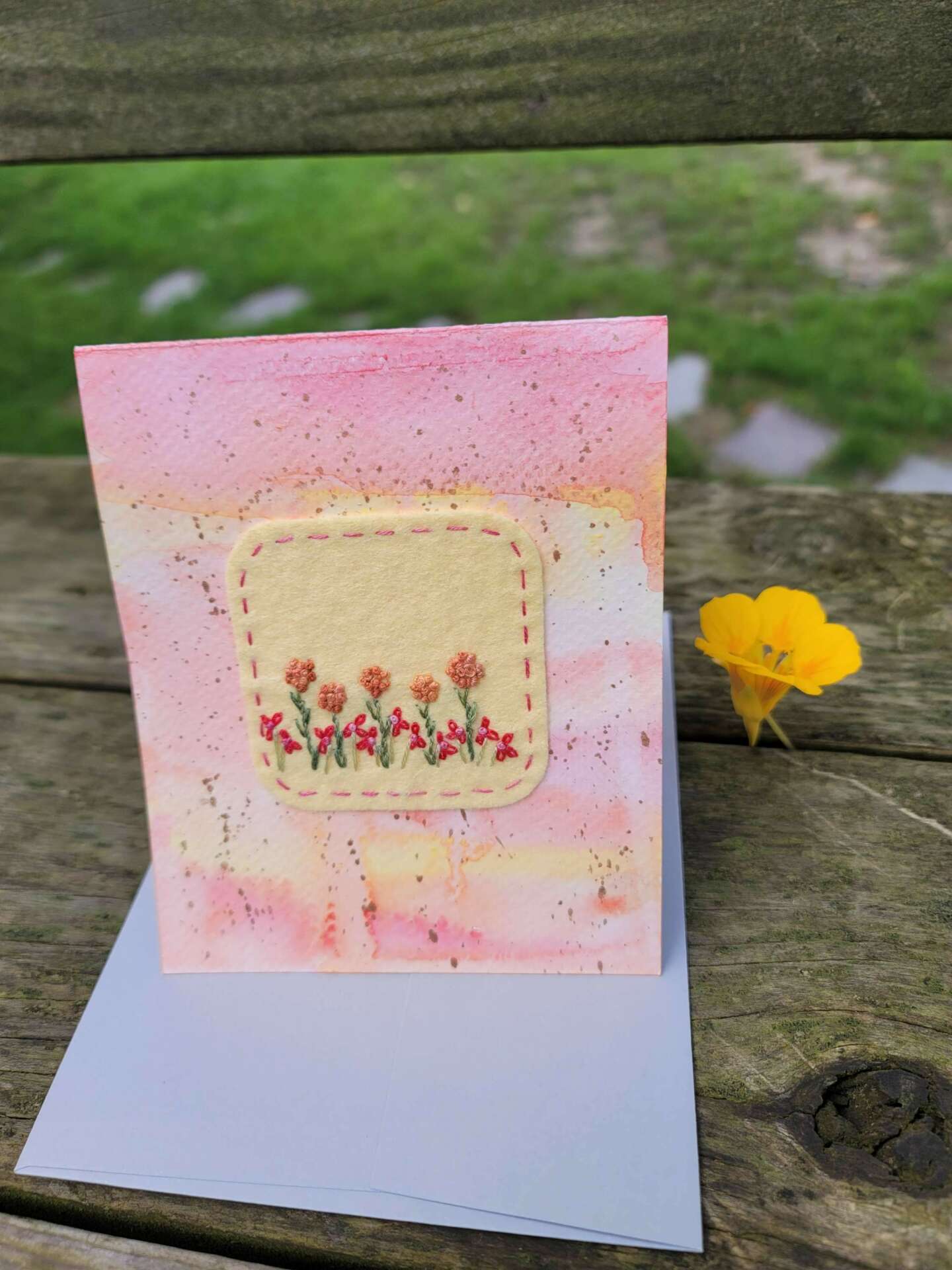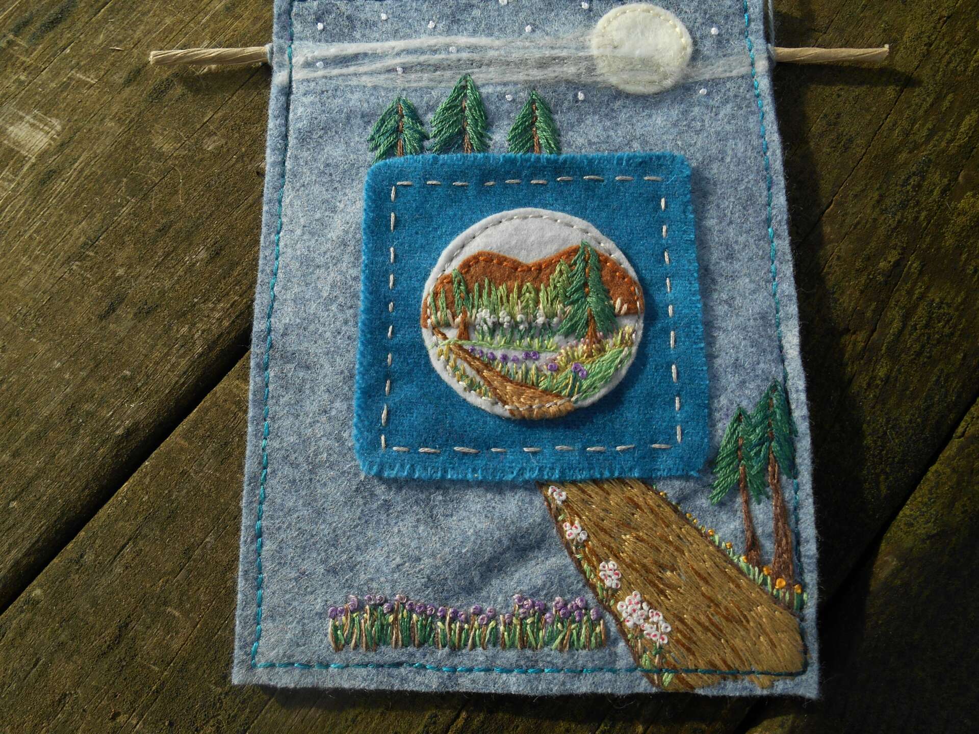 This is what I do now, every day. I work all the time, because I love what I do. Embroidery art is so vast and there are so many things you can do. I started making one of kind cards for shows, and they have quickly become the items I sell the most of. People tell me my cards are like no one else’s, which is always great to hear. I recently started using watercolor paints to paint the paper first, then attaching the embroidery piece to it. I guess I cannot use enough mediums!