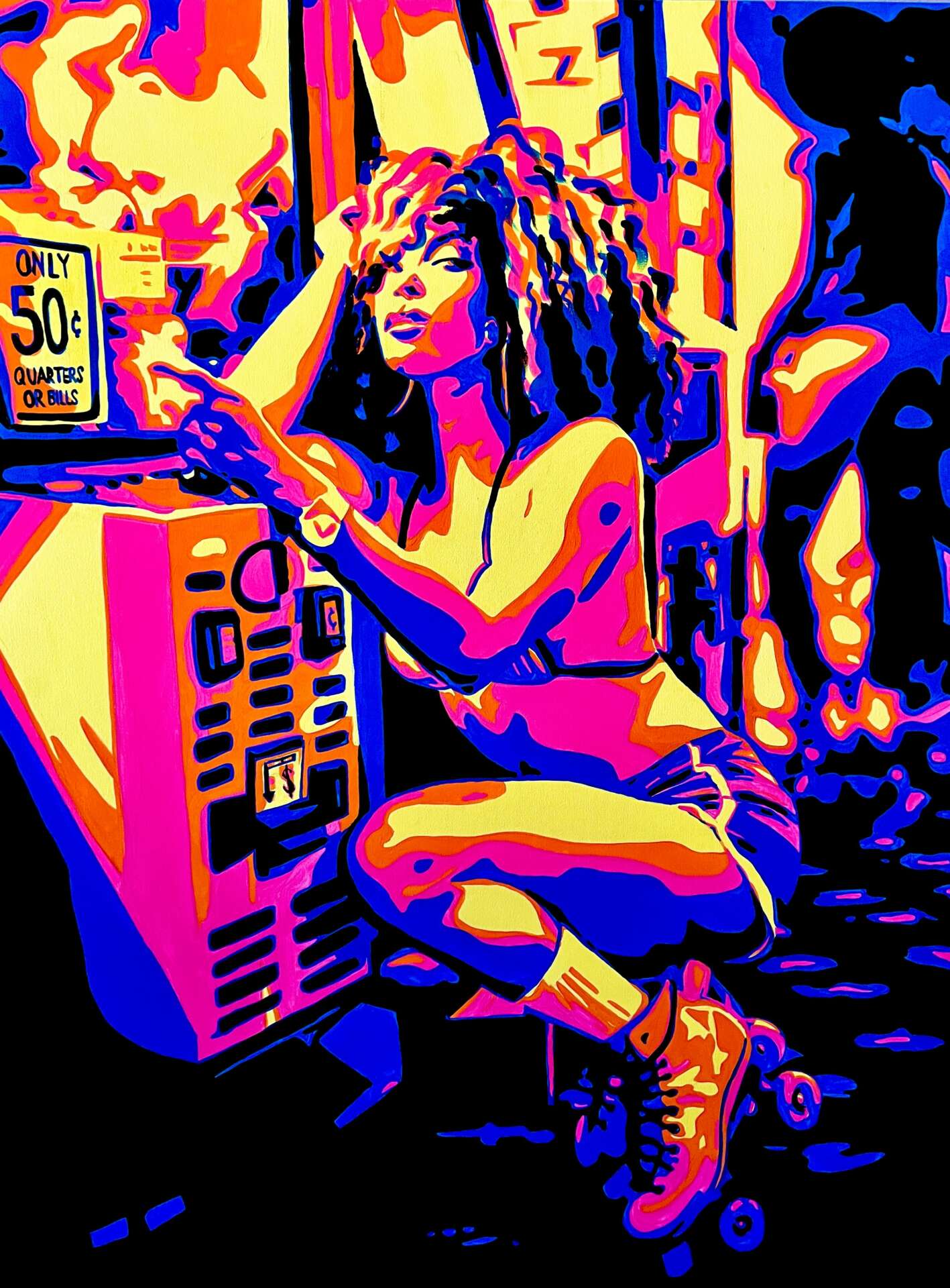 I’m an artist who specializes in visual art. I paint colorful art that depicts what I know – my culture, music, and film. I feel everyone deserves art so I merchandise my art by hand and offer a wide array of prices for everyone to be able to bring something home.