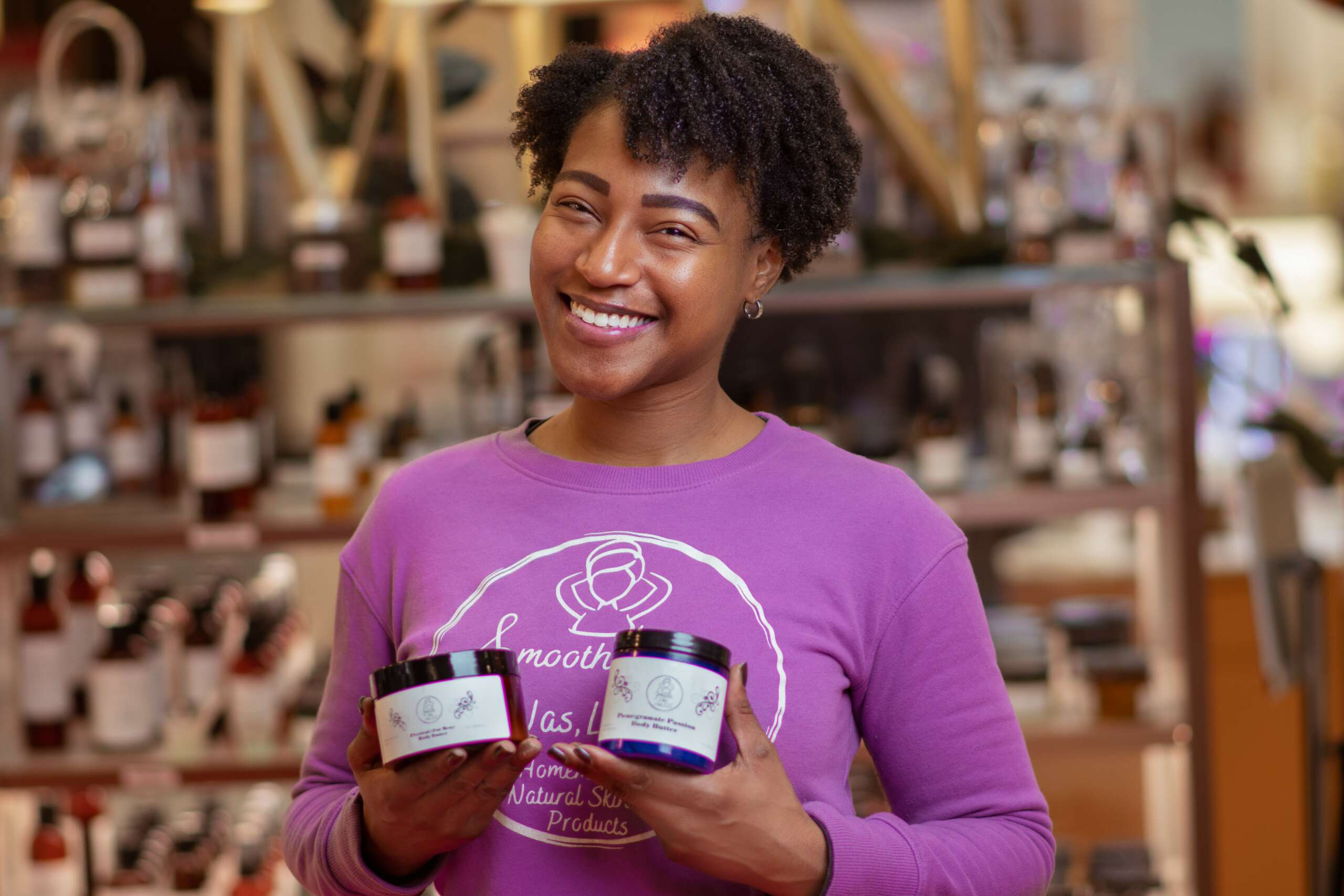 My name is Jasmine Kelly and I am the owner of Smooth Like Jas. I hand make a wide range of organic products, catering to people who have sensitive skin, allergies, or for those who are looking for a line of products that has very simple ingredients. I started making products at the end of 2019, and quickly saw the demand for a natural brand of products that had ingredients you were familiar with. I make all of my products with five ingredients or less and make sure all the ingredients that I use ingredients that are safe to eat (such as coconut oil and avocado oil). Because I make everything from scratch I have created, trusting relationships with lots of clients. I provide hair care, face care, body care, and natural remedies with essential oils to help treat lots of different conditions from dark spots to sinus and headache products. I have 2 locations, and I have a team of 10 people I have trained and trusted to help me gain more clientele and serve the needs of customers. You can find us in Memphis, TN at the WolfChase or Oak Court Mall.