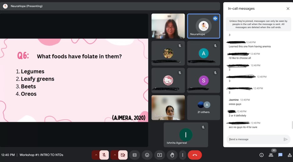 The lack of awareness around this issue was apparent to me after we presented our project to our peers during presentation day. Hence, after the program ended, I decided to continue this project further, and as a result, I founded NeuraHope, a fiscally-sponsored 501(c)(3) youth organization in order to raise awareness of birth defects, particularly neural tube defects. In the beginning, NeuraHope was simply a website and social media account to spread awareness. However, as I grew our team, came up with more ideas, and personally talked with many people who’ve personally experienced these birth defects, we began to host in-person community presentations, fundraising campaigns, workshops/webinars, interviews, podcast episodes, health conferences, and more!
