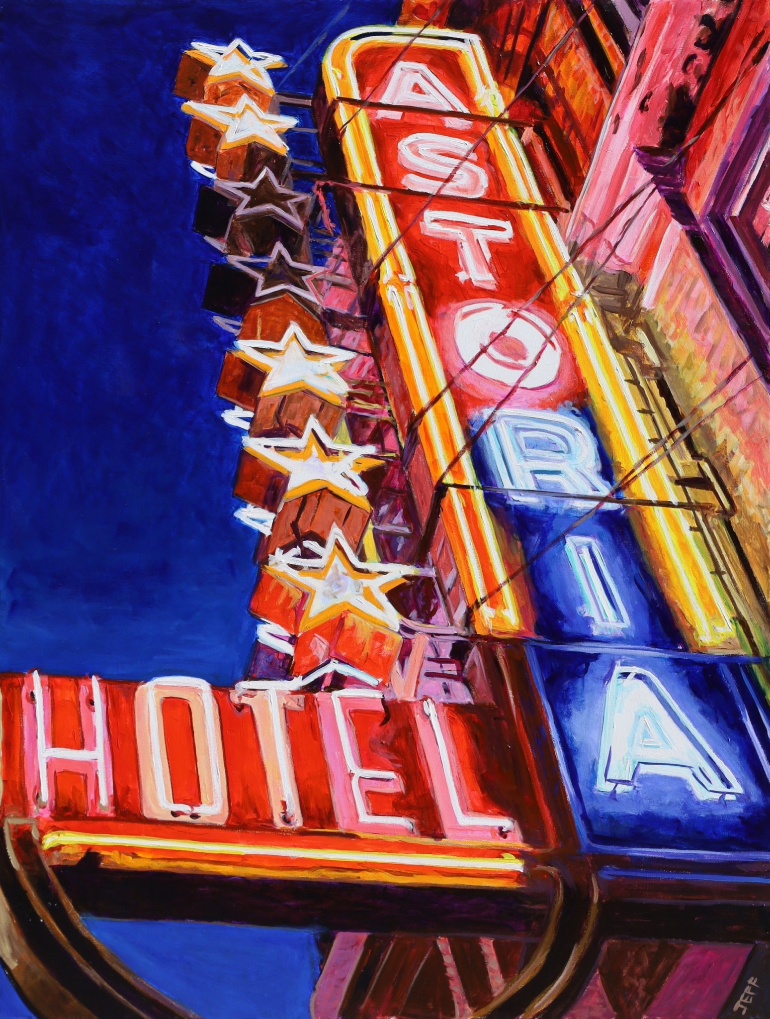 I produce original acrylic paintings across a range of distinct themes, specifically urban landscape, neon signage, junk food and marine traffic. These choices are deliberate, combining personal choice & market response. Within these specific subjects, the work features a bold palette and unusual compositional choices. Together, these choices result in acrylic paintings that are very striking and easily identifiable as my work, which seems to be an important feature for any commercially successful visual artist.