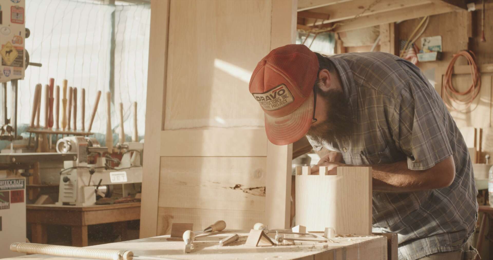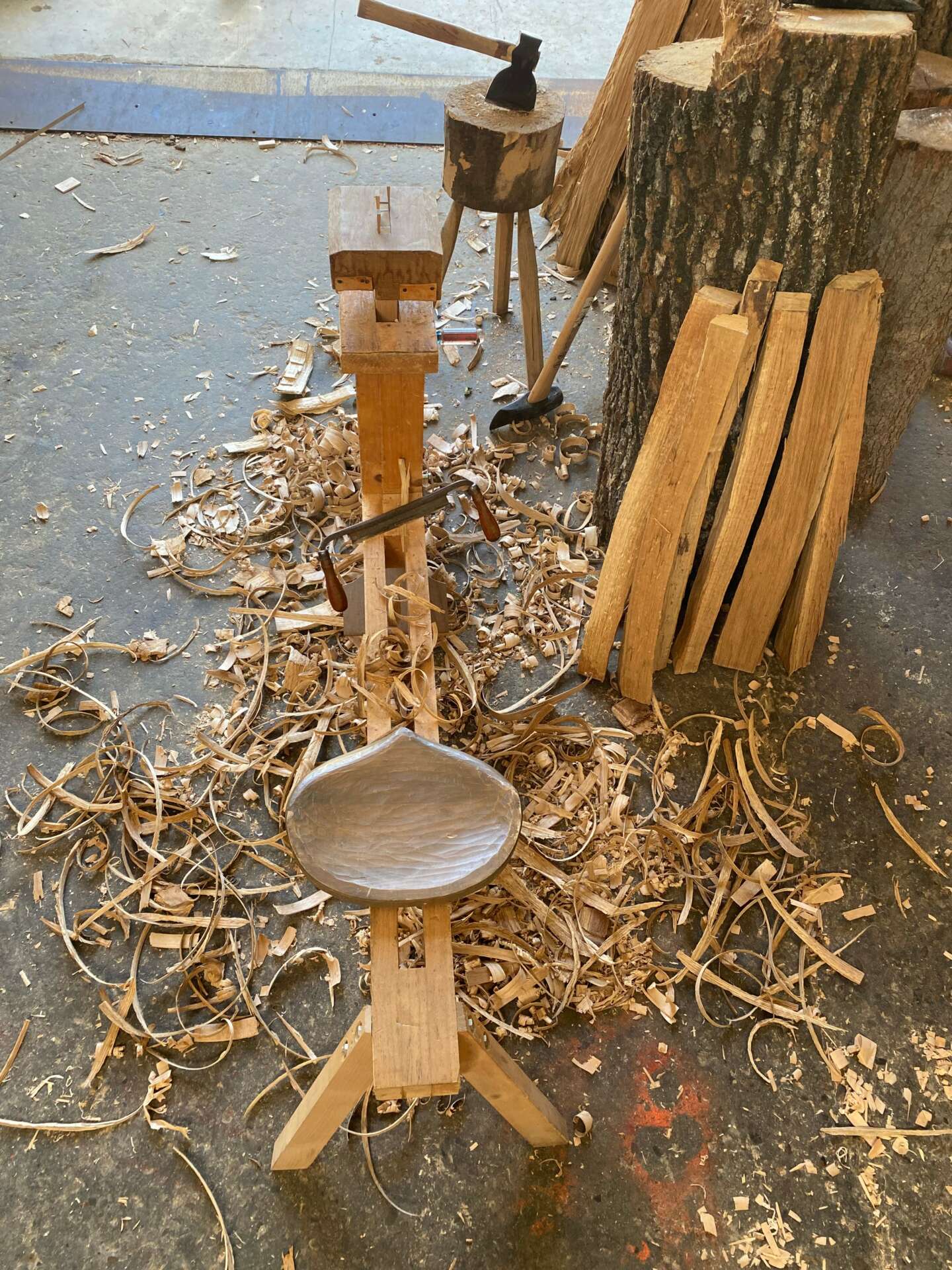 I came to my craft, I suppose initially from art. When I was a kid I was always drawing cartoons. In high school I was drawing flyers for punk shows and zines or whatever, and designing logos for friends bands. Which led to silk screening t-shirts, I enjoyed the creative control. This sort of led to block printing, I found carving to be a discipline I could sit down to for hours and really enjoy. It didn’t feel like a task, I could spend all day and night carving undisturbed. Anyways, I guess the first woodworking tools I got were some carving tools. From carving wood blocks to print, I wanted to frame some of my prints and embellish the frames. Then I started carving tikis on driftwood and making frames and boxes. So I’d look up terminology, or tools, and names of different joints. And dive into each one, reading all I could find. And I still pretty much do the same thing. Now I can spend a day at the lathe turning legs and parts for chairs after splitting the parts out of a log. The sculpting process is what I still enjoy. And carving the seats. Windsor chairs have no right angles, and are all about the negative space. For me it’s a thrill to sculpt each piece, every pass of the tool alters the chunk of wood until you are satisfied enough to set the tool down and walk away. I think my work has a human-ness to it that I try to emphasize. Every piece is made by my two hands. There are no robots in my shop. Wood grain is so unique and expressive, and I try to embellish that with the right amount of tool marks. Letting the user know through visual and tactile senses, that a human made this and it’s not perfect. My instructor Tony Fortner says we don’t say that word, and I still don’t use it. I make furniture to be used and enjoyed. I was drawn to period furniture and antiques because if they are made well enough to withstand decades even centuries of use, they develop a patina and character all their own. I find that very beautiful. I suppose I’m at this stage in my career where I don’t just get to do one thing. I’m not to the point where I can be too selective on what jobs I get to turn down. I mostly have to say yes to every call, which sometimes finds me crawling under houses or up on ladders. But for now in my work, I’m most proud of my ability to figure things out so I can keep creating things out of wood.