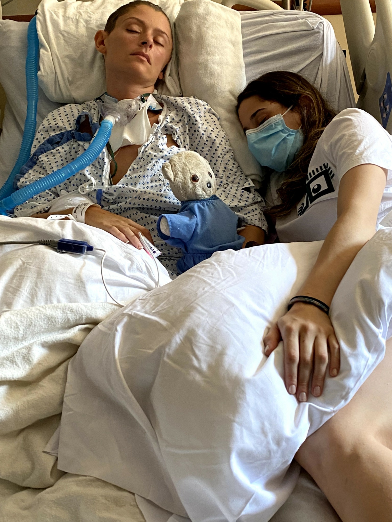 Caryn: “Her sister Amanda brought in the bear she had been sleeping with since she was a little girl. Amanda thought that ‘Beary’ – who carried her scent – could bring Jenn home literally and metaphorically. Amanda ordered blue hospital scrubs for Beary and brought him to the ICU clad in his surgical outfit. Amanda introduced Beary and told the recovery team that Beary is essential to Jenn’s recovery. The hospital staff in the ICU basically treated Beary like he was a part of the team. We would come into the ICU and Beary would either be in bed with him or sitting on Jenn’s tray watching over Jenn. They were so respectful of Beary.”