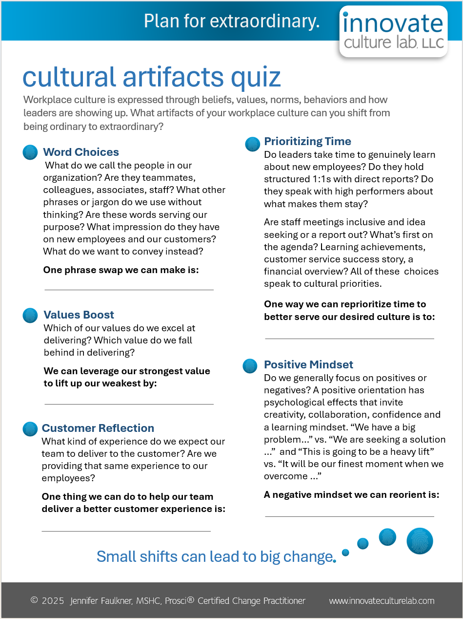 With so much volatility and uncertainty affecting workplaces, culture can be an afterthought. Even when identified as a priority, organizations don’t necessarily have the internal bandwidth to examine culture and strategically shape it on their own. This is where I can help. As founder and strategist of Innovate Culture Lab, LLC, I partner with leaders to build more intentional workplace cultures.
