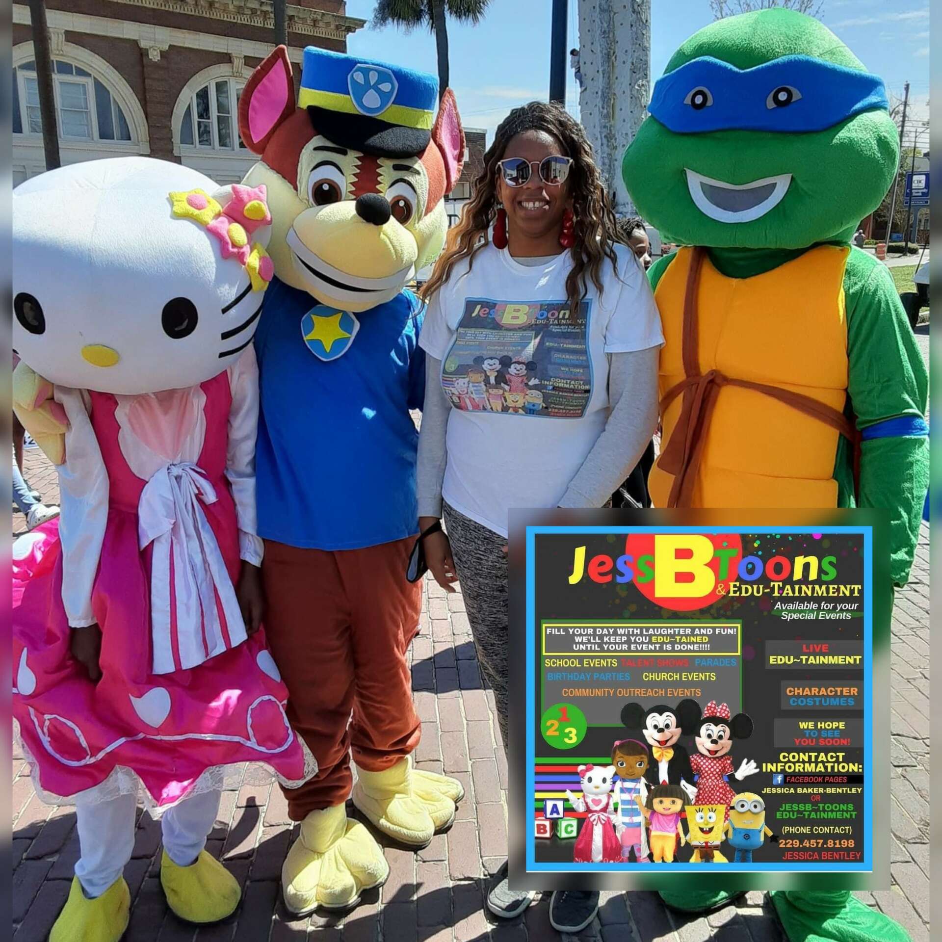 Then in 2016, I became the founder of Jess~B Toons Edu~Tainment Cartoon Characters. In which I have about 8 Big Cartoon Characters where me and my team go out and perform at festivals, parades, birthday parties and etc.
