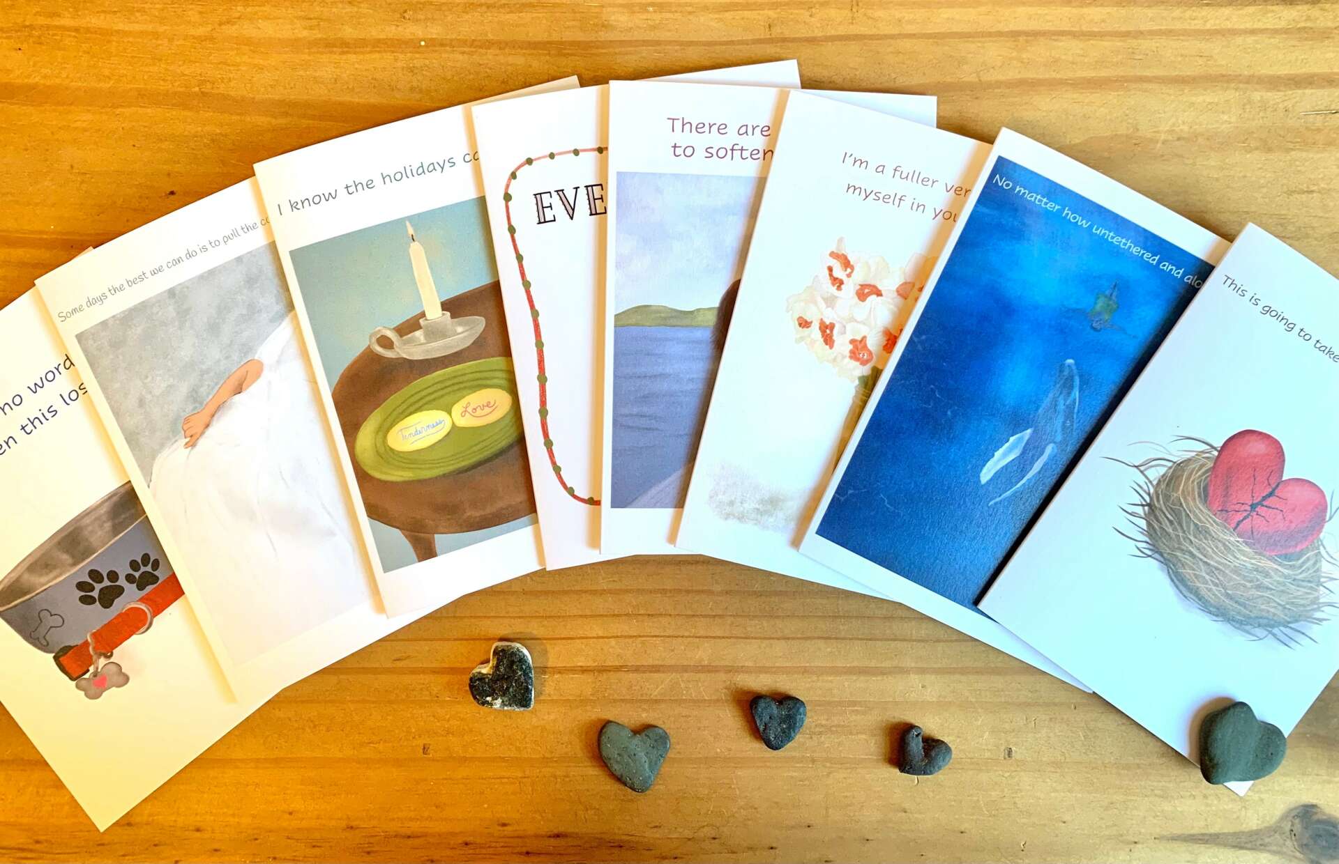 I felt moved to carry these images into a line of greeting cards and grief affirmation cards that honors the challenge, pain, joy and beauty that weave through all of our life experiences. Without doubt, these cards are inspired by my own process of walking through grief, recognizing how hard it is to hold others in their pain without trying to erase, fix, or soften the sharp edges of their experiences.