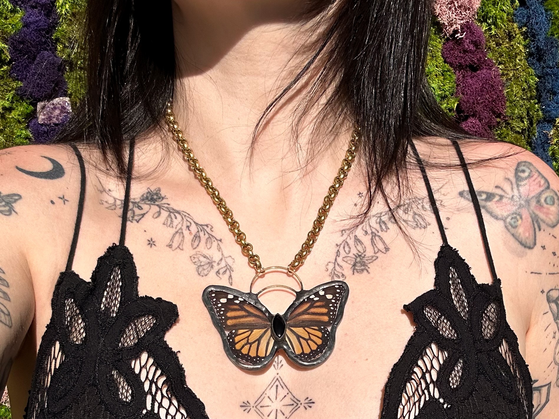 I have always loved butterflies and been drawn to them ever since I was a kid. Some of my first fond memories of butterflies would be my mom and grandma taking me to the amazing monarch sanctuary in Pismo Beach California during monarch migration season. Then my great grandmother had black night butterfly bushes all around her house and when she passed there were butterflies covering her entire house. But Enchanted Wings was born after I had my second daughter and was looking for a new creative outlet. My husband, daughter and I had to move to Colorado during the pandemic and I was playing around with stain glass at my husband’s parents house thinking maybe that was my next path but and every day this Papilio Glaucus butterfly (yellow swallowtail) would come and say hi. My dad had taken me vintage shopping almost every other weekend as a kid so I had a lot of framed butterflies and beetles in my room growing up and I had a vintage circle pendent necklace that I loved which had an encased butterfly wing in it so I knew encasing them would be possible. I knew most butterflies and moths don’t live longer than 2 weeks so I asked my husband to find me ethically sourced butterflies that are only collected after they pass naturally and I got to work. Learning how to use my stained glass skills and encase the wings without shredding them was super hard since butterflies are so fragile. My first pieces were absolutely horrendous but each week I got better and now, here we are.