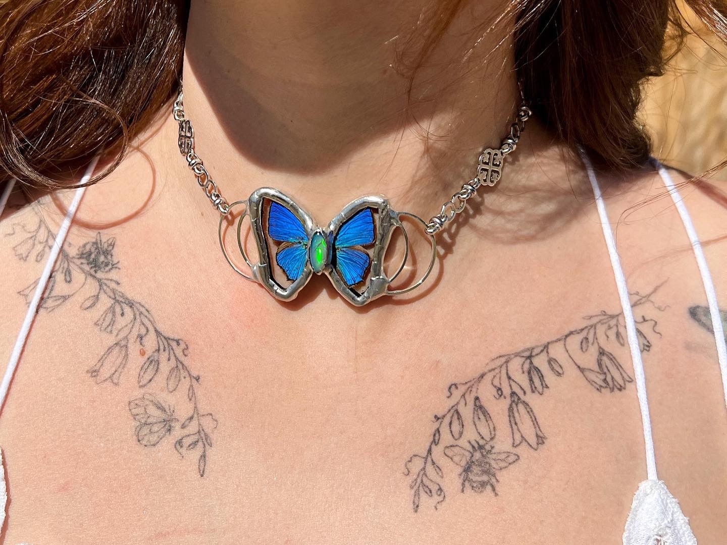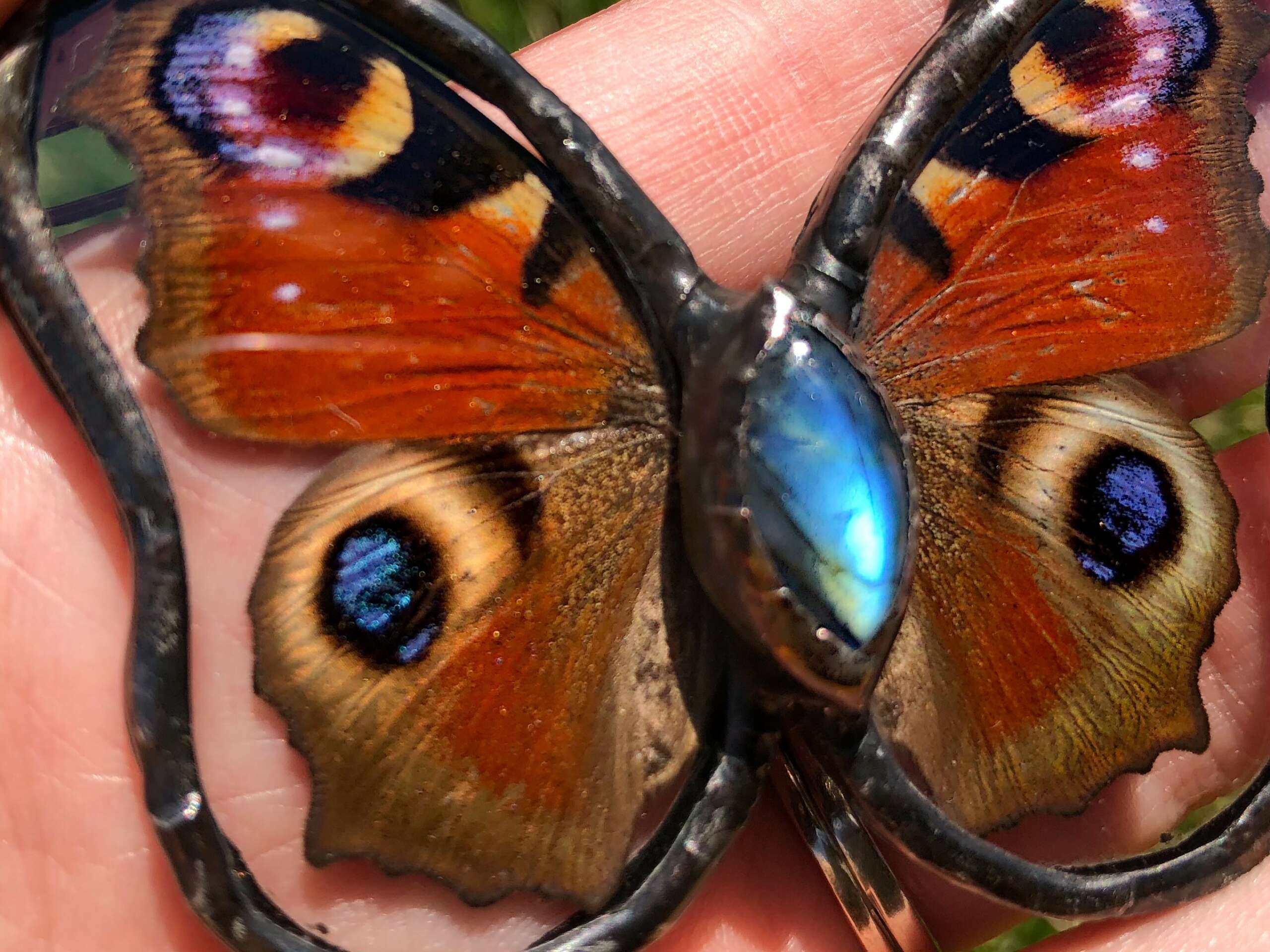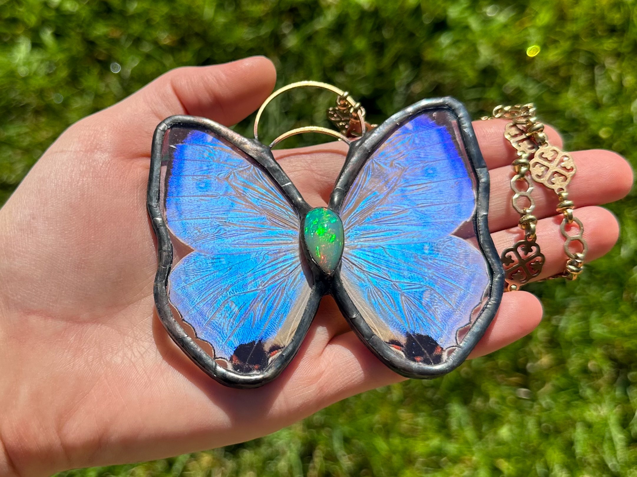 I have always loved butterflies and been drawn to them ever since I was a kid. Some of my first fond memories of butterflies would be my mom and grandma taking me to the amazing monarch sanctuary in Pismo Beach California during monarch migration season. Then my great grandmother had black night butterfly bushes all around her house and when she passed there were butterflies covering her entire house. But Enchanted Wings was born after I had my second daughter and was looking for a new creative outlet. My husband, daughter and I had to move to Colorado during the pandemic and I was playing around with stain glass at my husband’s parents house thinking maybe that was my next path but and every day this Papilio Glaucus butterfly (yellow swallowtail) would come and say hi. My dad had taken me vintage shopping almost every other weekend as a kid so I had a lot of framed butterflies and beetles in my room growing up and I had a vintage circle pendent necklace that I loved which had an encased butterfly wing in it so I knew encasing them would be possible. I knew most butterflies and moths don’t live longer than 2 weeks so I asked my husband to find me ethically sourced butterflies that are only collected after they pass naturally and I got to work. Learning how to use my stained glass skills and encase the wings without shredding them was super hard since butterflies are so fragile. My first pieces were absolutely horrendous but each week I got better and now, here we are.