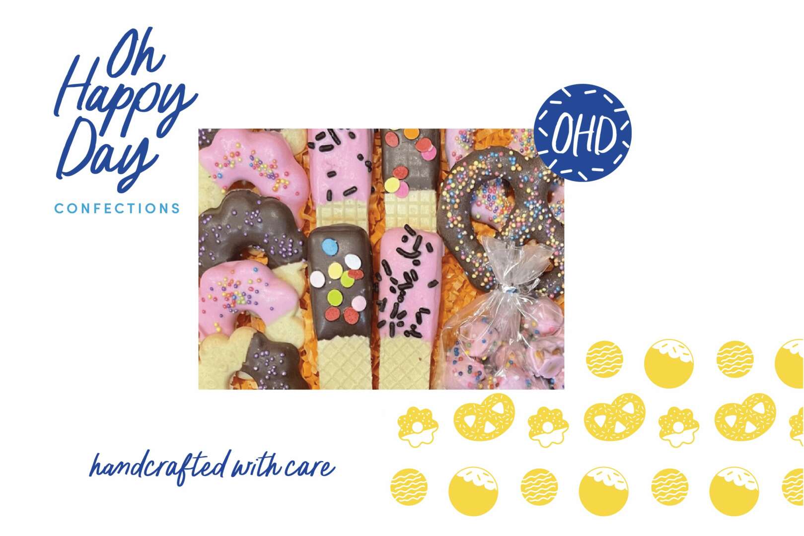 One of my most rewarding customer success stories is the brand identity project for Oh Happy Day Confections, a company that creates custom sweets and gifts for corporate events and special celebrations. The founder, Shana Mallin, has an inspiring and relatable story. As a single mom working a full-time job, Shana found herself with more free time as her kids grew older and moved on to college. Suddenly, the house was a lot quieter, and Shana needed something to fill the space. She launched Oh Happy Day as a side hustle to keep herself busy and as a creative outlet. Shana is passionate about bringing people together and firmly believes in the power of special treats to spread joy and create memories.