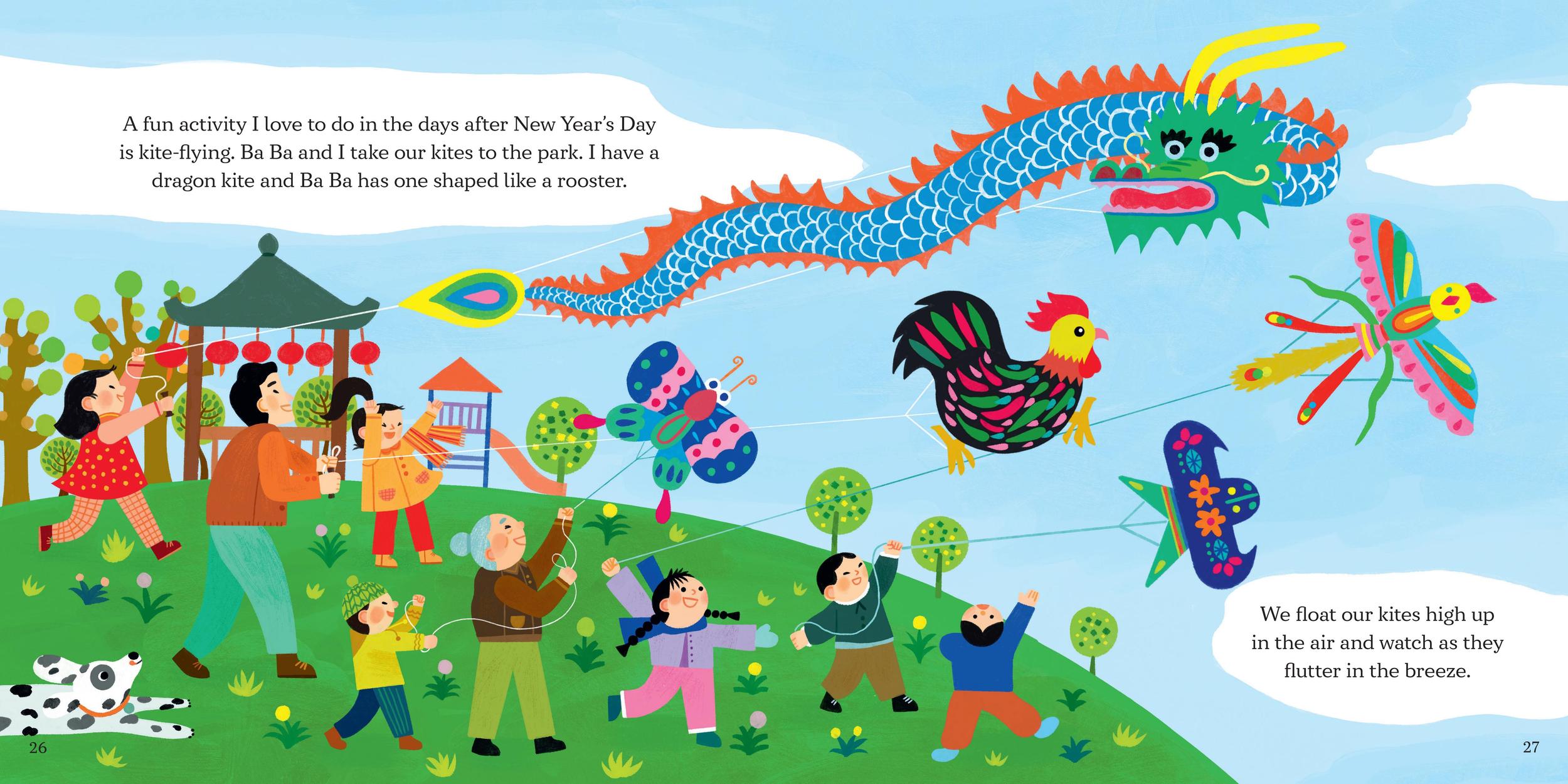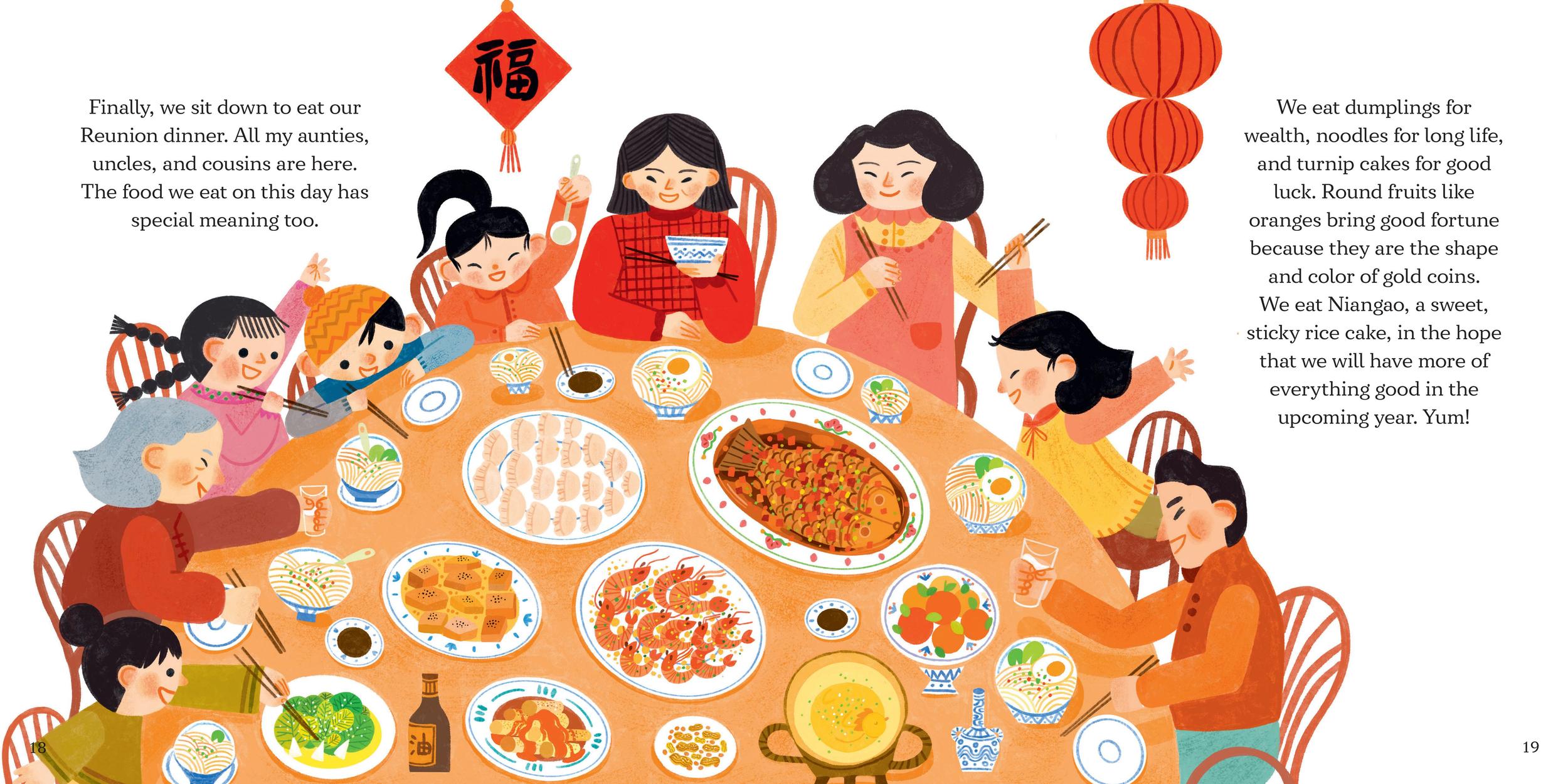 The idea for this project have come from author’s personal experience as she grew up in Malaysia,Singapore and Hong Kong and many stories are inspired by her cultural upbringing.The story of the book shows a typical family as they celebrate 15days of Lunar New Year-a time full of careful preparation,delicious food,lanterns,fireworks and dragon dancing.As an illustrator with same cultural background the heartfelt story resonated me deeply.To make the story come alive,I used warm,bright color such as red,yellow and textured lines to convey the tender emotions and design alive looks of each main characters,a lot of celebratory elements.Collaborating with them on this book would feel like a way to offer a magical first-hand account of Lunar New Year to children from all over the world.