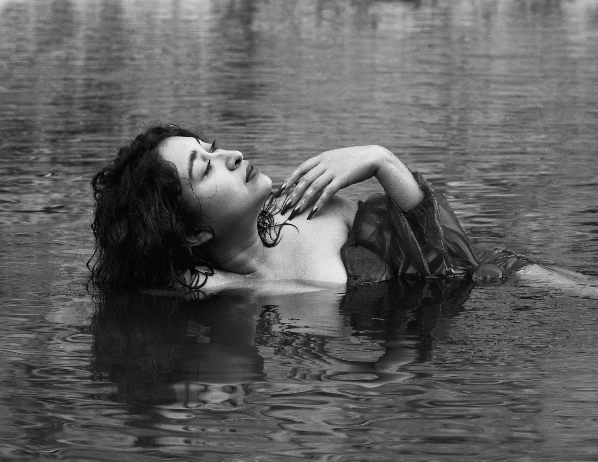 In these photos, my sister is floating in dark water, wearing a white flowy blouse while raindrops fall around her. The water and raindrops represent the persistent heaviness one feels while struggling with mental health day to day, while the white blouse she wears represents the resilience displayed by simply surviving and getting through the day. You can view the whole gallery on my website.