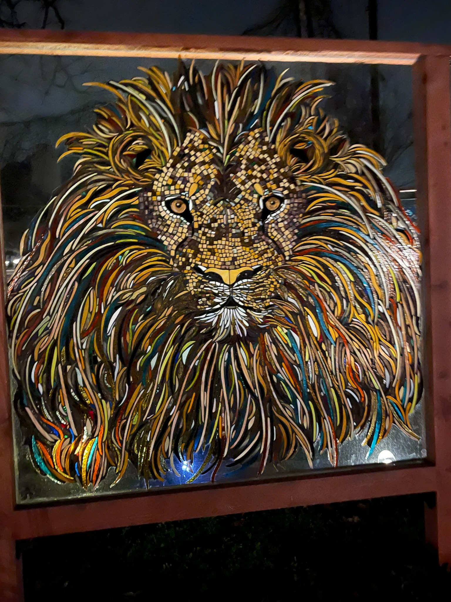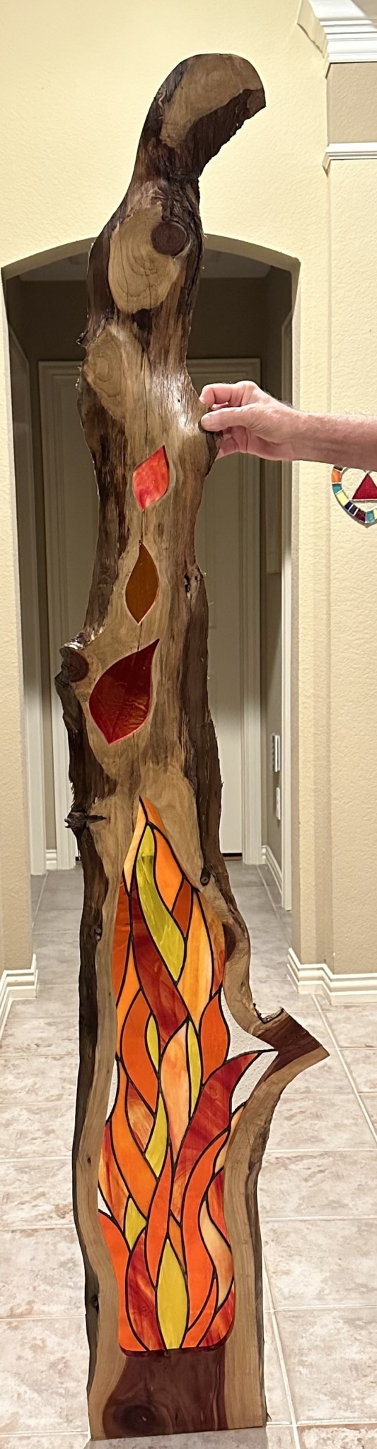 Creating stained glass produces a lot of scrap glass, so that naturally led to the production of glass on glass mosaics. We found a couple of glass hutch doors at an antique mall and decided to try our hand at this technique. This was a wonderful use of our scrap glass and provided another creative avenue. While we initially created these just for our backyard, it became another opportunity for sales.