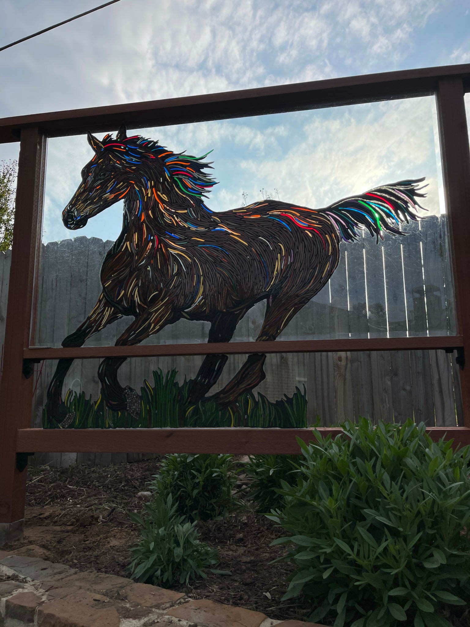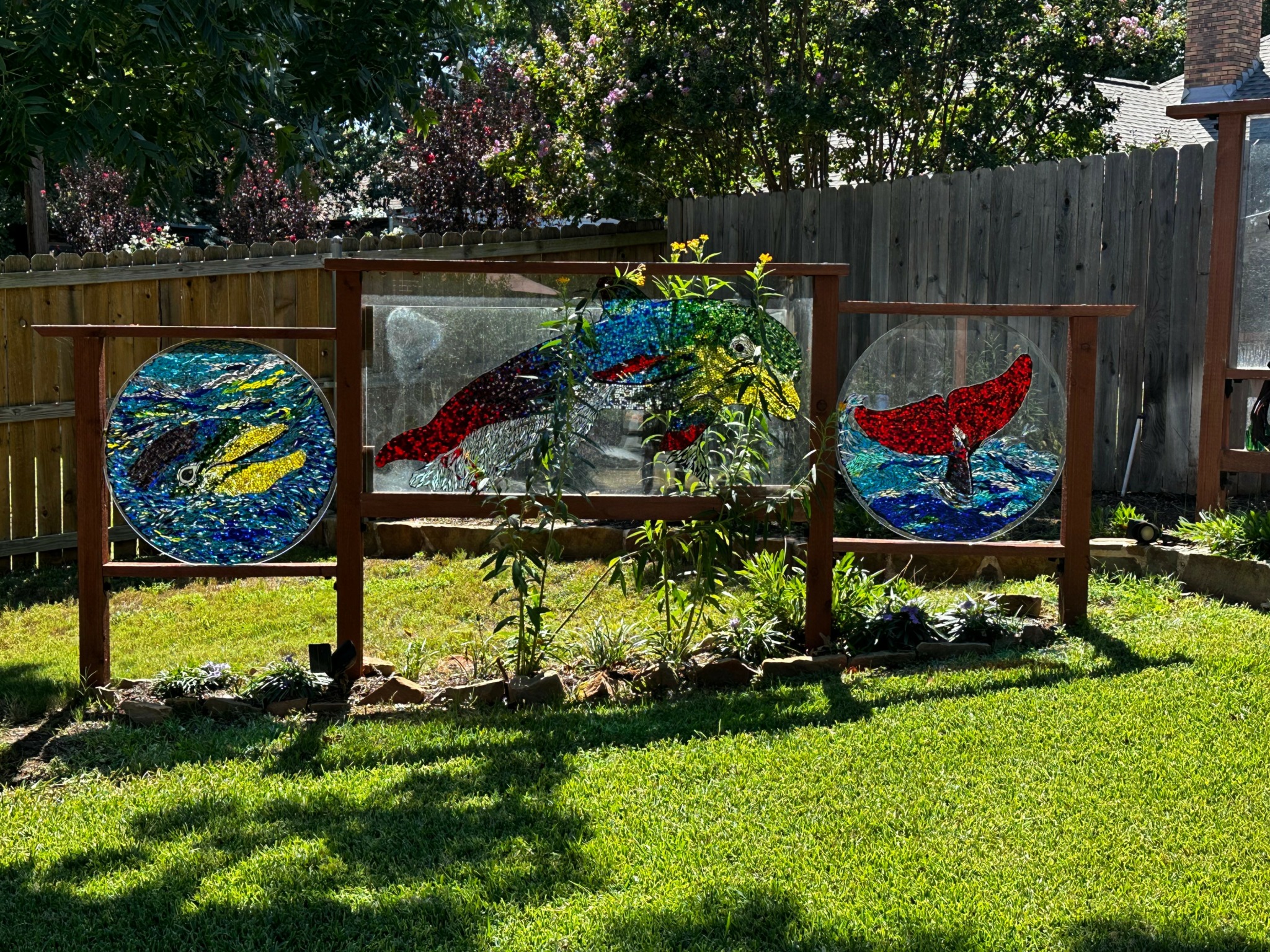 The creation of our outdoor mosaic art gallery over several years has been one of our most satisfying projects. This was born out of the need to use all the scrap glass we had accumulated over the years of doing stained glass. Our first glass on glass mosaics began with two detached antique hutch doors purchased at an antique mall ten years ago. We sought out old windows and tabletops that were discarded and continued creating pieces. At the present time we have 22 mosaics positioned throughout our yard ranging in size from a 24 in. circle to over 13 ft. triptych of dolphins. What is so special about our personal gallery is that each piece challenged us in a new way whether it was the size, the subject matter, or the style we wanted to create. We believe our reward for our work is the opportunity to enjoy it each day and share it with others who come to visit.