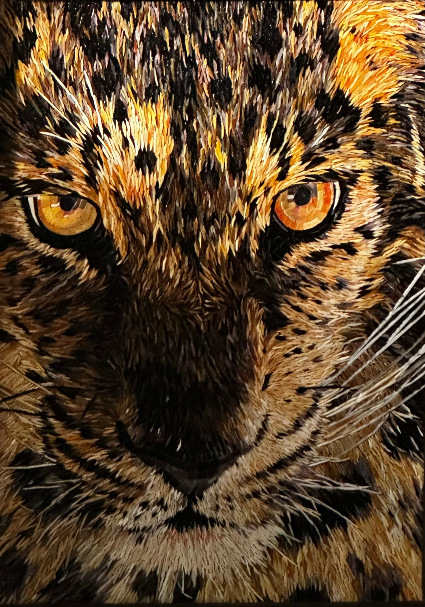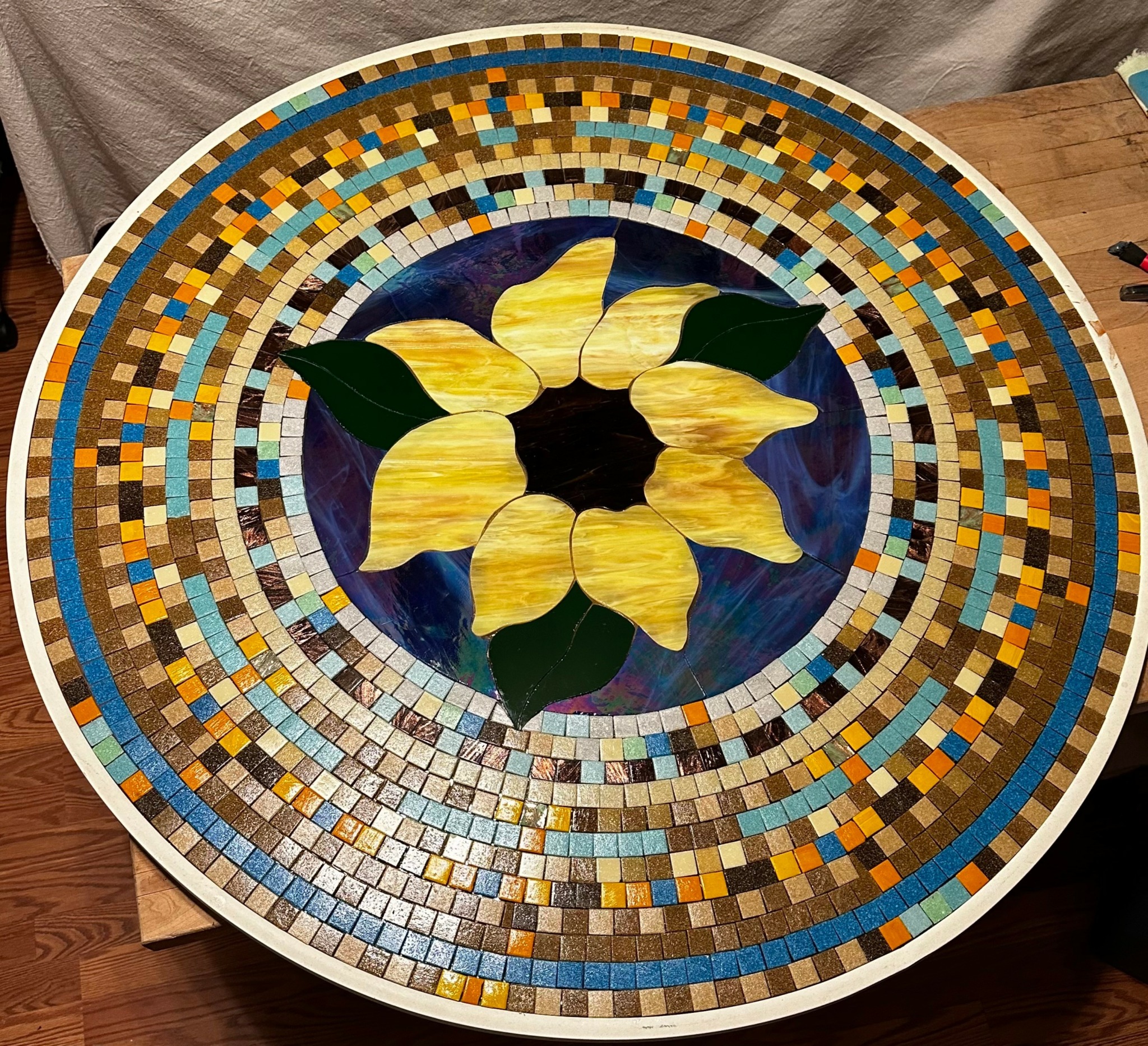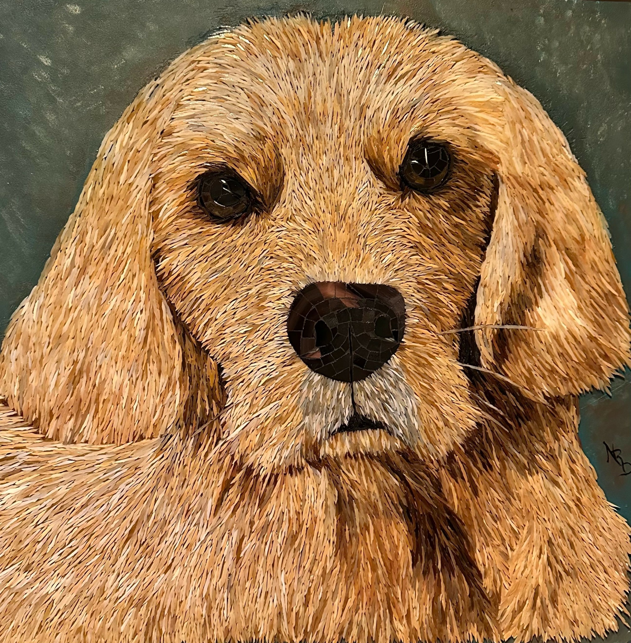 Two years ago, I saw an online picture of a bear that appeared to be hand-painted. Stunned to discover it was a mosaic I delved a little deeper into the artist and discovered they were offering an online class. Although apprehensive I registered and ended up taking two of their classes on realism mosaics. Now hooked on this style I have continued to create pieces ranging from a 36 x 48 in lion to 12 x 12 pet portraits. Our works have been featured in over 20 online exhibits and we are proud that several have won awards in juried exhibits.