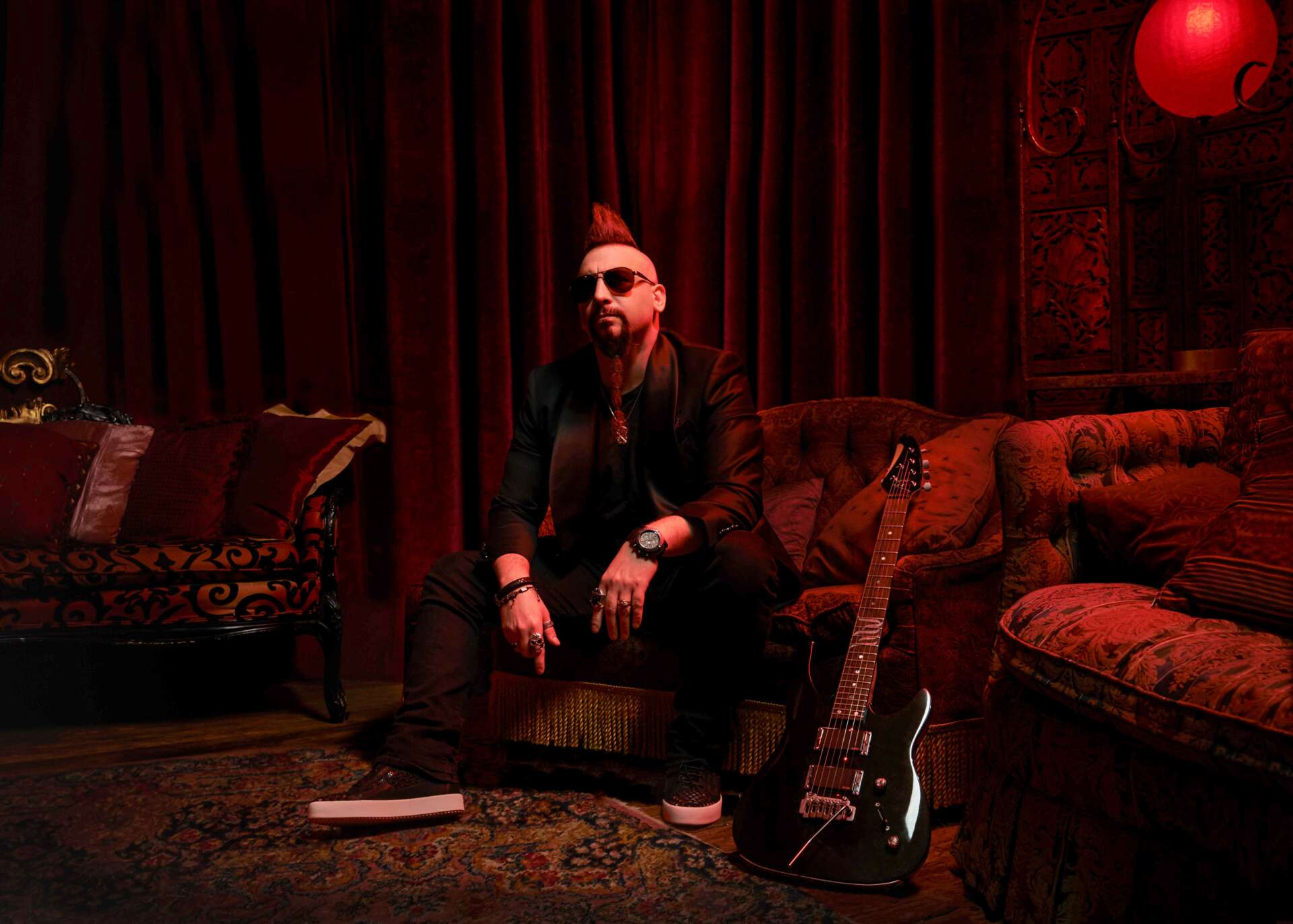 Headshot & shot with guitar with red tint: Brett Falcon others are watermarked by photographer