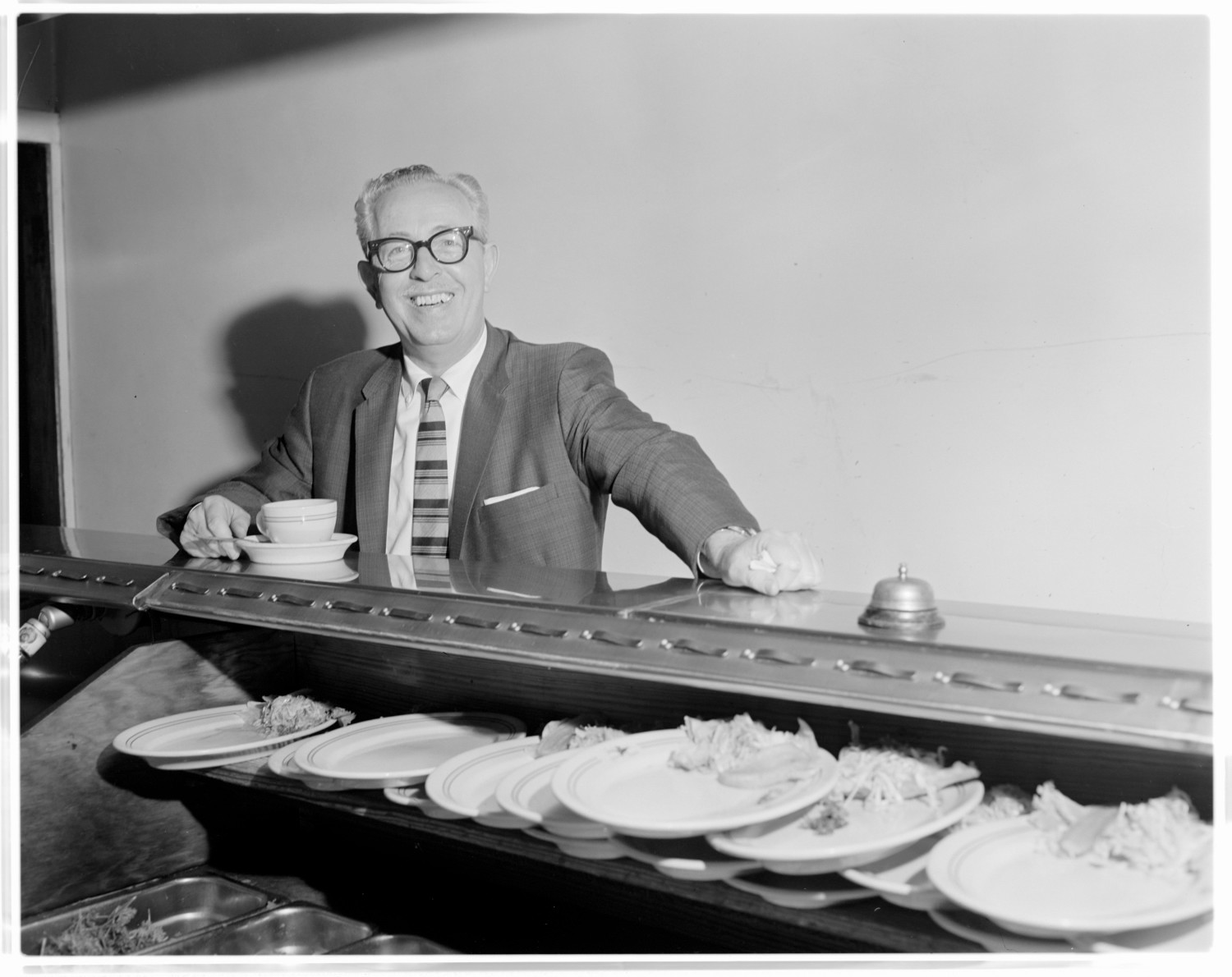 Harry Akin at counter with plates of food at the Night Hawk restaurant. Credit: Neal Douglas (1958), via Austin History Center
