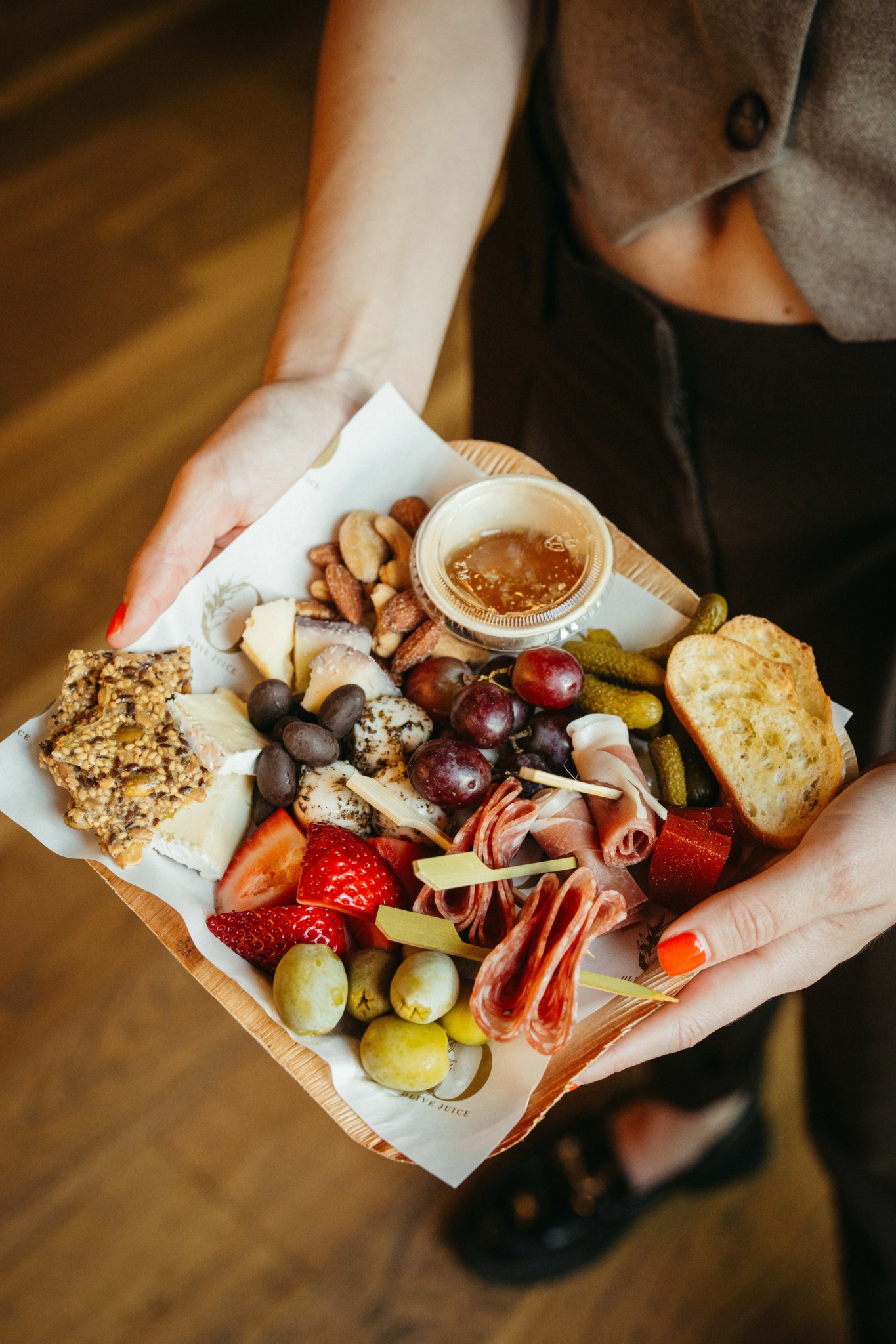 Our brand name is Olive Juice, a name that has many hidden meanings within; to start with, we love the fact that when you say “olive juice” to someone from far away, it looks like you are saying “I love you” and that makes sense for us because our business is routed in love. The love of sharing a meal with a friend, family member, co-worker or even a stranger. The love of helping people discover that they actually DO love olives or that a creamy blue cheese pairs incredibly well with some local wildflower honey.