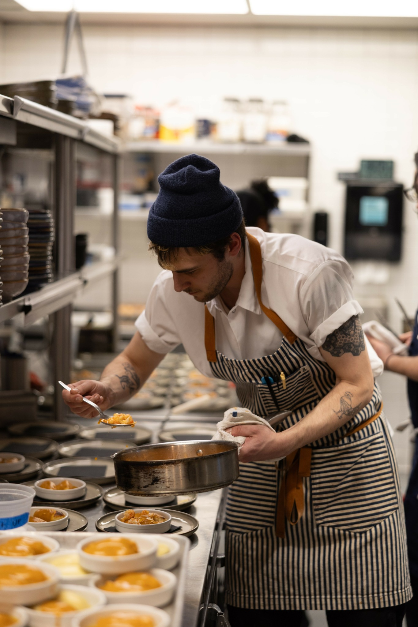 that night i locked the restaurant doors at 1:30am after my 14 hour shift. I go home, make dinner, watch a movie, and go unlock restaurant doors at noon. Not every day is the same, but i approach with the same rituals. I walk in, set my knifes out, and fold towels. blue stripe facing me. two stacks. perfect squares. i pour a coffee, chug it. put away orders and organize walkin, dry storage and shelves. then it’s time to cook. sauces first. Red wine demi glace, sauce supreme, sauce charcuterie, mussel jus. As those reduce on burners, i start dessert and pastry. i make cremoux, spin ice creams, bake cookies, make tart pastry, creme patisserie etc. I finish with knife work as the rest of the line cooks come in and start their shift. Every day we do line up and talk about our goals, shift flow, and reservations. We all need to be prepared and communicate with each other like every service is a basketball game or a theater act. With the approach of believing we are the best restaurant, and acting as such in every moment, we trust that it is only a matter of time before we are recognized as a contender for best restaurant midwest. If achieved, i will be one of the youngest Chef de cuisines to receive the award.