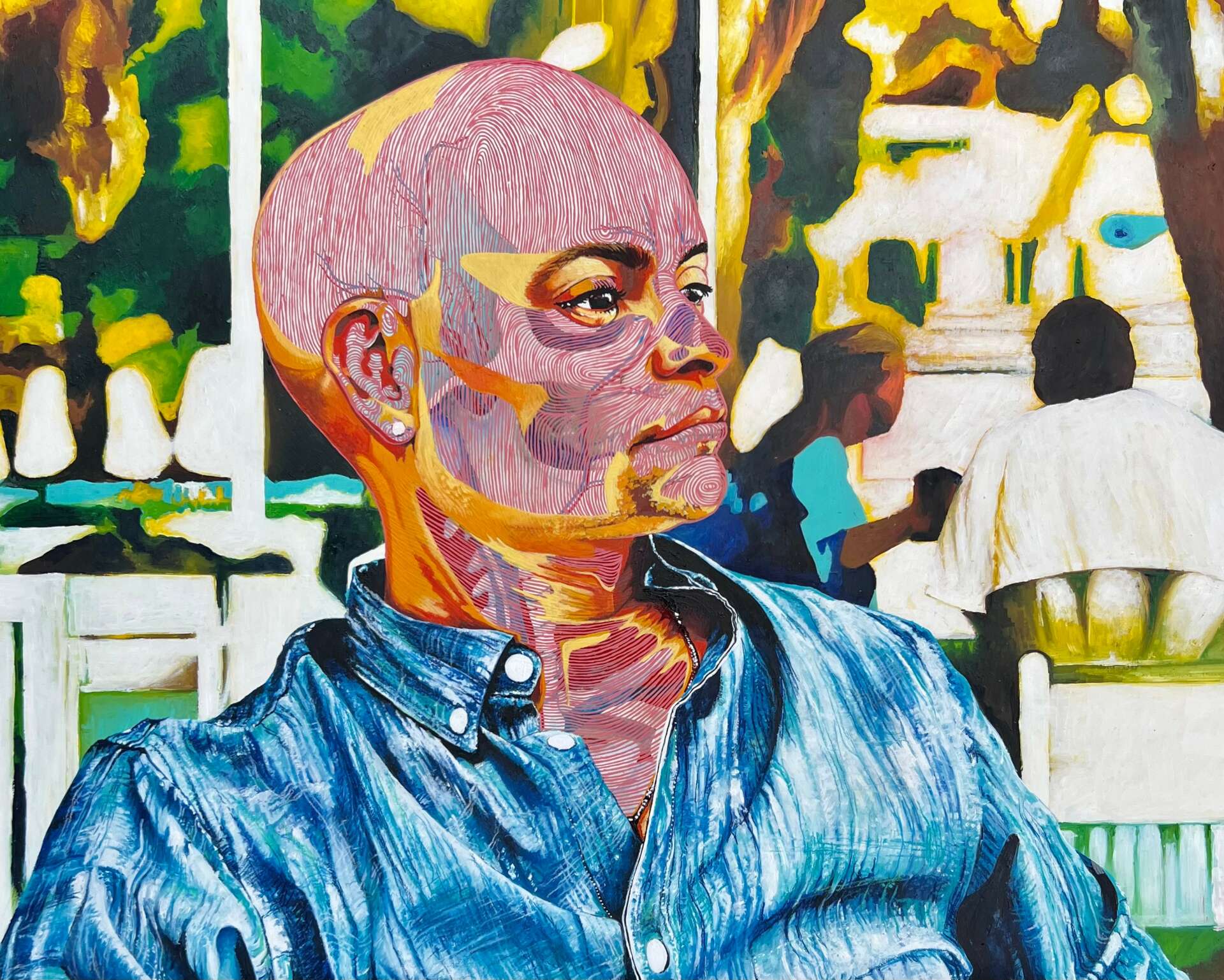 My current body of work are small glimpses of my life. Images that I have been thinking about and trying to work into ideas. Moments in time that spark a feeling or bring back a memory. When I work on a portrait, I want to show the viewer my version of that person. I paint some of the figures in my work in layers. I like to think that if they were cut back in thin strips or transparent, what story would be exposed. Sometimes what’s not on the surface is what I want to see. So I layer the figures. I want the viewer to think about why I’ve painted the figure that way. I’m reminding the viewer to stop and look. That there is something of beauty and disappointing. The layering has the results of a fingerprint that makes my paintings more surreal. By heightening some of the colors, I’m adding some of my personality to the story.