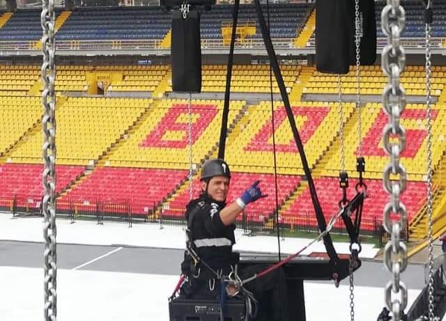 Rapidly I got to be a fundamental part of the assembly of concerts and massive events; being part of the group of those who are “the first to arrive and the last to leave”, I managed to learn the step by step. From the basics of the construction of a stage, to being able to receive an artist including the supply of the services of installation of points for anchoring motors and structures, for subsequent elevation of loads (videos, audio, lights, lasers, pyrotechnics, scenography) according to the artist requirements. I was in charge of personnel management in heights for different companies, and in different world-class events such as: Depeche Mode, Metallica, Radiohead, Rolling Stones, Megadeth,