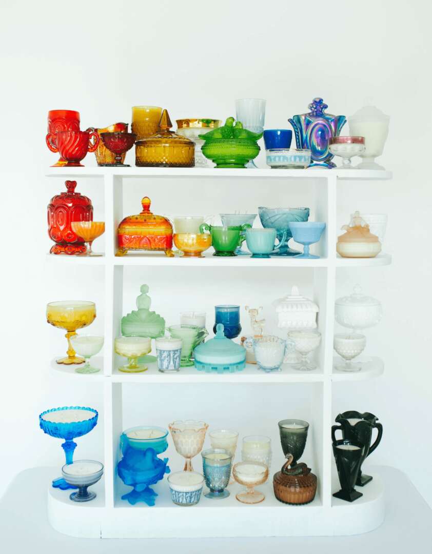 I was looking for a creative outlet and something to fill my time outside of my full time work. I began researching the best materials and process for pouring candles. I started ordering supplies and testing candles in mason jars. I had friends and coworkers giving me feedback on fragrance combinations I came up with. Truly, it was testing, testing and testing again. I learned the wax, wicks and fragrance combinations that worked for what I wanted to create. Simultaneously, I was shopping for vintage and antique glass for my vessels and began testing with them. Though shopping for the glass is still the most fun part of my business, I am at the mercy of what is available and while there is a lot of glass in our thrift and antique stores, I have maintained a high standard of condition and variety. So, sometimes I leave a store empty handed. Because this was all being done on nights and weekends between work, it took nearly 7 months to perfect my process and product. Once I had all of the back-end business pieces ready, like my website and the ability to legally sell in Texas, I hosted a soft launch in my home with friends and family. Then, a few months later I participated in my first vendor event. I didn’t sell a single candle at that event, but I continued showing up to events and have had great success since. From that point, there was nowhere to go but up!