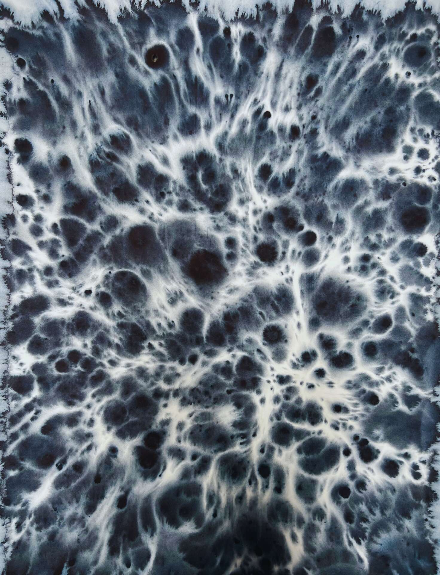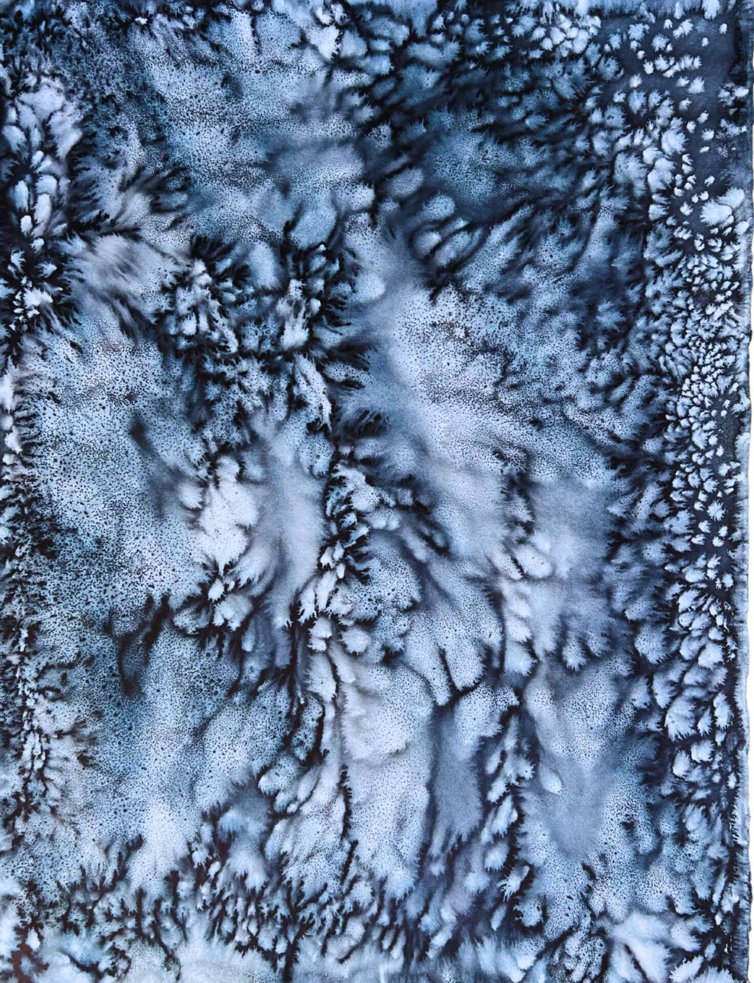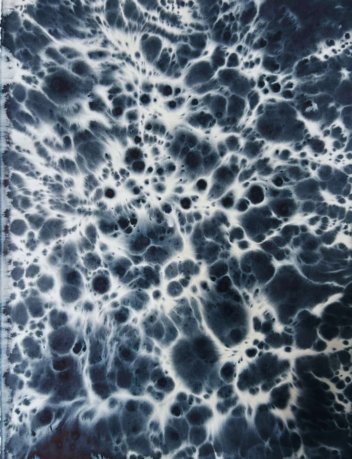 I come from a construction family and I always knew I would go into the family business, but I didn’t expect my construction to necessarily take such an artistic form. I am a printmaker working in the contemporary abstract expressionist tradition and my work is constructed through meditative practices. The primary materials are watercolor (Winsor & Newton Payne’s Gray) & salt (Morton’s Coarse Kosher) on paper (Rives BFK) instead of my families traditional materials of sand, asphalt, and gravel. The content of my work reflects on the infinite and the intimate, the Divine and the mundane, the micro and the macro, all through biomimetic imagery. The artworks remain unframed in the traditional sense. For a long time, I didn’t understand my reluctance to framing, which is often thought of as a completion step. I had the means and ability, but the work resisted it. It wasn’t until I read Amanda Palmer’s book The Art of Asking, where she explains about the exquisite trust and vulnerability that develops between a performer and their audience that I understood. The pieces are an experience in trust. The sheets of paper remain unprotected. They rely on the viewer to treat them with at minimum benign neglect, and at best, utmost care and consideration. Thus adding to the interpretative elements while implicating the viewer in the process. The artworks are carefully choreographed partnerships between material and intent and the monochromatic color scheme constructs a meditative space where the viewer has room to explore free from the distraction of compliment and contrast. Every element is collaborated with allowing for the coalescing of form and meaning. My work encourages collaboration and reflection. I frequently share timelapses of my process on Instagram and offer introspective questions with the images, as a way of encouraging more aware and thoughtful living. Having my art in your space is an invitation to discussion and a deeper way of being.