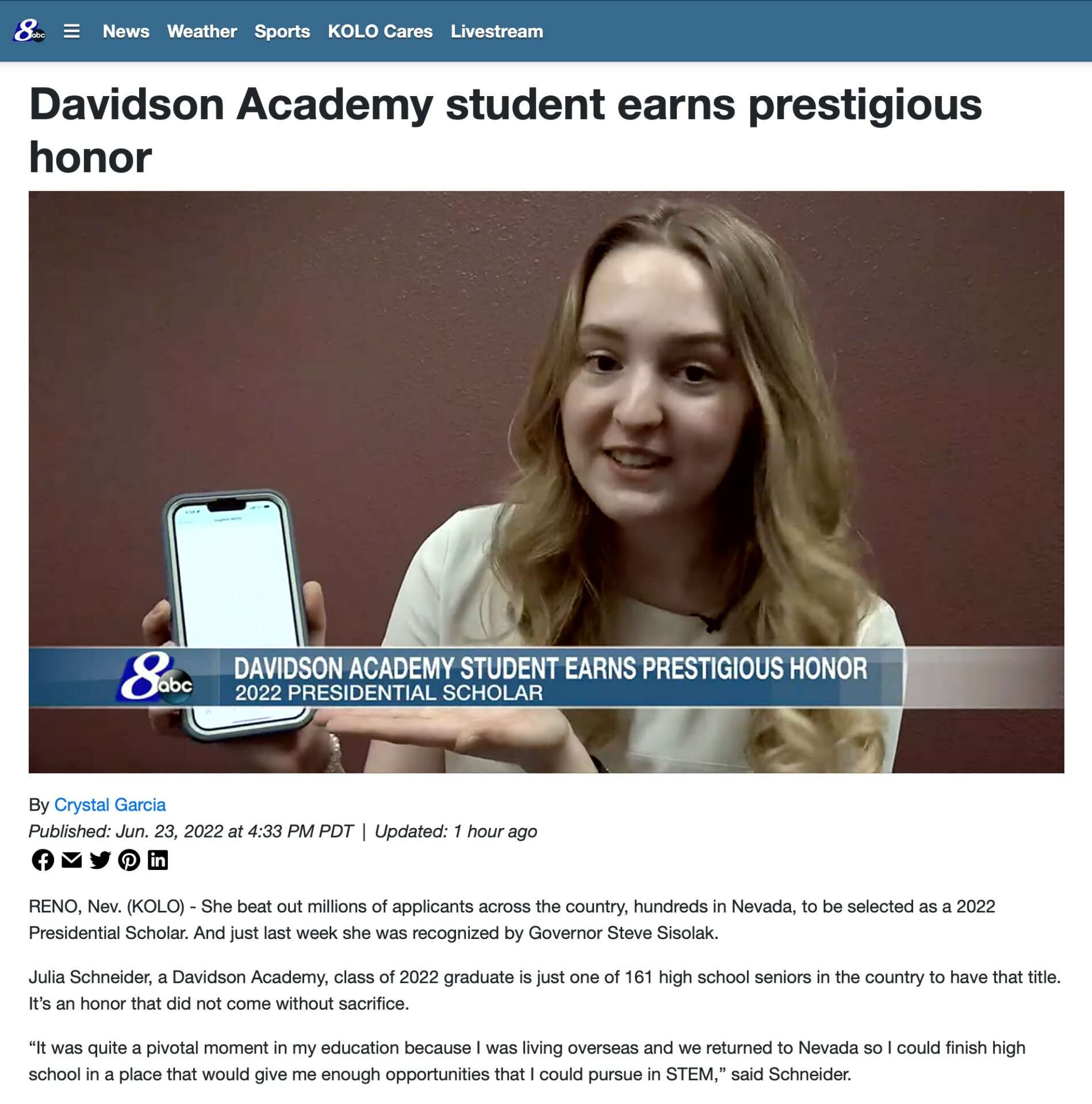 Julianna is a U.S. Presidential Scholar, National Merit Scholar, Congressional App Challenge Winner, the National High School AIAA Lockheed Martin Marilyn Hewson Scholar, and a FTC Dean’s List Finalist. She led three FIRST robotics teams to win state, regional, and international awards and a team of NASA interns to publish research with the American Geophysical Union. Julianna created VoluntYOU, an award-winning, 501(c)(3)-backed digital platform that connects 500+ users to volunteering opportunities globally. She mentors NASA summer programs, Science Olympiad, and FIRST robotics programs. She conducts research on improving human-robot collaboration using a pipeline of machine learning models. Julianna has been recognized by the U.S. Senate, U.S. House of Representatives, and the Office of the Governor of Nevada for her achievements and excellence. Julianna is an incoming freshman at MIT who will major in AI & Decision Making.