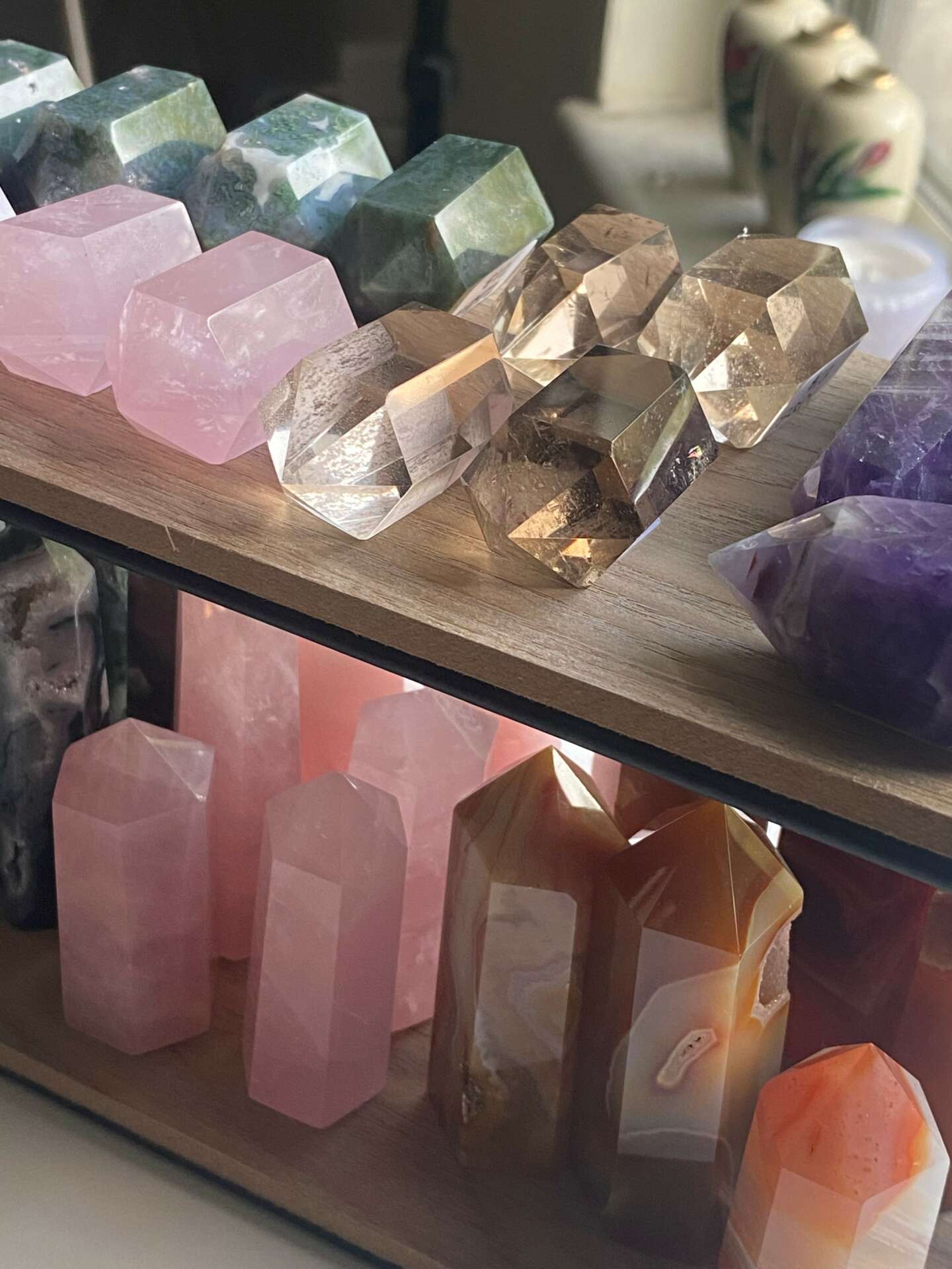 During Covid, I started a fun instagram account to keep me busy. I was blowing up my personal account with crystal related things – so I figured why not start one! One of my favorite things to do is to learn + collect crystals. So, I started taking photos everyday + posting a digital diary of the crystals I owned. I started making friends all over + watching way too many live buying shows. I named the account Justice 4 Gems – a little play on my name. I thought it was fun, catchy + just made sense for me.