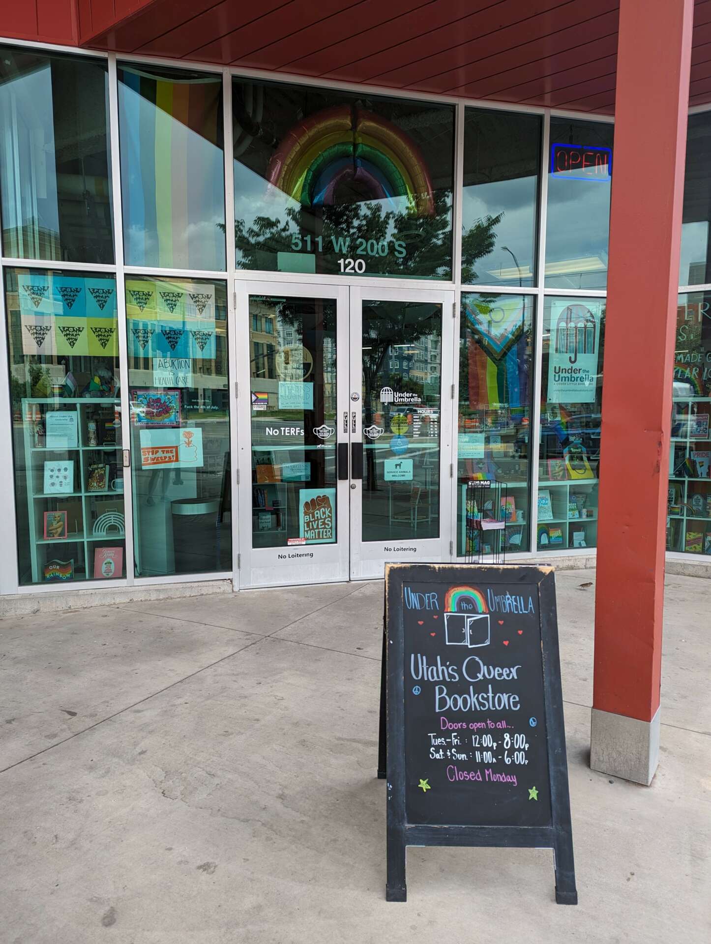 That’s where Under the Umbrella comes in. Under the Umbrella is a queer little bookstore on Ute, Goshute, Shoshone, and Paiute land (Salt Lake City, Utah), sharing and celebrating queer books written by queer authors and offering a safe, sober, and accessible space for 2SLGBTQIA+ people to gather. We flip the script on the traditional prioritization of the publishing industry by further prioritizing the works and stories of Black queers—especially Black transgender women—and other queers of color, disabled queers, fat queers, two-spirit people, intersex people, asexual and aromantic people, incarcerated queer people, queer sex workers, and other identities within the queer community that are further marginalized. In addition to books and other queer-made goods, we offer free and low-cost resources for our community, including meeting spaces, a small cafe, a little free library, and a give & take wall for individuals to build community together.