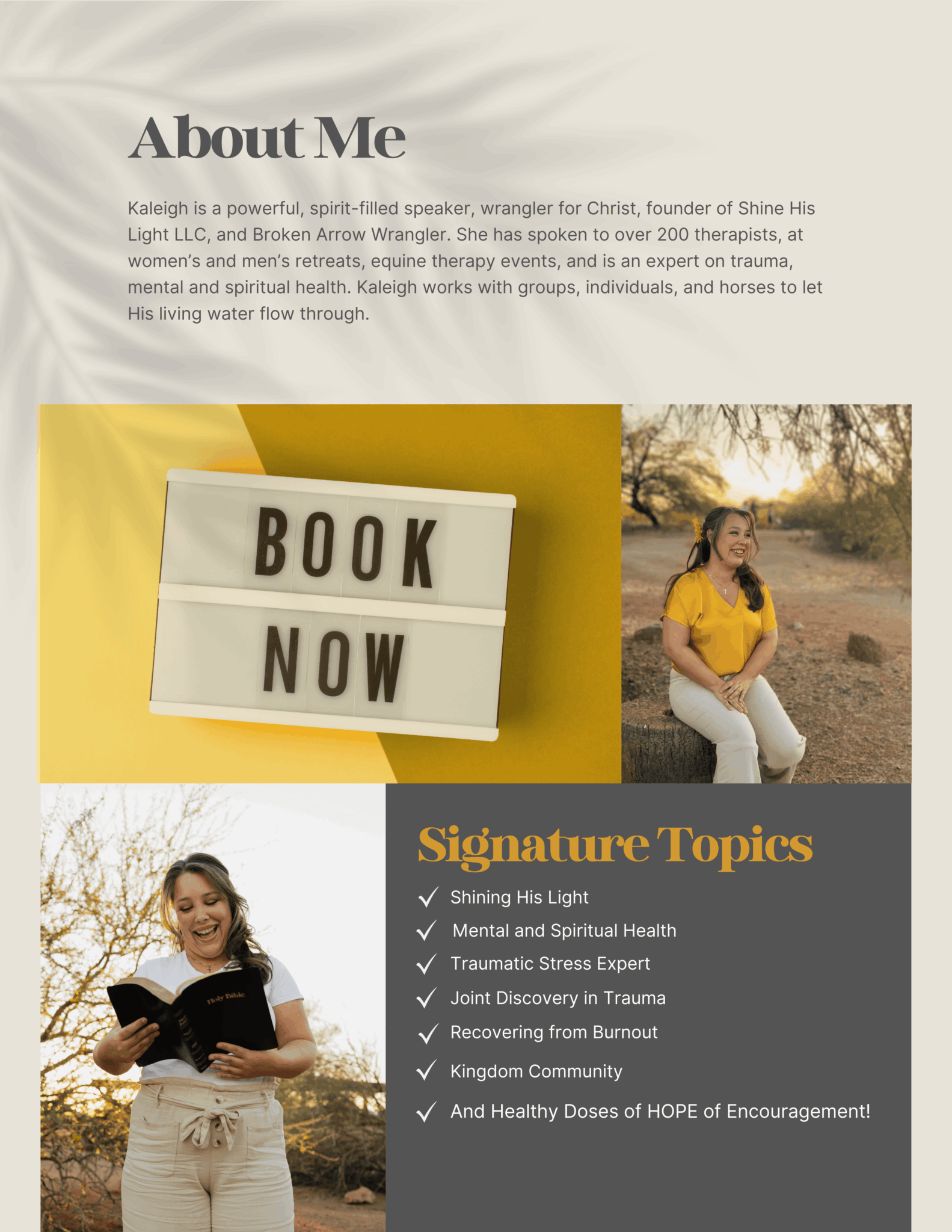 Today I am the owner and founder of Shine His Light LLC and master builder in local nonprofit AZ Broken Arrow Wranglers. Shine His Light LLC is a safe place for the lost and hurting. My full vision is that the ministry of Shine His Light will be a beacon of hope for those stranded out at sea. A sanctuary of the soul where people can re-learn what it means to be loved and cared for. My laser focus has been serving individuals through advanced trauma individual therapy, building equine therapy contracts to serve aging out foster youth, EMS first responders, and addiction treatment. I’ve also been spearheading and fundraising a 6 Week Healing Intensive for 10 women that hurt and hide in the shadows right here in our Arizona community. I co-lead and partnered with the nonprofit Broken Arrow Wranglers to ensure anyone regardless of income can access the healing therapies they need. I am a passionate advocate for trauma informed reformation in our prison system – let’s go y’all!