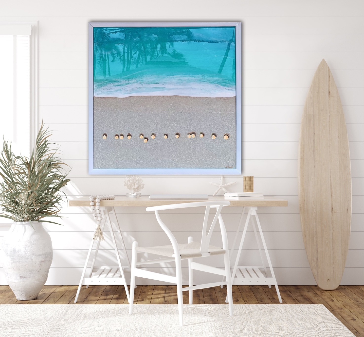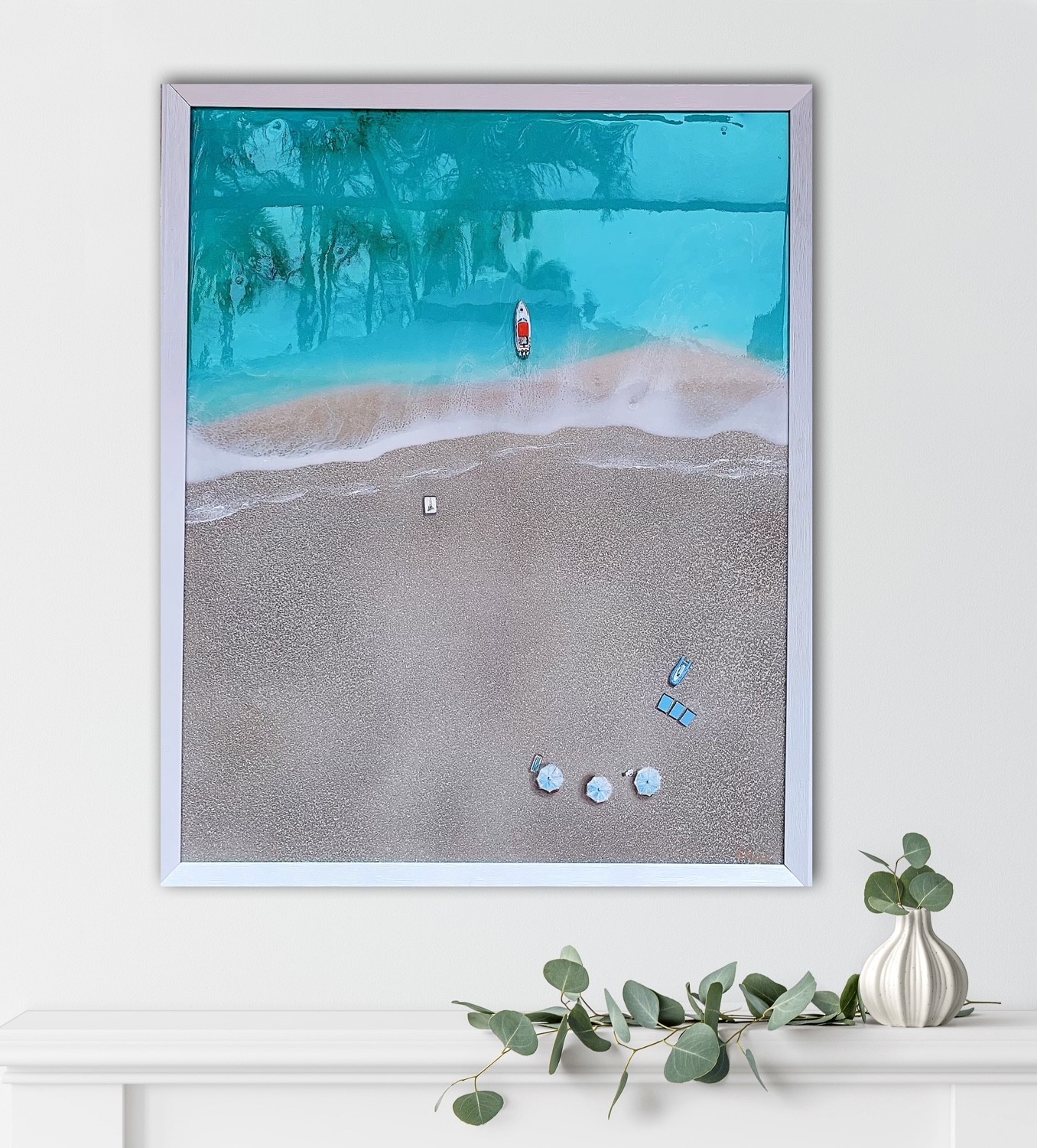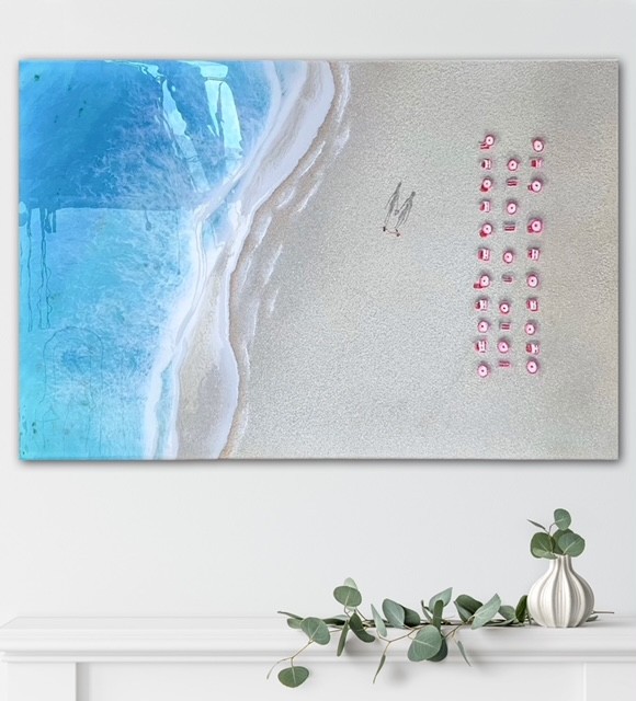 Her current collection focuses on aerial seascape paintings featuring textured sand and realistic oceans made with epoxy resin. Her life like waves pull you in and upon a closer look you are delighted by her charming ‘tiny’ details such as mini beach umbrellas, surfers, boats & beachcombers.