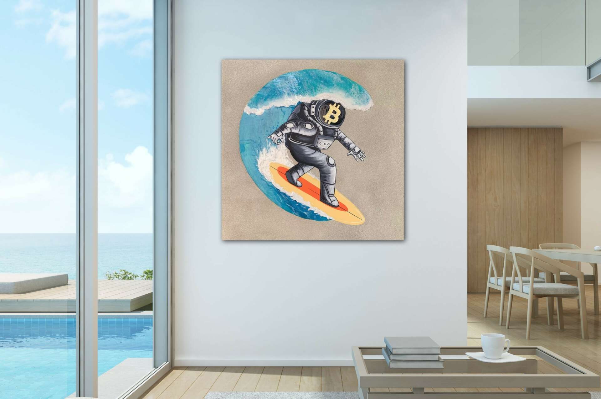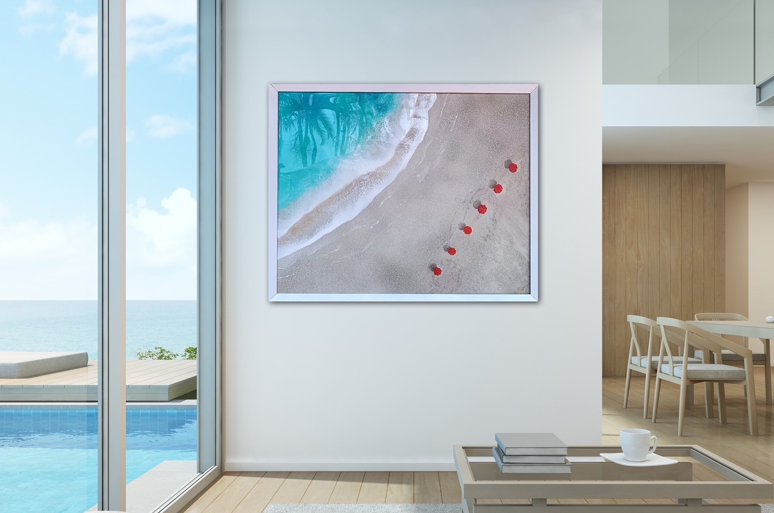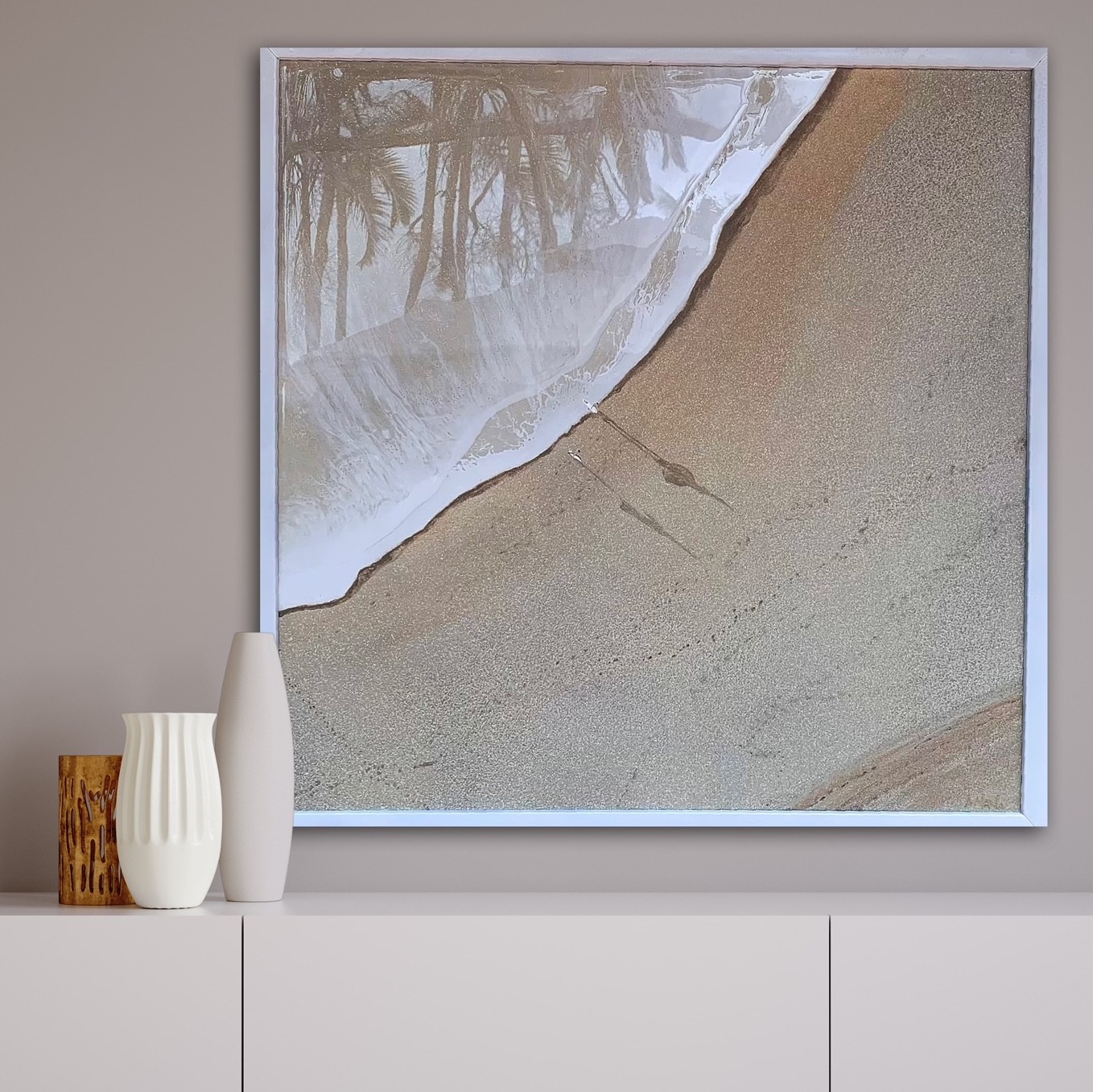 Her current collection focuses on aerial seascape paintings featuring textured sand and realistic oceans made with epoxy resin. Her life like waves pull you in and upon a closer look you are delighted by her charming ‘tiny’ details such as mini beach umbrellas, surfers, boats & beachcombers.