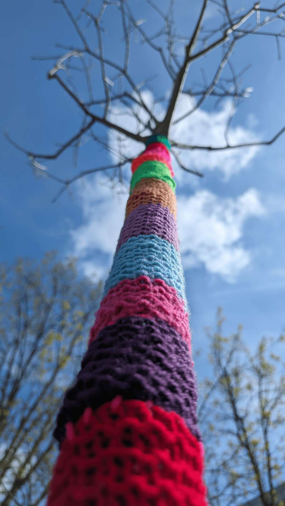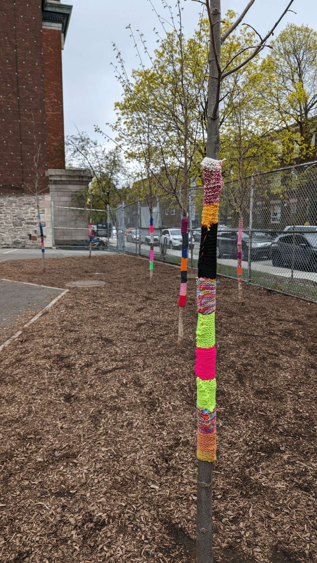 I’m a visual artist from Montreal, Québec who works with textiles. I have a master in Visual arts and I work mainly in the educational sector. My practice is divided in 2 categories: yarnbombing and soft sculptures installations. So for the first part, I teach knitting workshops to create collective yarnbombing, which is the art of covering urban elements (lamp posts, public benches, trees…) with knitted yarn. I often say that I knit sweaters for trees. I think it’s a funny and evocative way to put it! I founded a collective called Les Ville-Laines in 2011 and have been doing it since then. For the second part, I have this ultra-experimental way to use needlework -whether it’s knitting, sewing or felting- in which I just need to explore different ways of using the tools and the fiber in order to create mutant-looking shapes that look like rocks or corals. I do this usually during artist residencies in schools or gallery contexts.