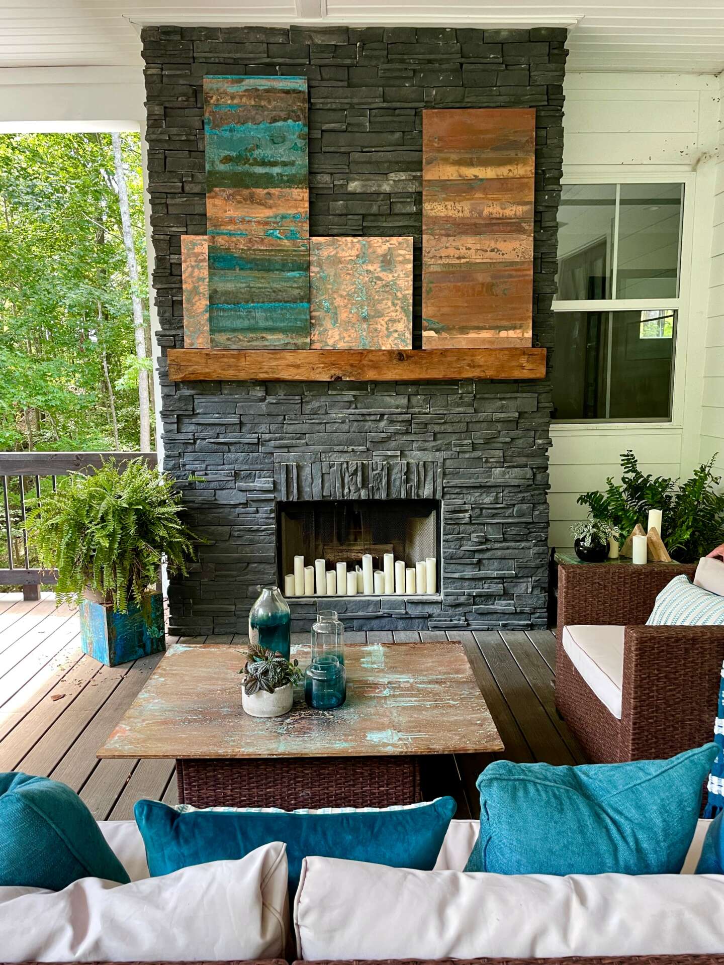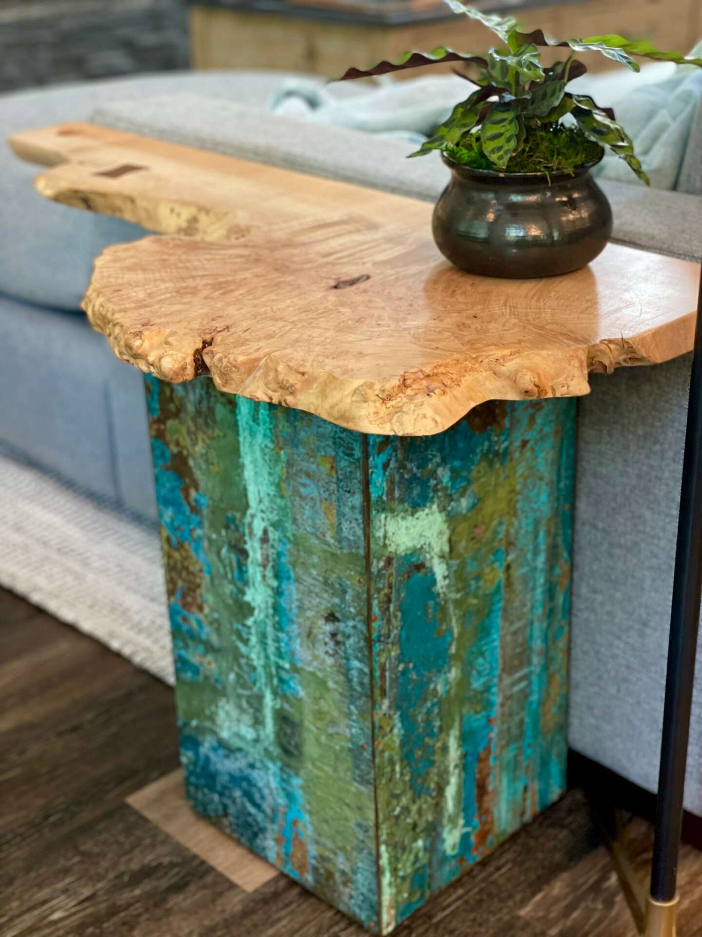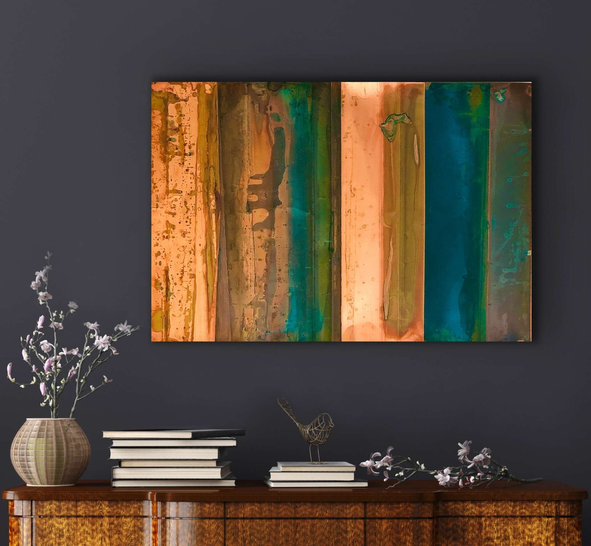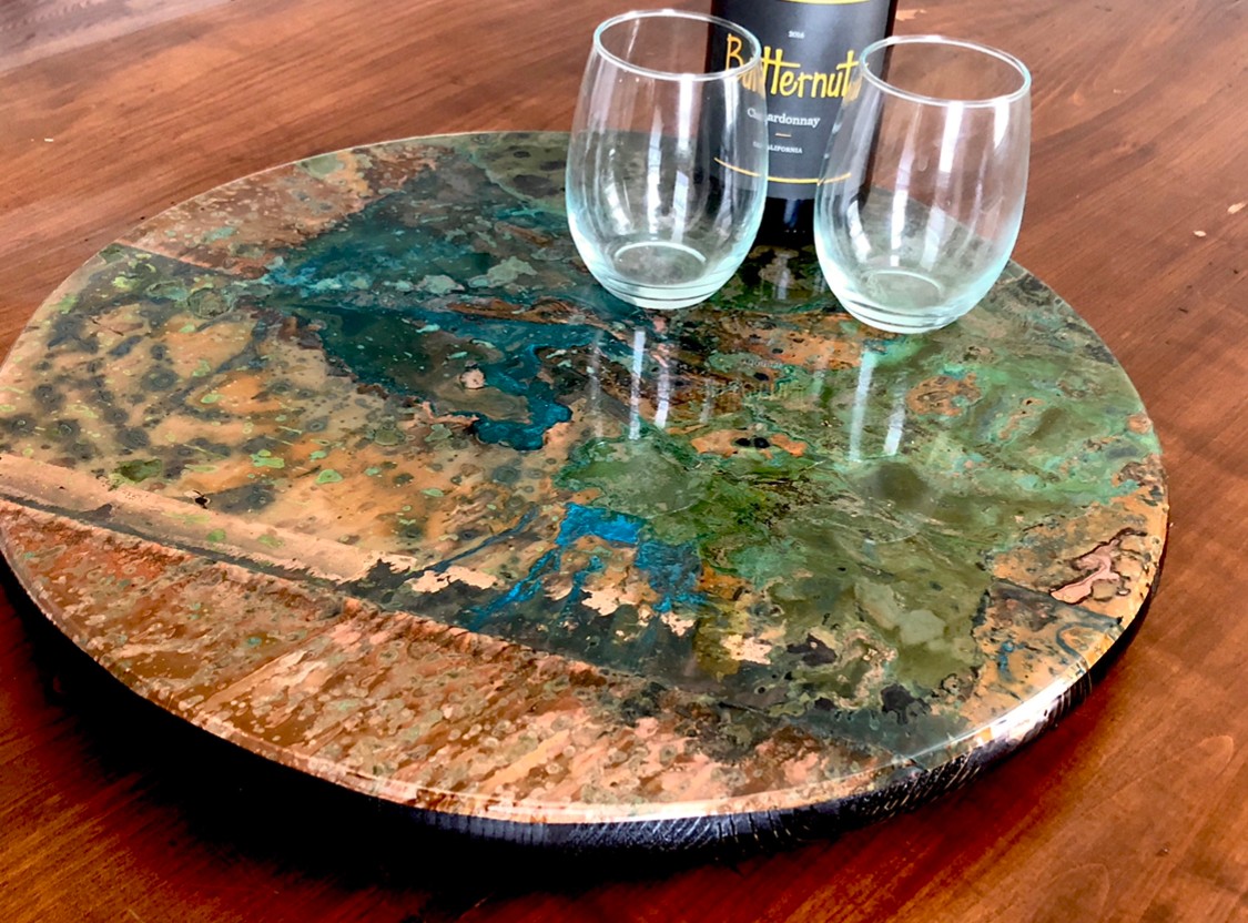 Copper became interesting and curious to me about 8 years ago while I was touring craft distillery’s. I kept seeing copper stills and apparently that manifested somewhere in my subconscious. About a month later, I found myself looking at small sheets of copper and wondering how I could create a patina on it. I looked for mentors/teachers to take classes from but none were offered. So I began experimenting with different chemicals to see what reactions I could get. I was totally hooked at that point and have never looked back. I couldn’t believe the colors I could create from copper. I am still in awe every time I am aging the copper. It’s absolutely exhilarating to me when I unroll a piece of copper that I have been aging and see what has emerged. Copper is such a beautiful and organic element to create with. The colors and patterns are endless. So many different “feels”.