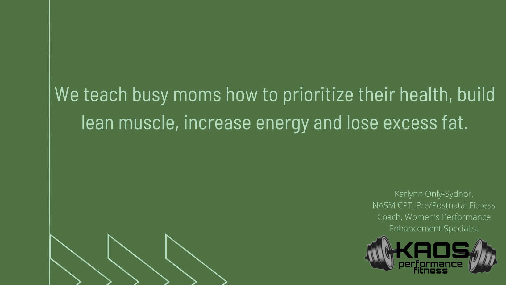 I started KAOS Performance Fitness to help moms perform better in life. Moms have a tendency to put their health on the back burner while taking care of their families and excelling in their careers. This results in moms losing themselves. They often feel anxious, stressed and overwhelmed because they don’t take time to put themselves first. The goal of KAOS Performance Fitness is to teach moms how to prioritize their health and fitness, reduce stress and pain while increasing lean muscle and reducing fat. We specialize in women’s fitness which includes, pre/postnatal fitness, perimenopausal and menopausal fitness. The training programs we create are for long term mental and physical health. They teach you how to incorporate exercise and healthy eating habits into your daily routine, so taking care of yourself becomes a non-negotiable part of your day. What sets us apart from other personal trainers is that we offer three options of training program durations, 3, 6, or 12 month options. And clients can feel comfortable talking about their hormones, their periods, their pregnancy & postpartum symptoms, and their menopause symptoms. I am proud that the KAOS Performance Fitness brand is becoming the go to personal trainer for moms in my community. We have solidified that we are experts in women’s fitness and it shows in our clients’ results.