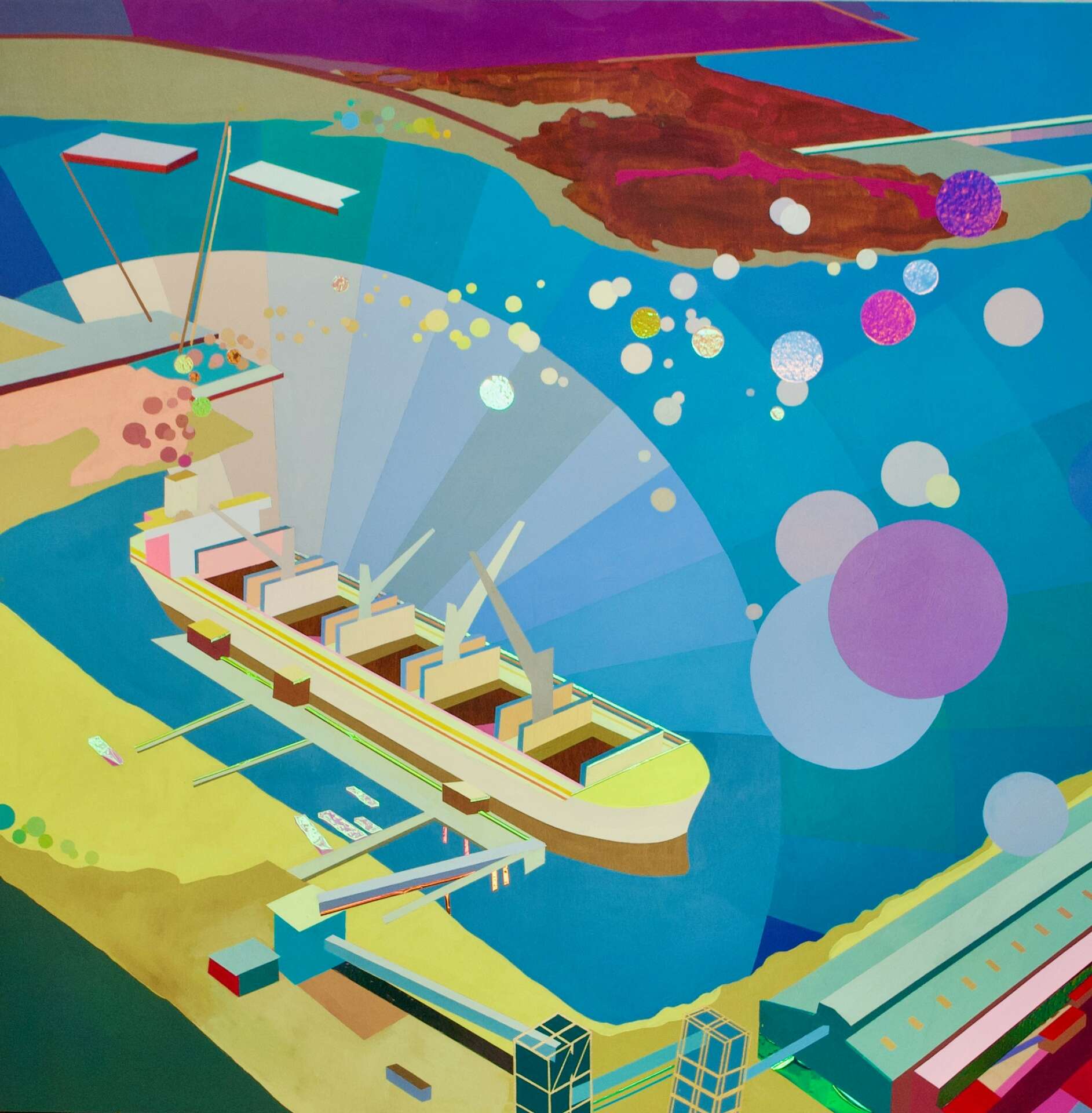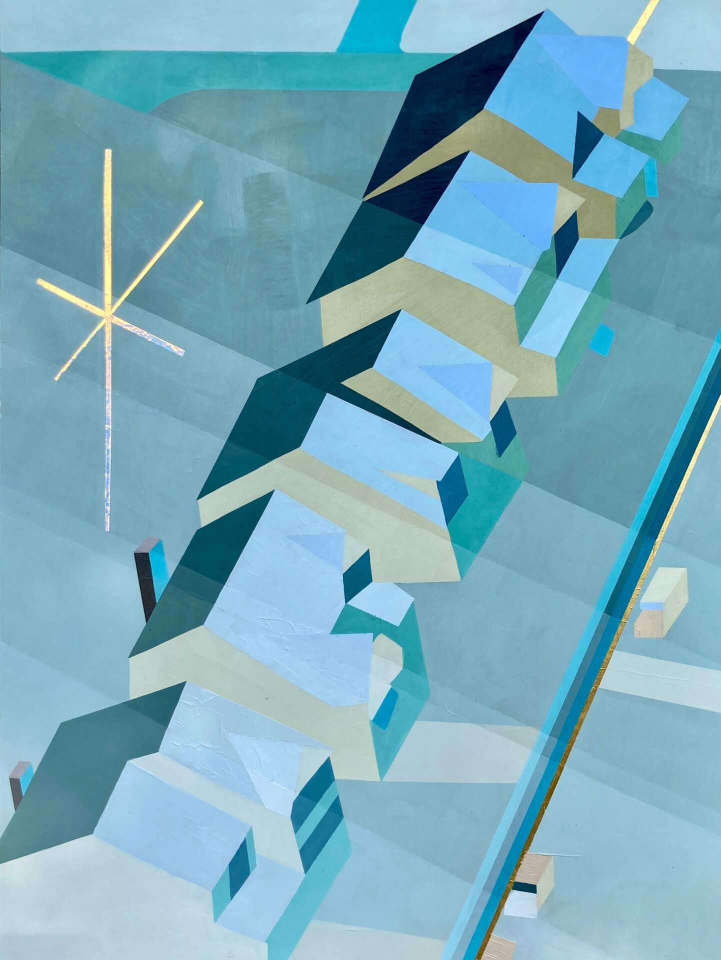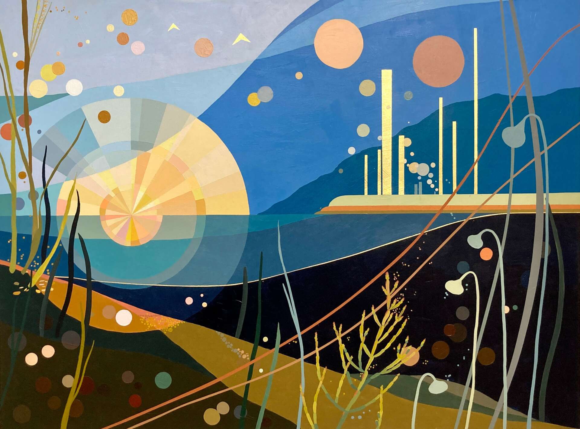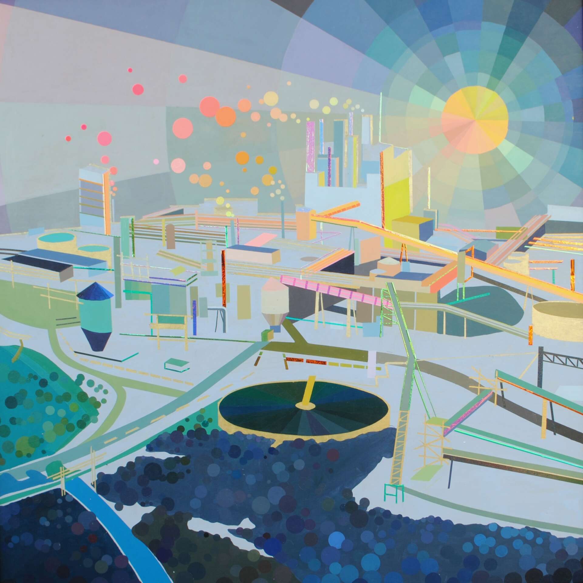 My work has evolved a great deal from when I started as a painter. I have always been attracted to human development and the industrial landscapes that surround my everyday life. Over time, as I practice non-judgement, I find that my work has become more bright and colorful, almost optimistic. I like this juxtaposition of buildings and factories and ships with golds and brilliant hues. These artifacts of industry and progress are not apart from our environment, they are our environment. I am proud that I am finding peace with myself in my world through art-practice and I hope the viewer will navigate through my peaces in a way that serves them also.