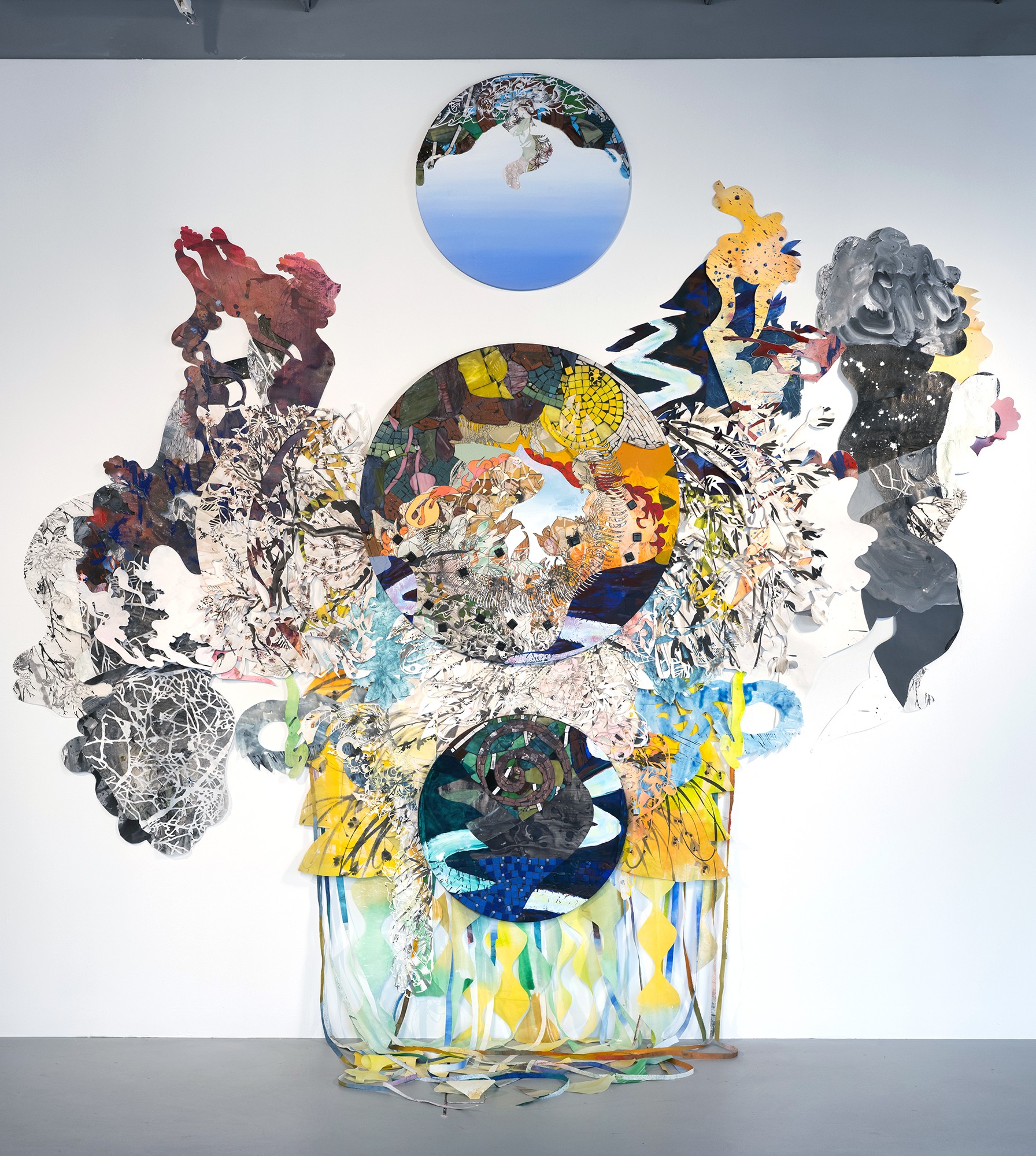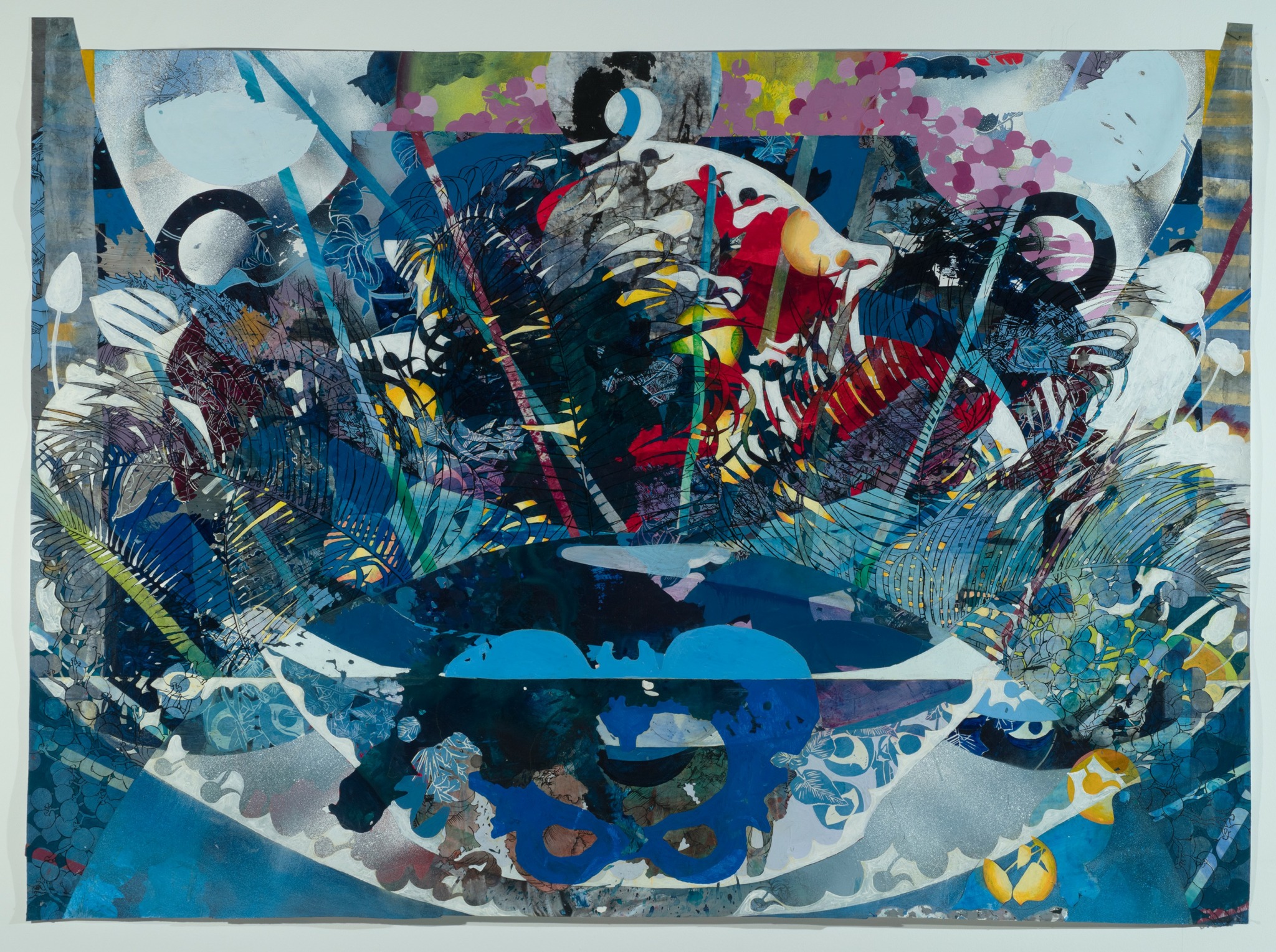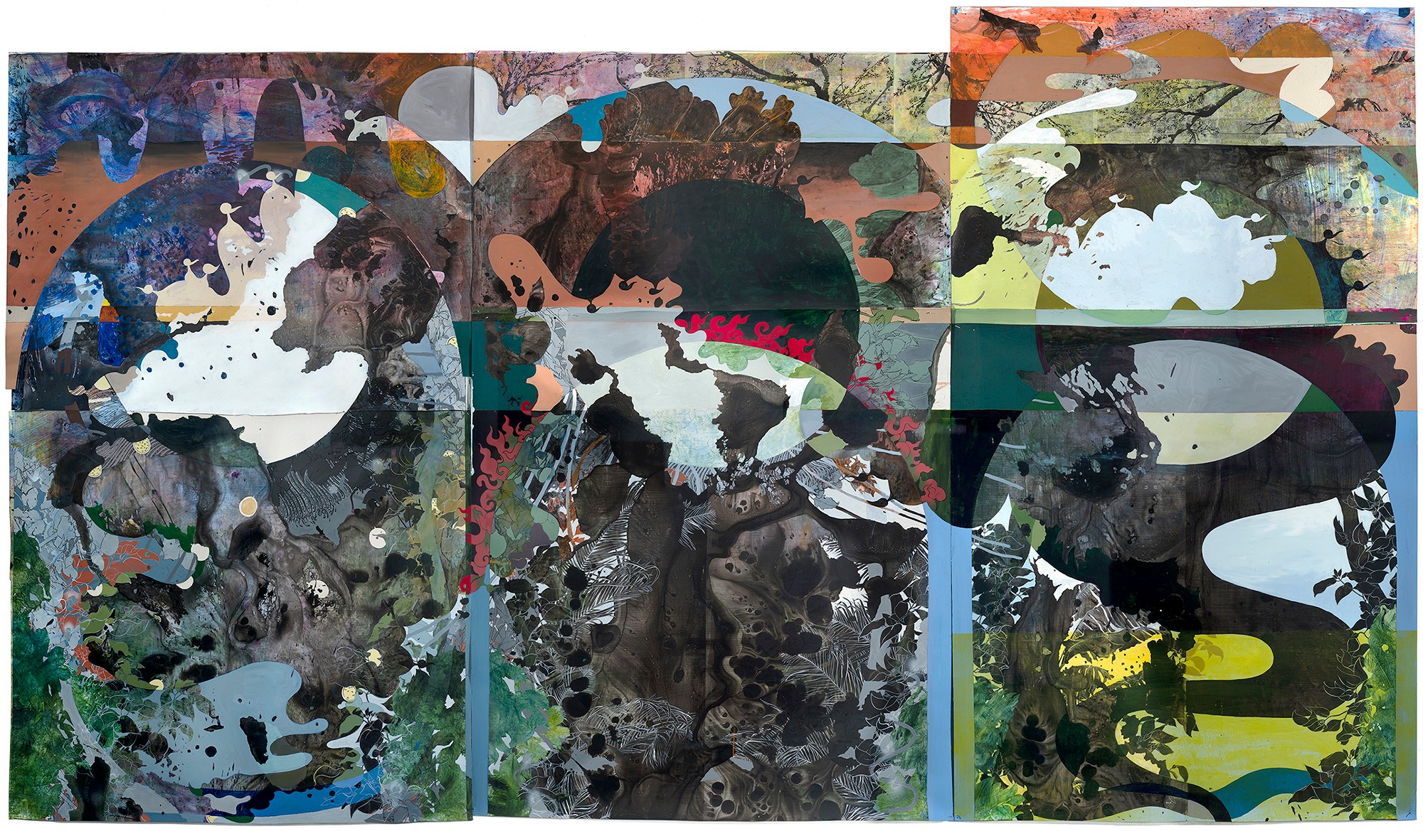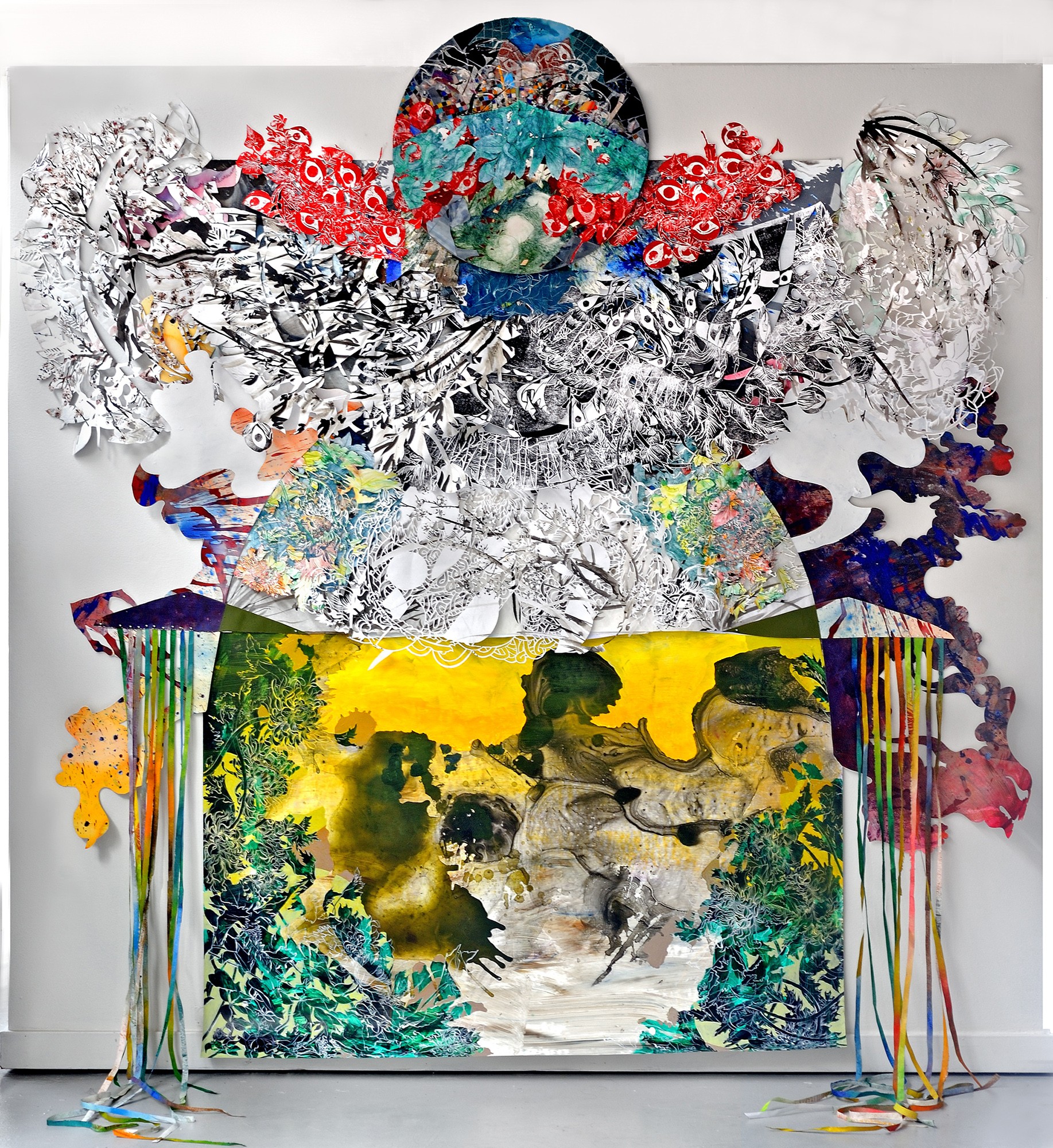 I’m a visual artist mostly working in painting. I examine landscape painting, environment, and myth making by building luxuriant, cinematically scaled paper paintings and installations. These combine romantic, utopian and immersive sensibilities from both Chinese and Western landscape painting with a lexicon drawn from a personal mythology informed by my identity as a biracial, second generation Asian American: ribbons, baubles, bats, peaches, sperm, piles of flowers repeated so many times as to appear biomorphic and alien, but bursting with incongruous efflorescence. These pieces have two primary concerns: the exploration of landscape in a world where “landscape” is defined through an ever-widening field of digital, graphic, and visual forms, and the insertion of personal world building—a world of fragmentation, hybridity, and incongruity—into that history.