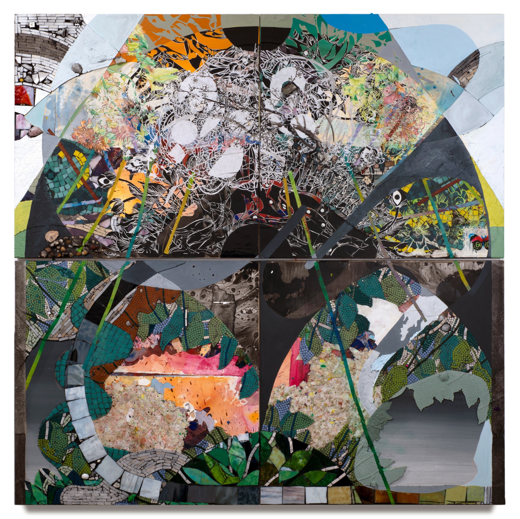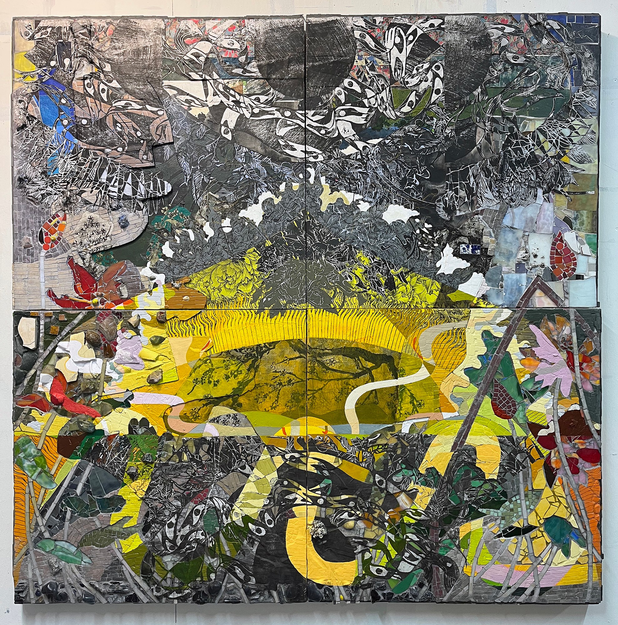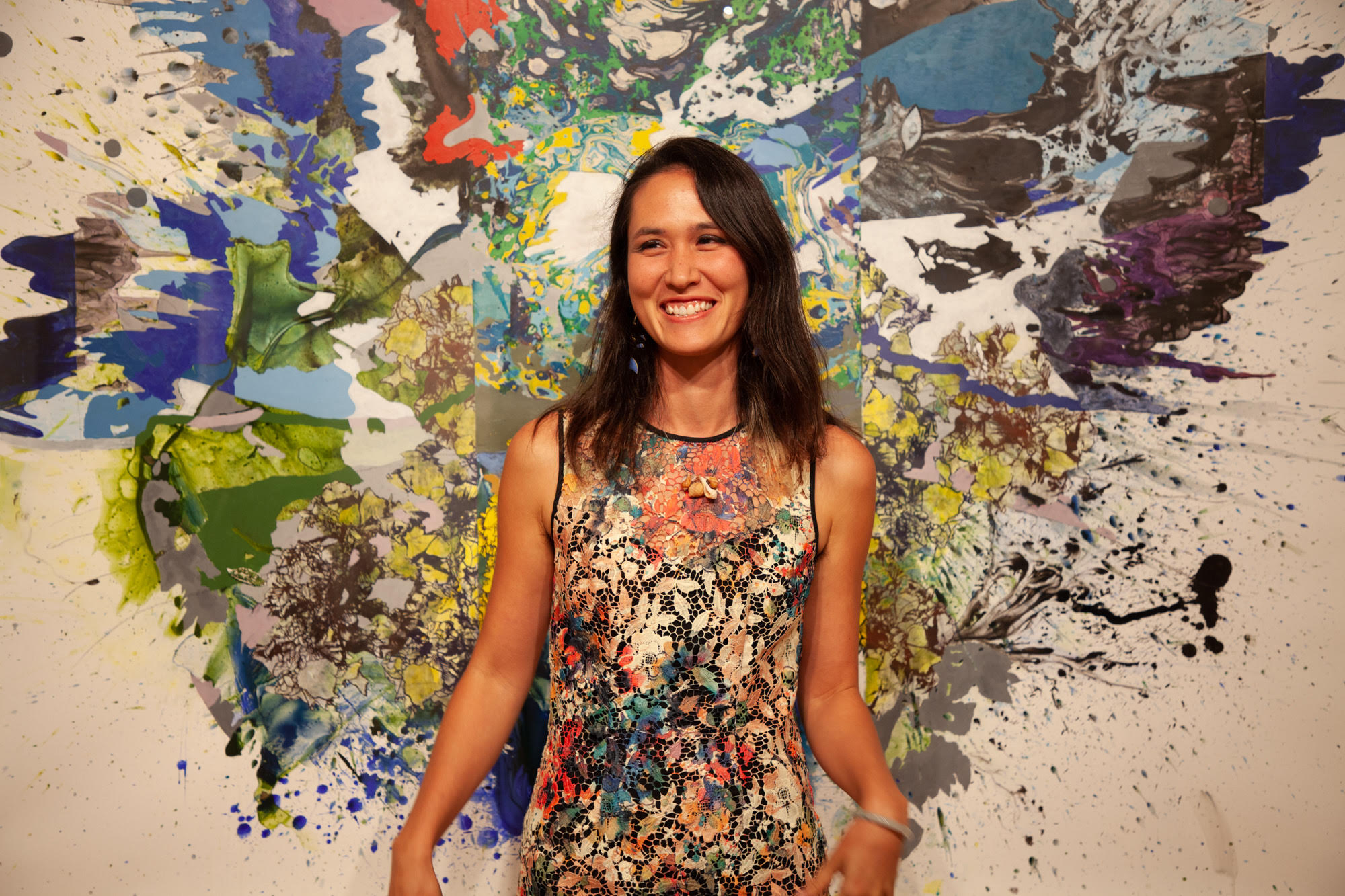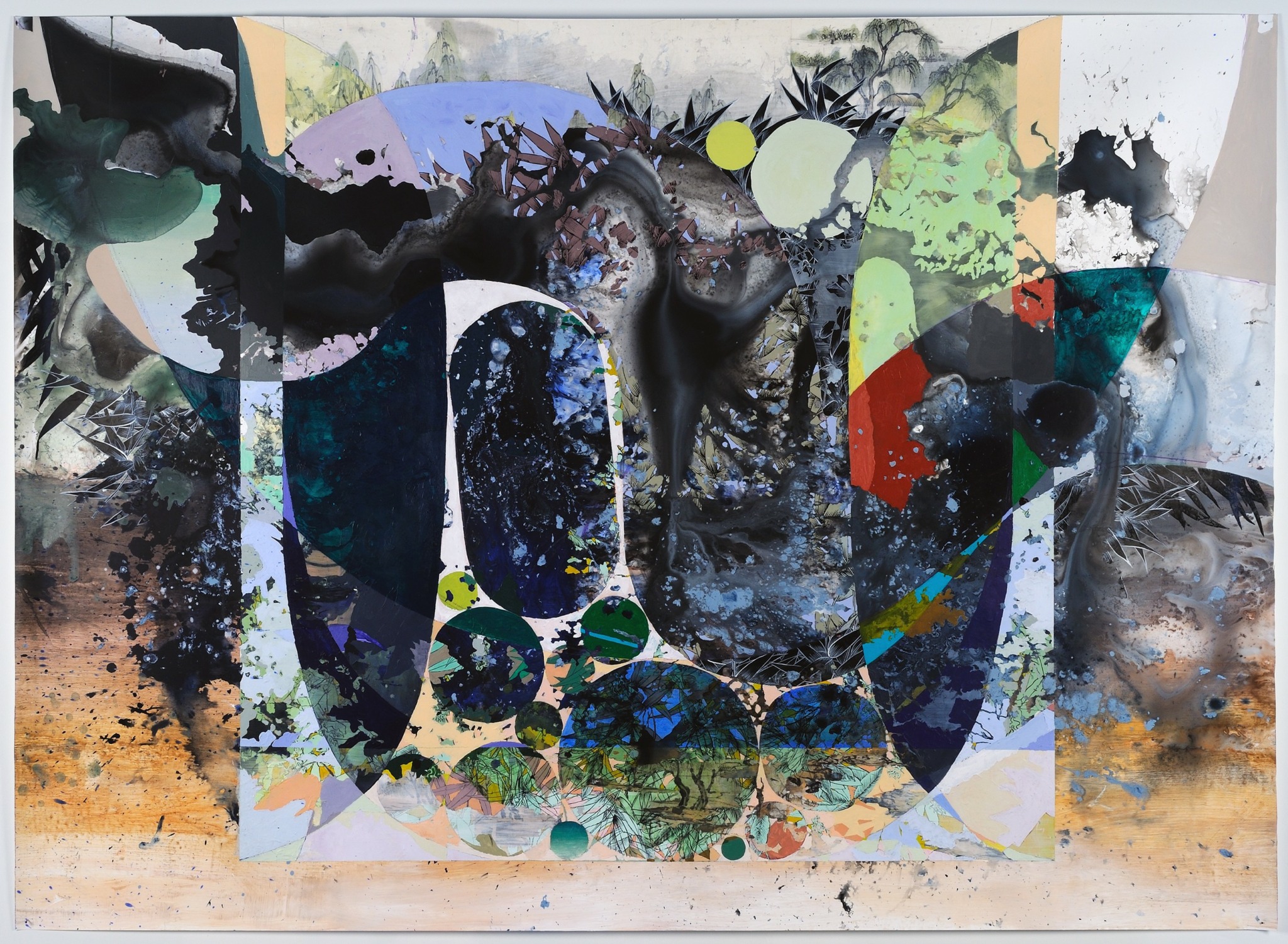 I’m a visual artist mostly working in painting. I examine landscape painting, environment, and myth making by building luxuriant, cinematically scaled paper paintings and installations. These combine romantic, utopian and immersive sensibilities from both Chinese and Western landscape painting with a lexicon drawn from a personal mythology informed by my identity as a biracial, second generation Asian American: ribbons, baubles, bats, peaches, sperm, piles of flowers repeated so many times as to appear biomorphic and alien, but bursting with incongruous efflorescence. These pieces have two primary concerns: the exploration of landscape in a world where “landscape” is defined through an ever-widening field of digital, graphic, and visual forms, and the insertion of personal world building—a world of fragmentation, hybridity, and incongruity—into that history.