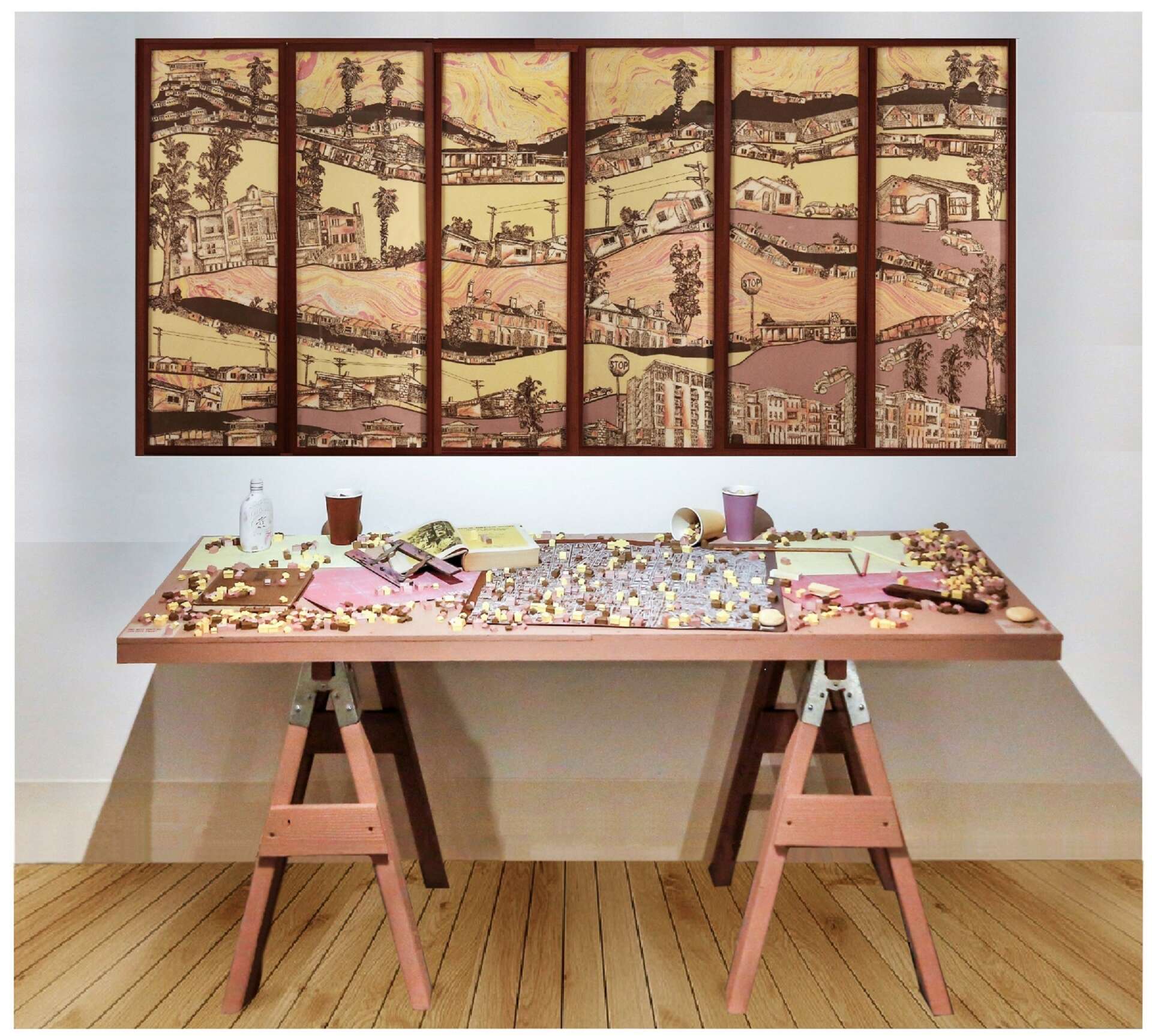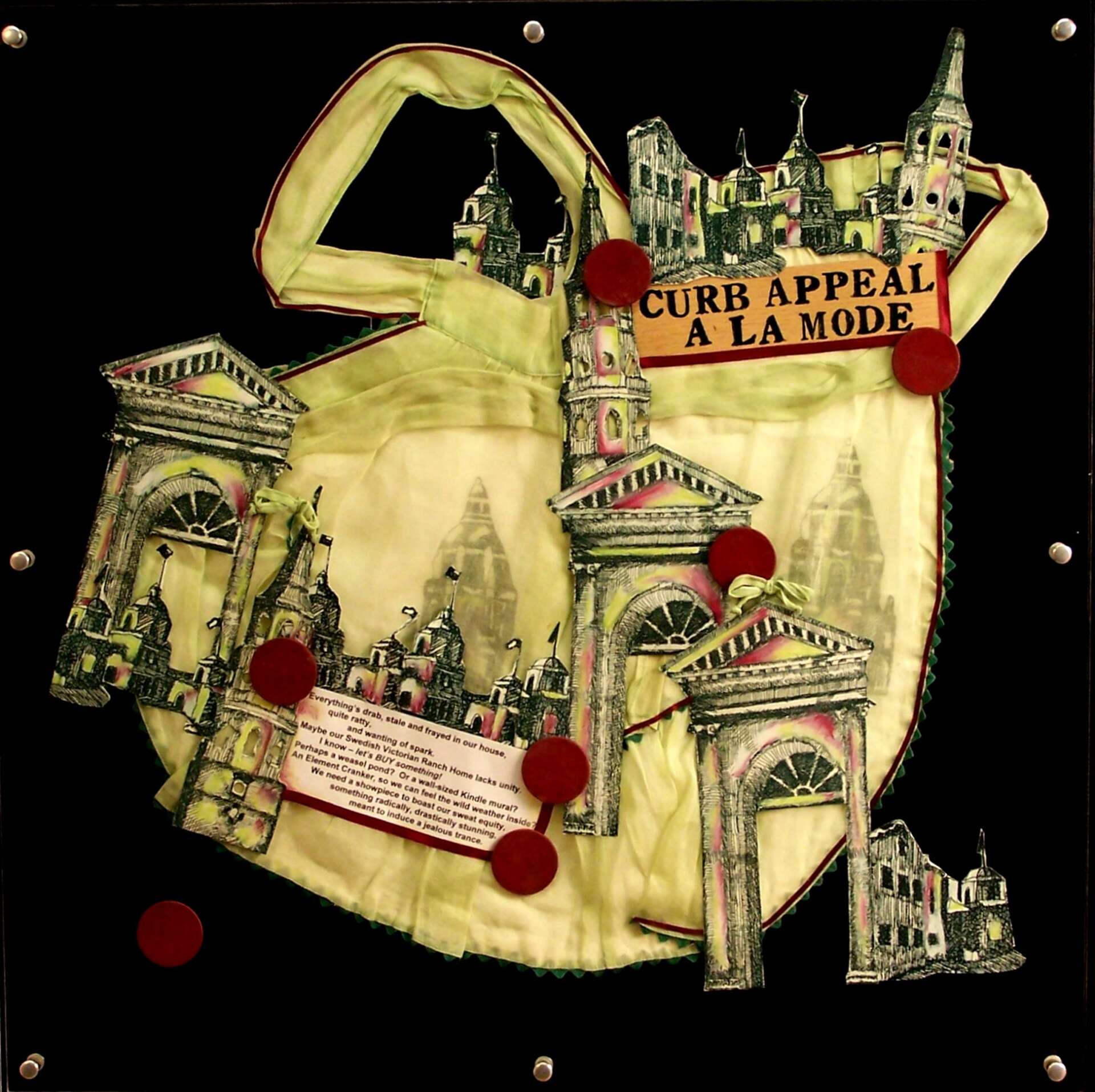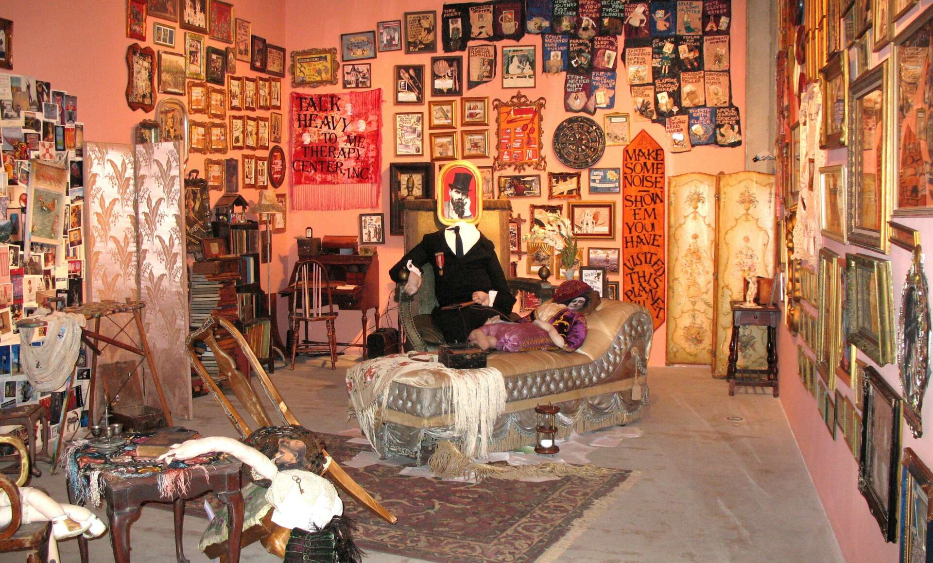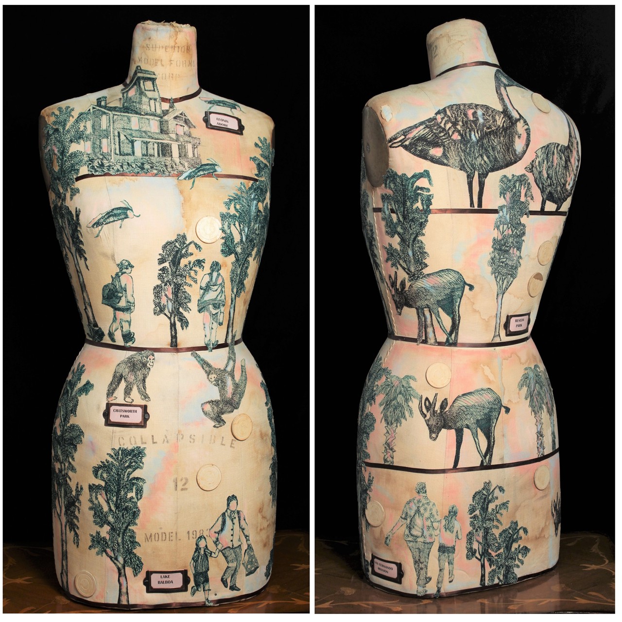 My mission to serve as a ‘guerrilla sociologist’ implies that I can function both inside and outside of Los Angeles culture. Although I’d be the first one in line to buy a trendy pet rock and get sucked into that flurry of sentimentality, I am also an analytical cynic, getting headaches from lots of eyerolling. Three particularly meaningful projects that I have tackled include a two room installation at Barnsdall Municipal Galleries called TALK HEAVY TO ME, a commission that describes the weird underpinnings of Woodland Hills, and a 25 panel mural done by myself and my students in the Admin Building at Taft High School. TALK HEAVY TO ME portrays my alter ego, Blotista Paradisimo, as she confronts her demons and delights in a Victorian Therapy Center. The Woodland Hills commission reflects the enthusiasm of producer Rolin Jones, and tells bombastic, historical, and freaky tales of this seemingly quiet community. The Administration Murals at Taft High School took 25 years to complete, including hundreds of students from diverse ‘hoods in Los Angeles. For me, ‘meaningful’ is instructive — what patterns and conclusions can I draw about human nature in Los Angeles?