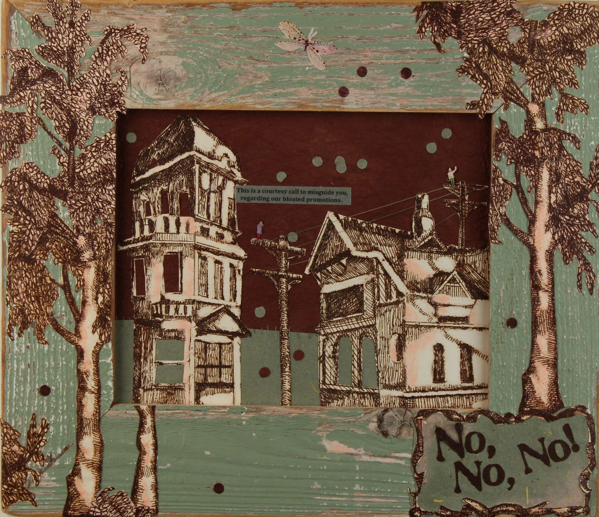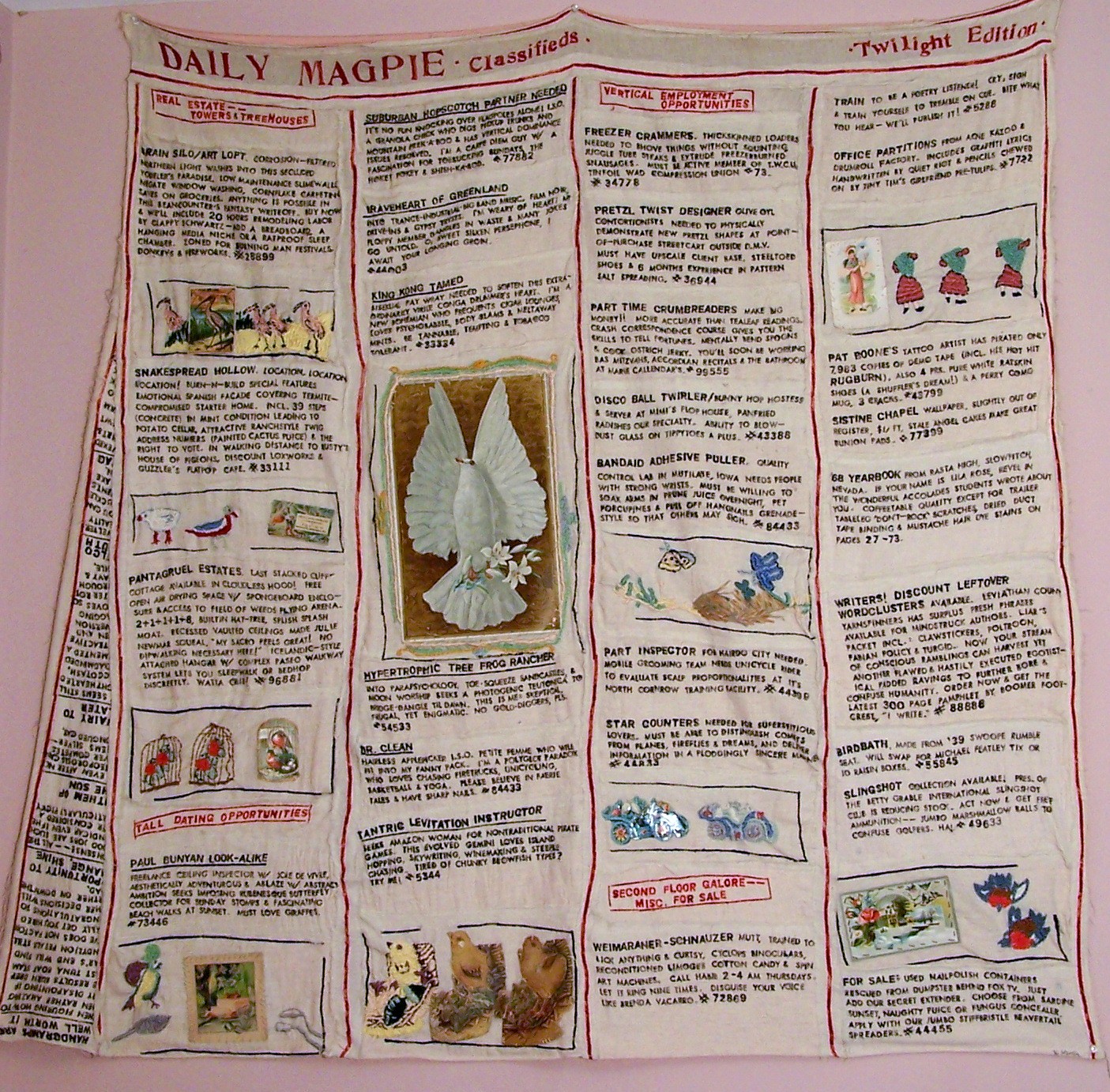 Through my artmaking, teaching, and lifestyle, I want to sway people, especially young people, to pursue their individualism, quirkiness, and passions in a huge overthrow of corporate conformity. I want to inspire them to come to their own conclusions, to risk creatively and trust themselves. One side effect of emerging technology is that we can choose to hide inside their statistics and become invisible. One wall-hanging in my Talk Heavy To Me Installation advises the viewer to “Make some noise! Show them you’ve visited this planet!” My mission, as an artist and teacher, is to reignite the individualism that we used to enjoy decades ago. A lot of my work is self-therapeutic and I hope that viewers will relate. For example, I used to get upset when cars would swerve around our canyon road loudly, waking us up. Then I did a piece called Bottleneck that infused humor into the situation through exaggeration and finger-pointing to our hussly-hassly commuter hours. From then on, after expressing my frustration, I was able to turn an irritating situation into a parody of city traffic. I have a hearty sprinkling of kumbaya-we’re-all-in-this-together in my work. It feels good to counteract the hundreds of hate groups in this country by taking an every-man stance.