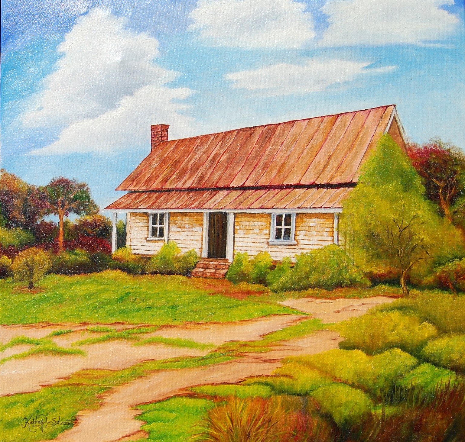 I retired five years ago and the first thing I wanted to do was take art lessons. I had always been an art lover, visiting galleries and art markets, and I knew I wanted to learn how to paint. I started working with a wonderful teacher who remains my mentor and now, a friend. My original goal was simply to learn to paint and be able to generate art for my home and for friends and family. My first sale was by accident. I saw a lovely watercolor painting of a guitar on Pinterest and I really wanted to paint it in oil – my favorite medium. I contacted the artist and asked permission to paint it in my style and she freely gave it since it was for my grandson. At her request, I sent her a photo of the completed painting and she loved it. Her husband had his own band and he loved my painting so I did one for him as a thank you for allowing me to use her watercolor as an inspiration. From there, other members of the band wanted a painting of their instruments so “The Art of Kathy Street” was born and I ended up painting and selling three more to the band members. Now, I focus on enjoying painting, still doing art for my own home and family, but I also do commissions.