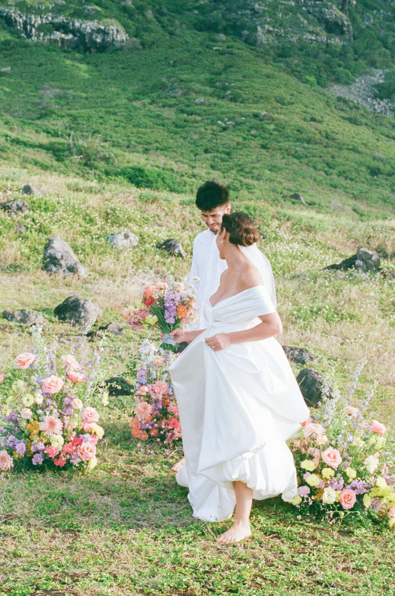 I stumbled upon an old flower cart by the dumpster of a shop and asked the owner if I could buy it from him. My husband helped me fix up this flower cart, and I signed up for a few markets around O’ahu. My first year in business, I was doing pop-ups every weekend as a ‘build-my-own-bouqet’ style, sourcing more romantic + whimsical flowers, rather than the tropicals usually at the markets.