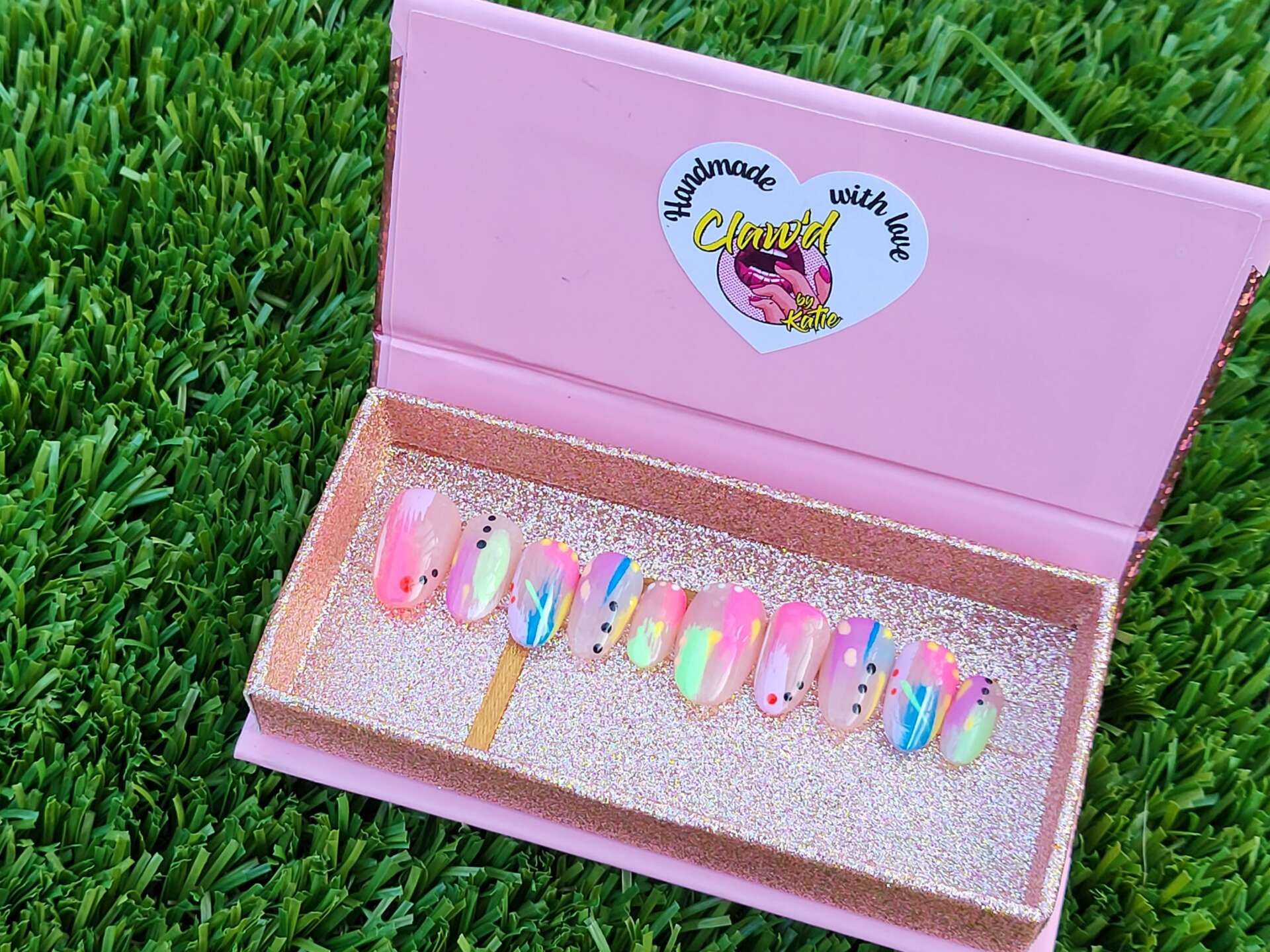 In all honesty, I guess you could say I stumbled upon my passion to create beautiful nail art and use nails as my canvas. I was shopping around on Etsy looking at some nails I wanted to purchase when my boyfriend said why don’t I make my own. I looked at him like he had 10 heads and thought to myself Ya, ok, sure. Little did I know, he had planted a seed that would ultimately lead me to creating my own press on nail business, Claw’d by Katie. I started by learning as much as I could to start through YouTube and purchasing items, I had learned about to help create my nails. I remember my first set being not up to par and thought there was no way I could do this, but I took that negative thinking and decided to keep pushing forward and teaching myself, reading articles on techniques and products that were good to use, watching tutorials. Not long after I started to notice my work improve significantly. The time came when I knew I wanted to open an Etsy shop, so I got with my friend Mel who created my amazing logo, and it was then where it all started to come together. The joys and happiness I felt was electrifying and I remember thinking this is really the beginning of an amazing journey. My shop, ClawdDesignsByKatie went live via Esty, and I remember thinking I don’t care how long it takes to make a sale, the fact I accomplished this with all the doubt I had in myself was something to be proud of.