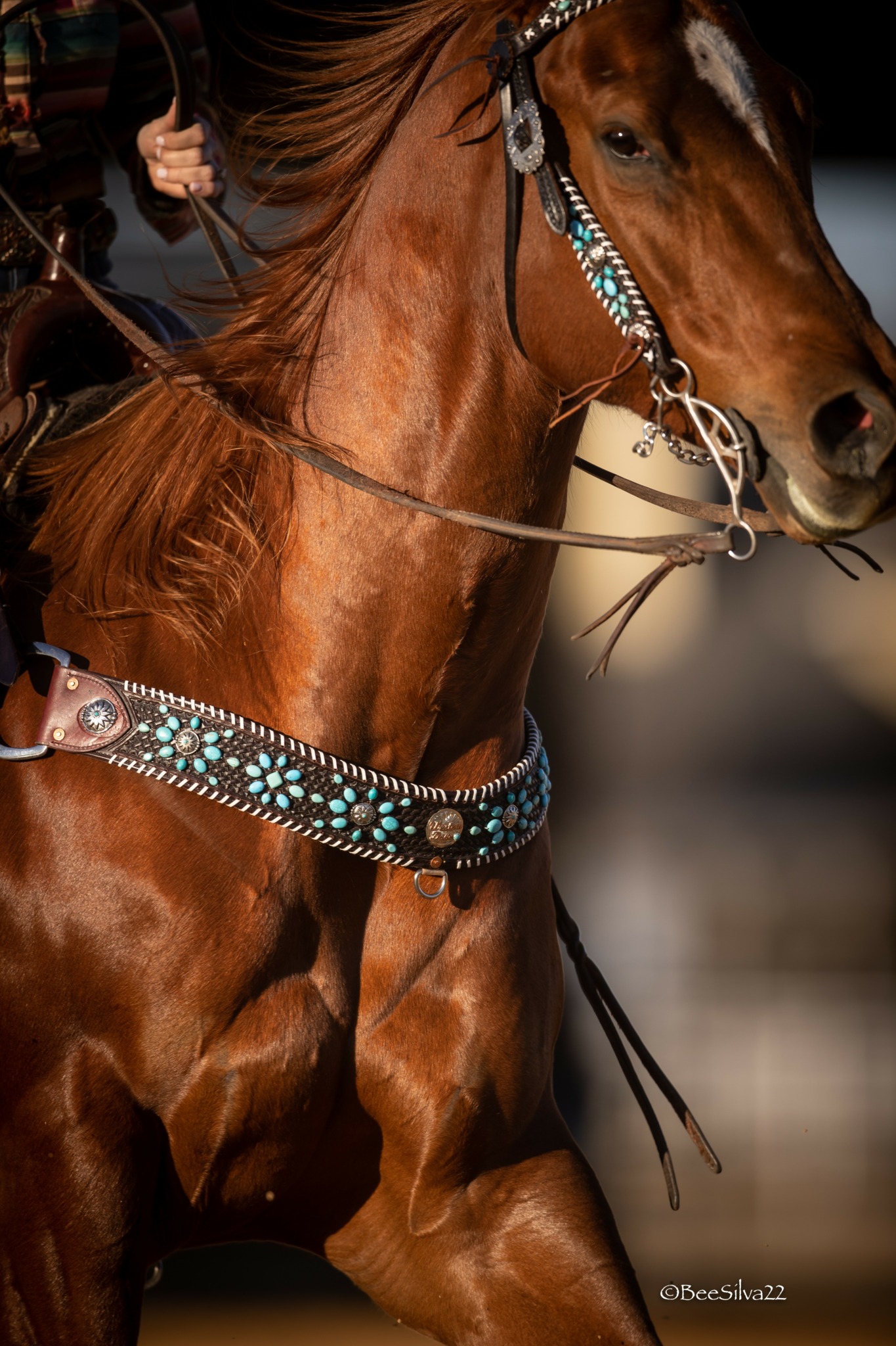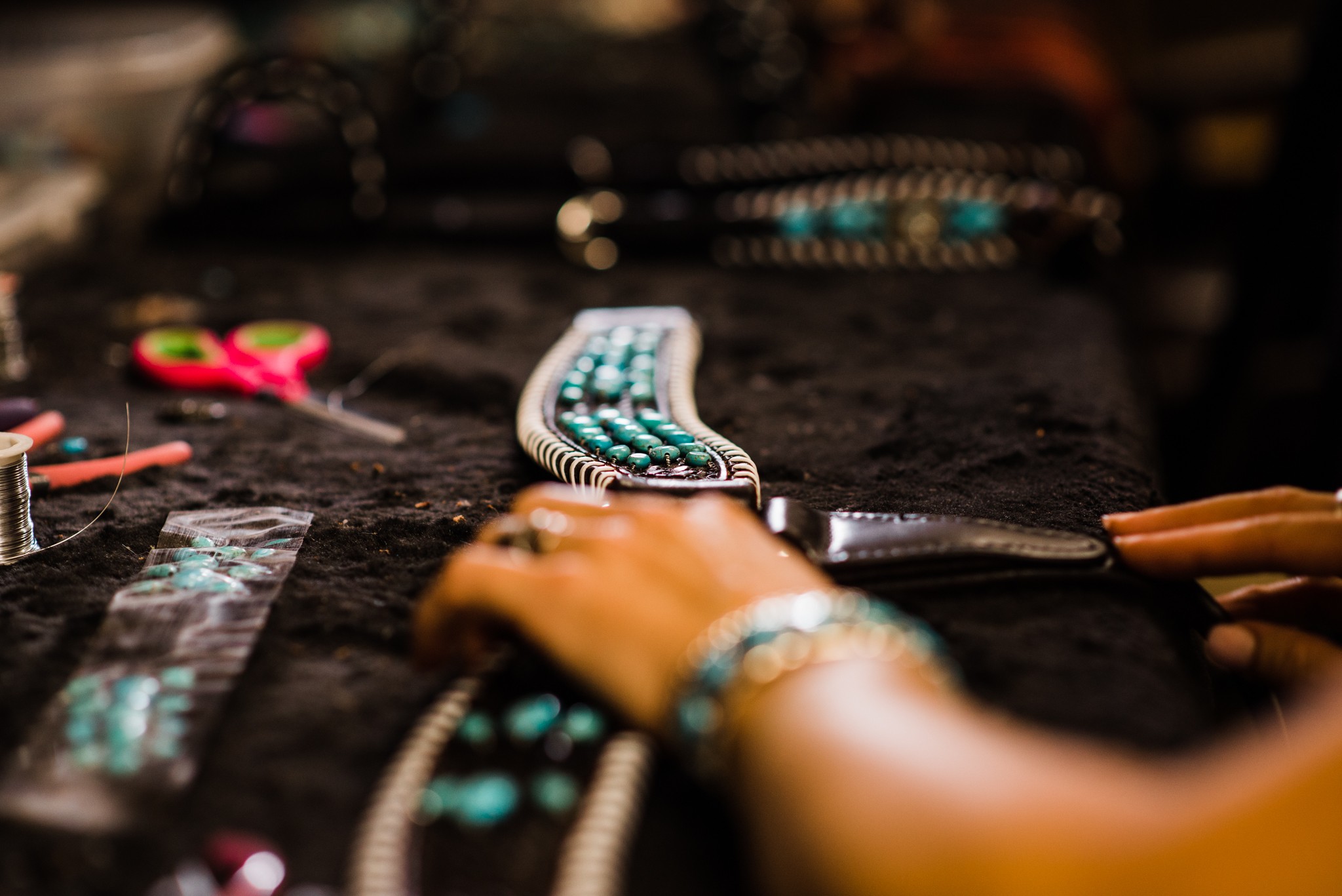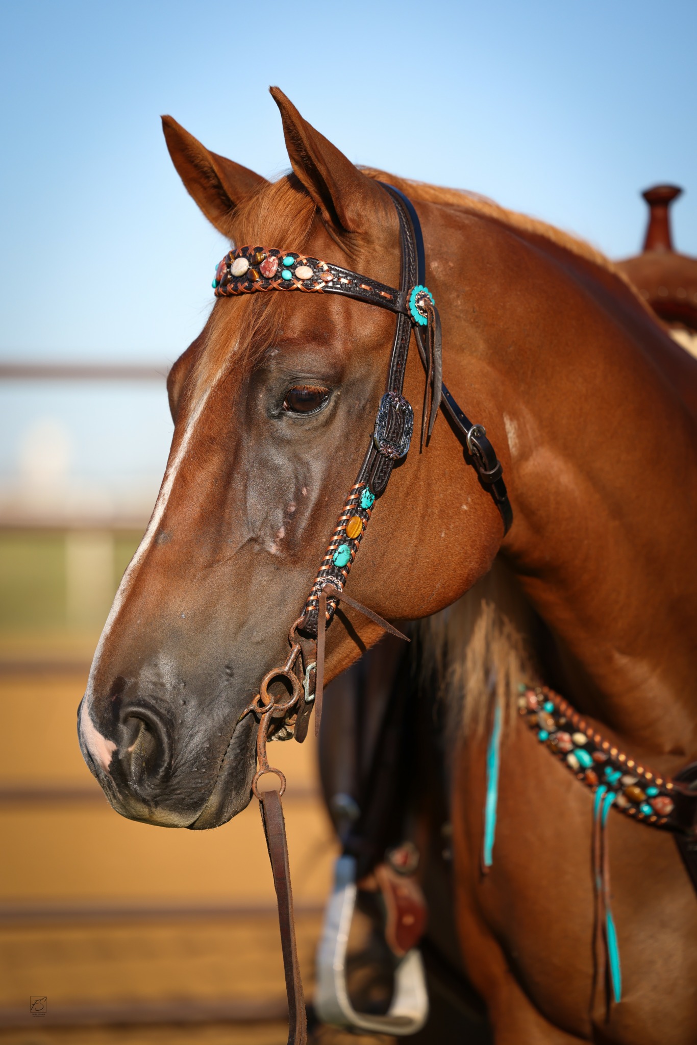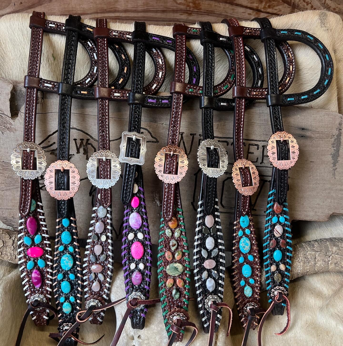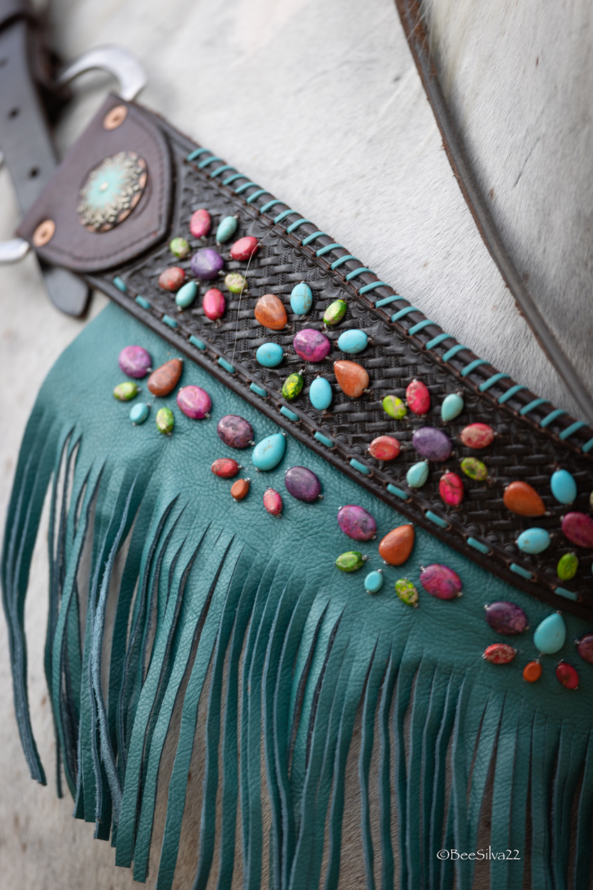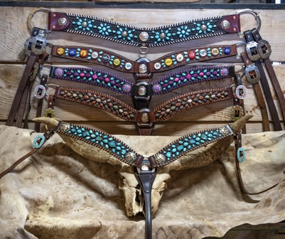 After some experimenting and failures, I developed designs on the leather horse tack by attaching Turquoise. I was inspired by a Navajo bracelet given to me by my husband on our wedding day, and I felt it was a true representation of the American West,