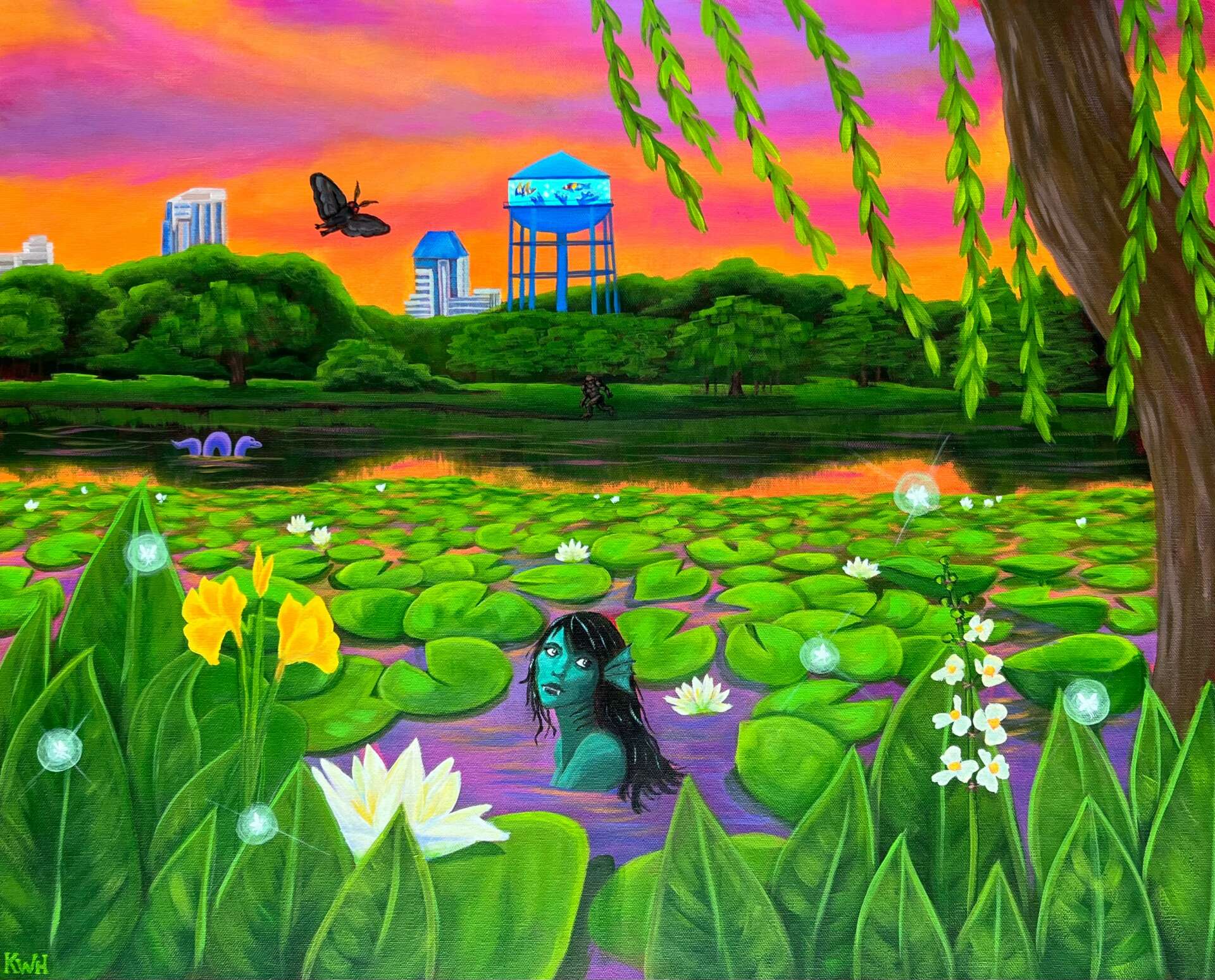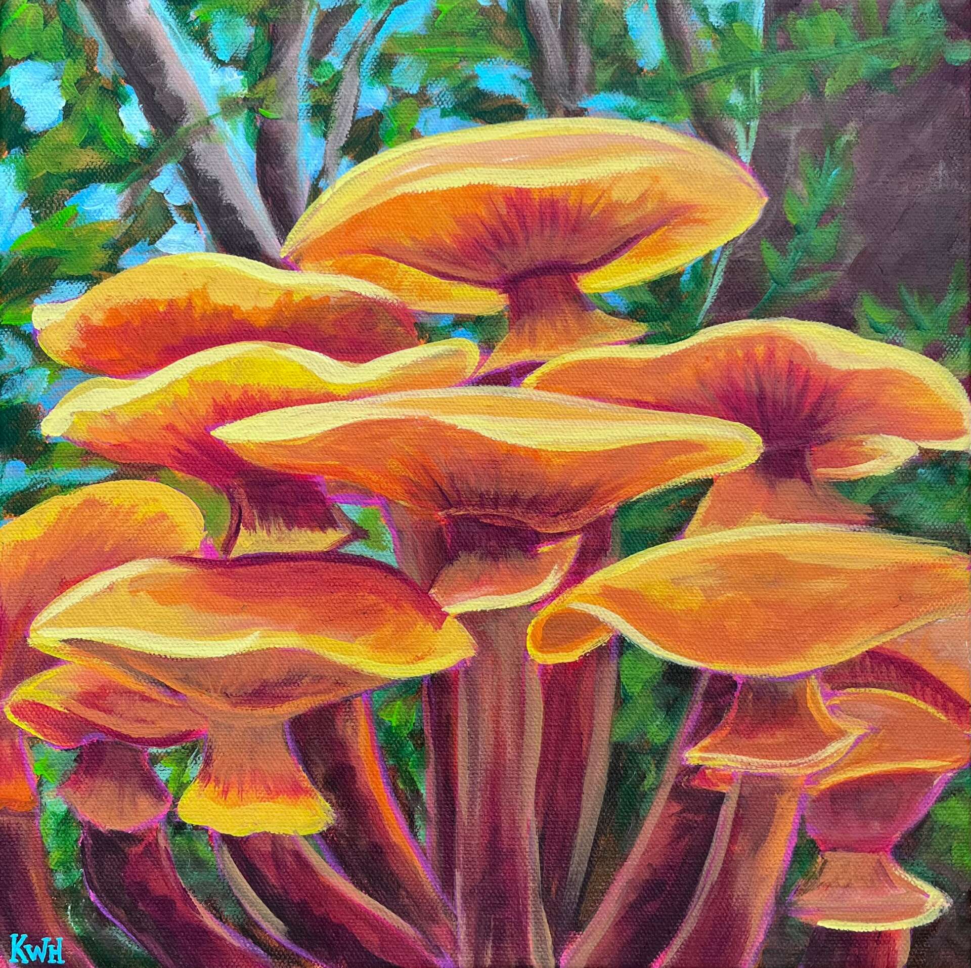 Outside of my own weird, original paintings, I sell lots of merch (including prints and stickers) at local markets and art shows. I have also done quite a few custom paintings for my clients and I am always looking for more commissions that allow for some creative freedom. I also recently got into mural painting and I absolutely love painting large scale. I love the idea of doing bright, vibrant murals of native plants and animals to educate people about protecting local habitats.