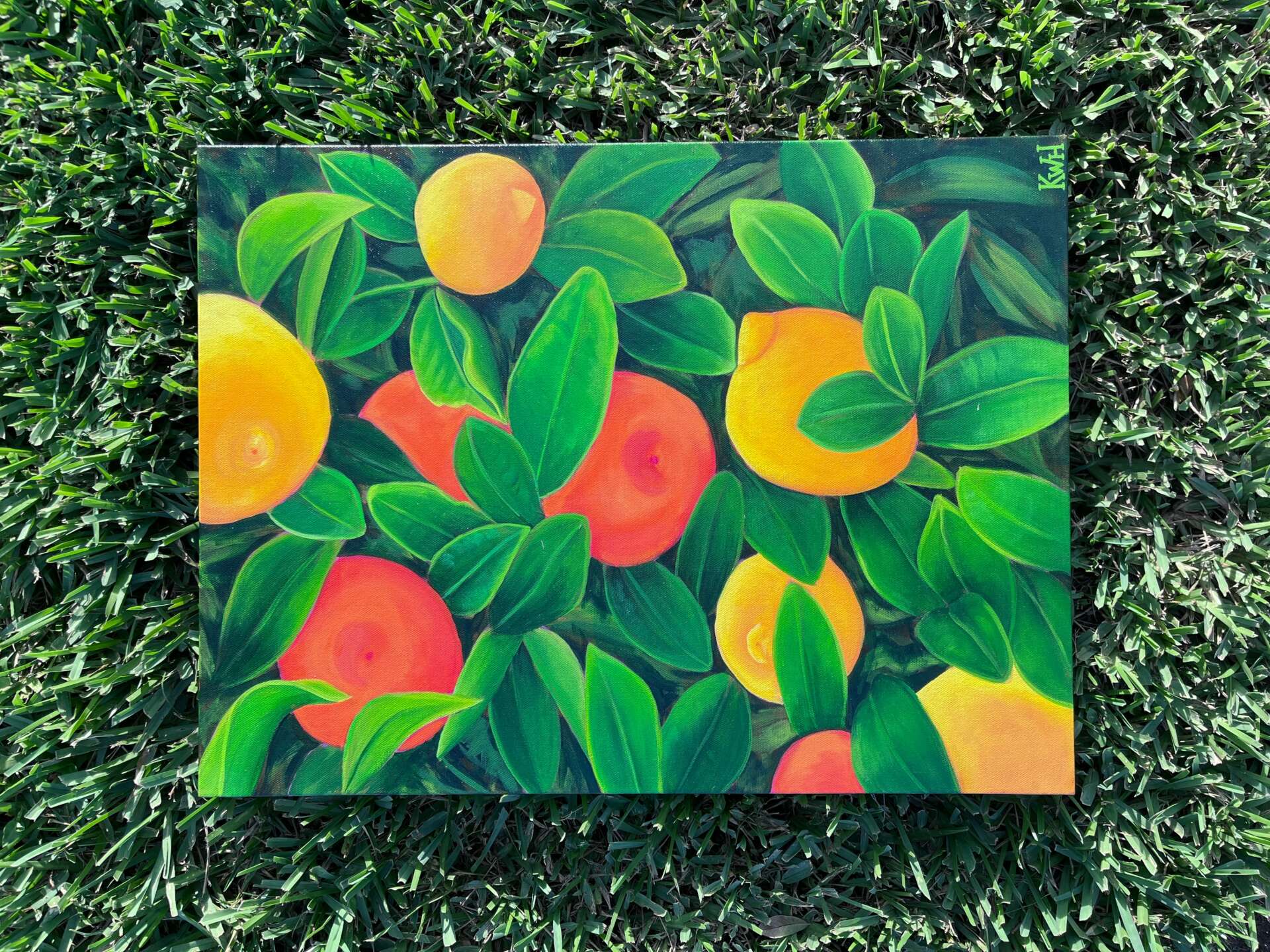 Once I started playing around with mediums, I settled on acrylic paints because I love the way that I can bring color and vibrancy to my work. My paintings started off very plant-focused and consisted of mostly flowers, leaves, and close up images of tropical fruit trees. Once I started developing my painting skills a little more, I started adding more unique and strange elements to my work. I did this whole series of St. Pete and Florida local places using very bright colors and added a UFO to the background of each. At the time, it was just a way for me to play around and experiment, but the series actually got really good feedback from my peers and gained me quite a few local followers.