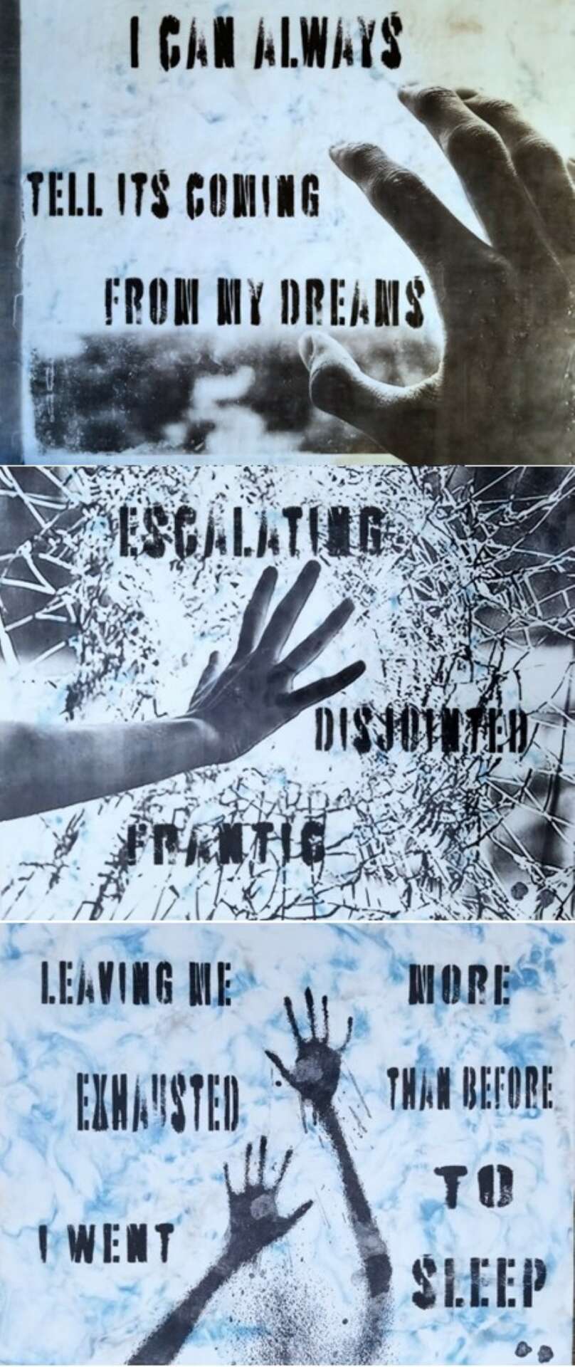 My current project is titled “I Am So Much More.” This project stems from a show I curated on mental illness. Over half of the participants requested to have their works shown under a pseudonym because their bosses, coworkers, family, or friends didn’t know that they had been diagnosed with mental illness. They were afraid of the stigma. This part of the series will consist of 40 portraits of accomplished people with Bipolar disorder, but just their eyes. I love eyes, they’re so personal and anonymous at the same time. Overlaying these eyes are 30 – 40 words that describe the person’s accomplishments, excluding the words “Bipolar” and “Mentally Ill.” These portraits will be 4 feet wide and 2 feet high. The goal is to fill a room with our eyes staring back at you, challenging you to erase the stigma of mental illness.