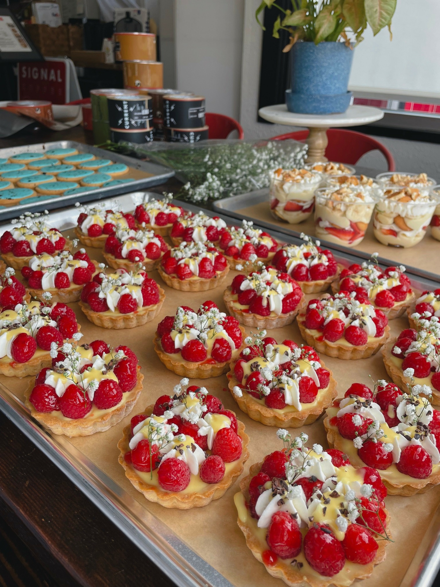 I missed several months of work in 2020 due to a back injury, and then COVID-19 struck, completely altering the food business. I quarantined myself and my family for a while and took time off work to recover my back. After going a few months without working I really missed cooking and I thought holding a curbside pick-up pop-up would be entertaining. Bringing boxes of pastries to people’s cars seemed like a brilliant idea because the pandemic was still going strong and people were trying to avoid contact with each other. I created a post on Instagram that included a tiny selection of my pastries. The first pop-up was so much fun, I made it a weekly event. After word spread, I realized that I was running out of room and capacity and had to cap my orders. The fact that people were eating pastries and returning made me feel very honored and touched. During a period when everyone felt so isolated and alone, it was a great way for me to connect with my community. That was the beginning of Soueld out pastries, and I will always remember that period with wonderful nostalgia! After hosting pop-ups for over two years, I joined together with Signal Coffee in 2022 and began selling my pastries at their cafe. I now serve as their head npastry chef and supply desserts to four East Bay cafes!