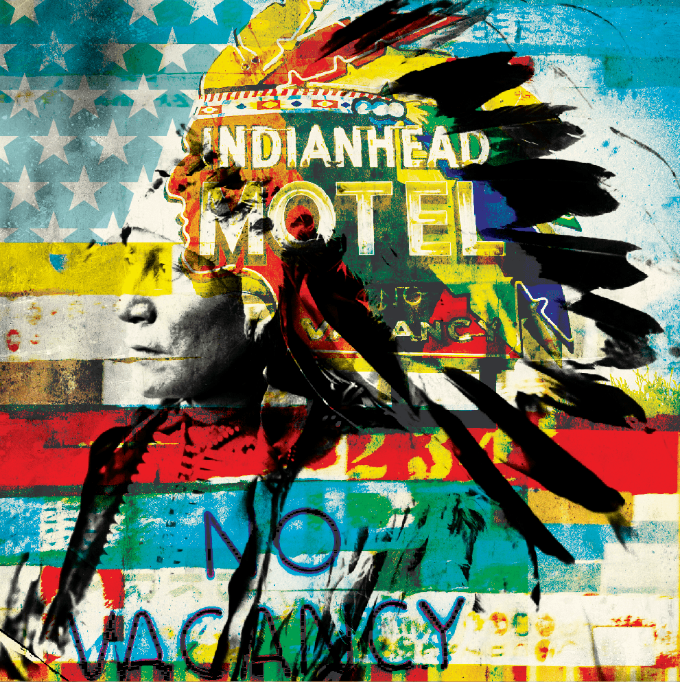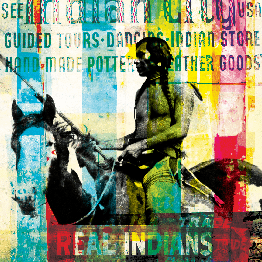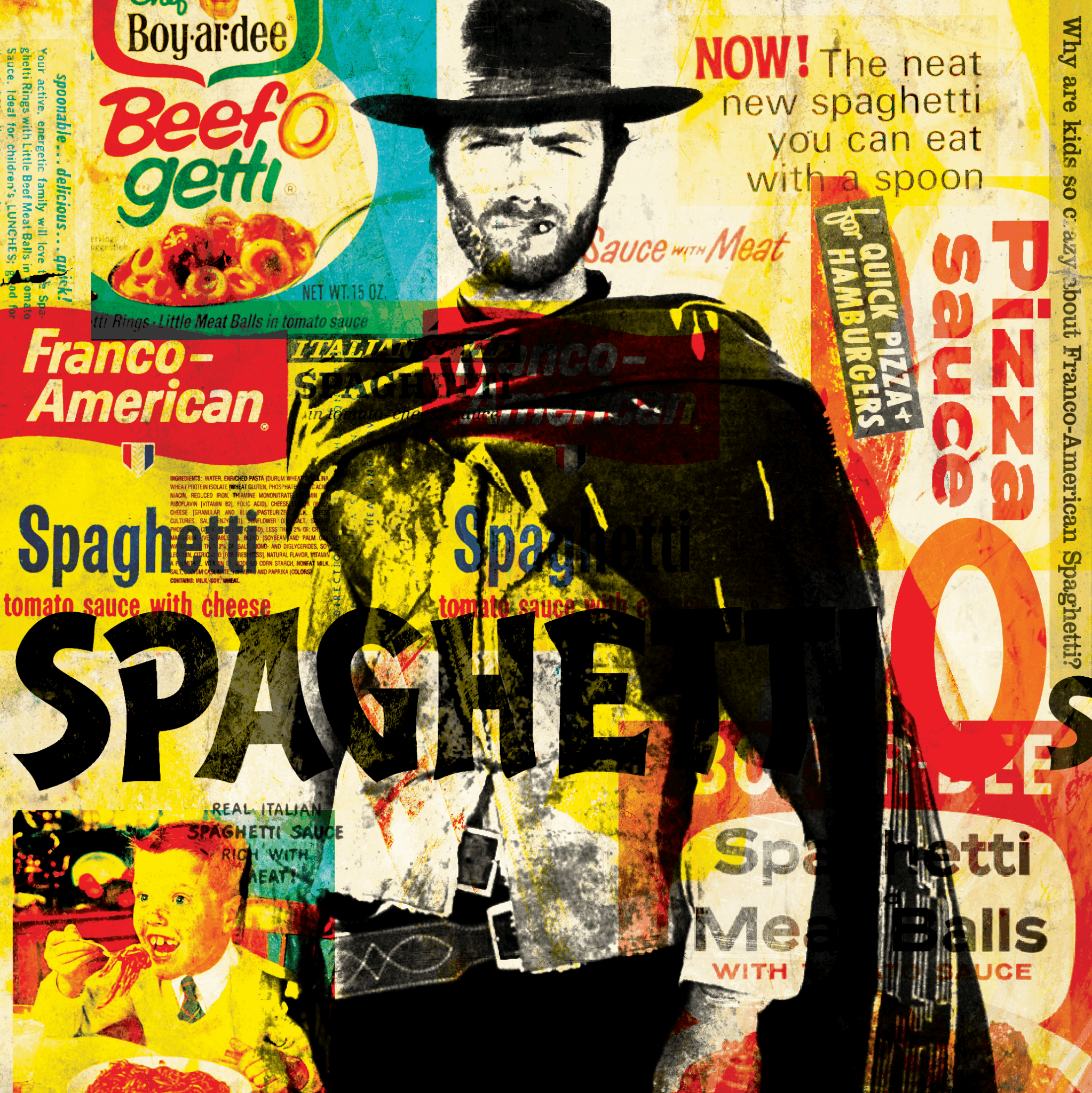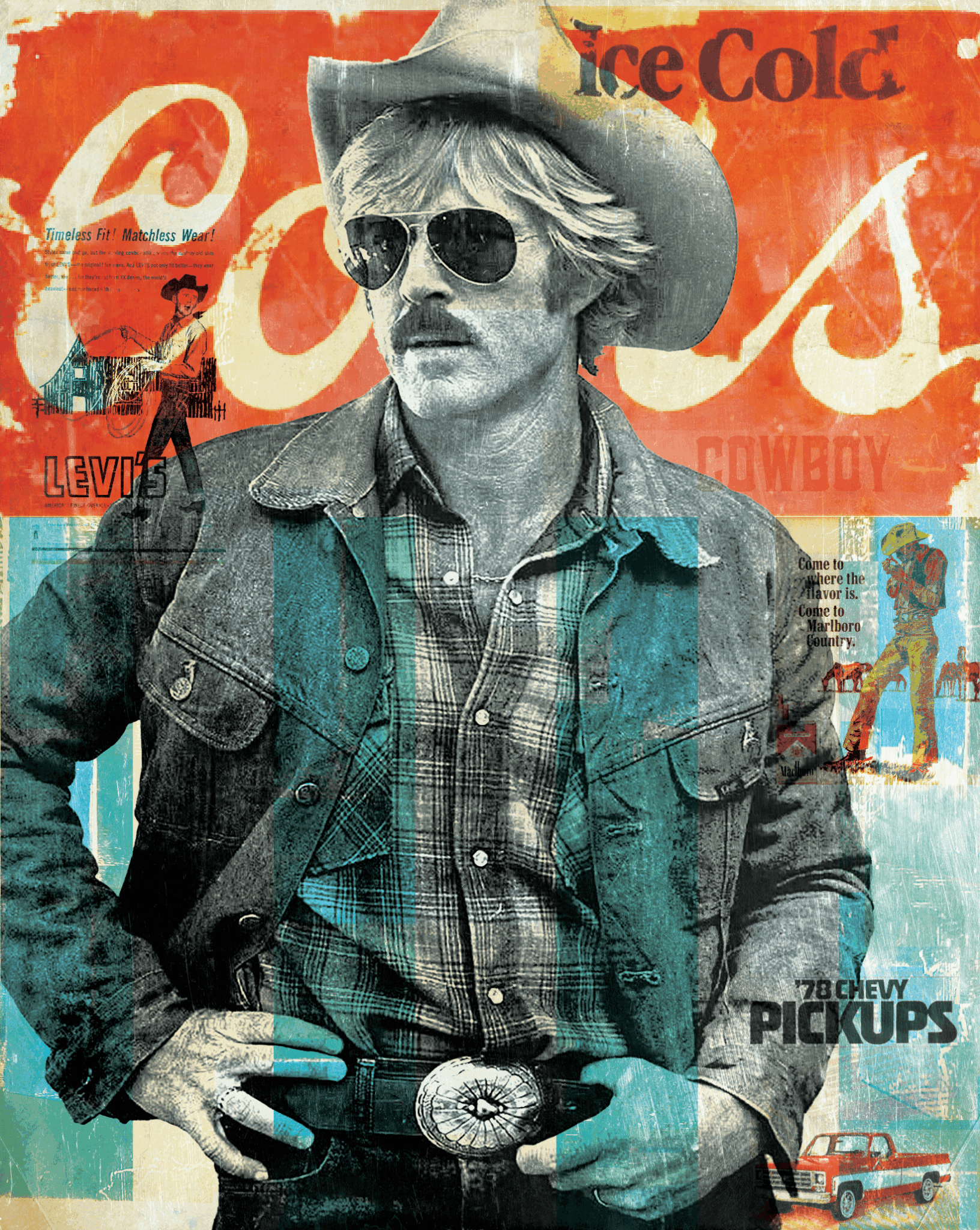 I work in mixed media collage, using imagery pulled from American popular culture—vintage advertising, typography, logos, Western archetypes, comics, pulp, roadside imagery. These are things most people recognize on some level, even if they can’t immediately place them.