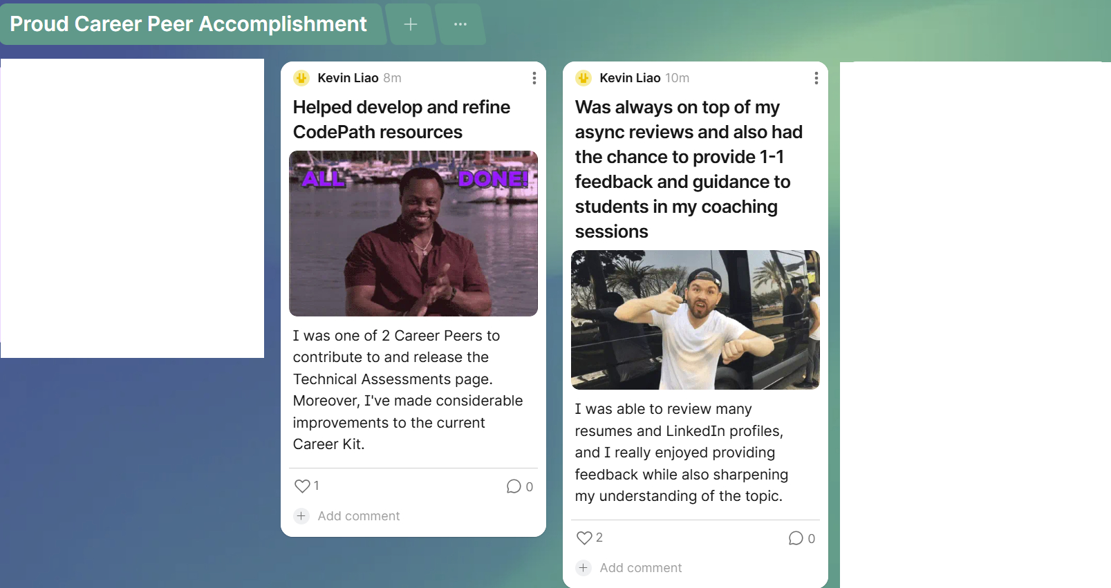 As my reputation grew, so did my network, introducing me to peers and mentors, including experienced software engineers whose guidance has been invaluable. Furthermore, my role as a Career Peer at CodePath, a non-profit committed to increasing diversity in tech, allowed me to provide tailored advice to hundreds of students. The positive feedback I’ve received, such as helping one student secure four summer 2024 software engineering internships, further solidifies the impacts of my contributions.
